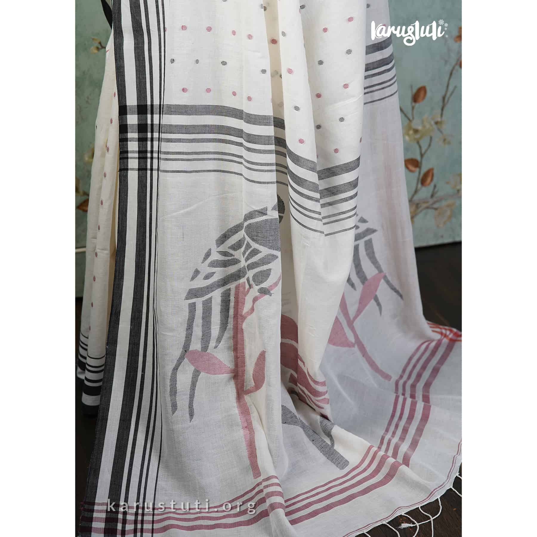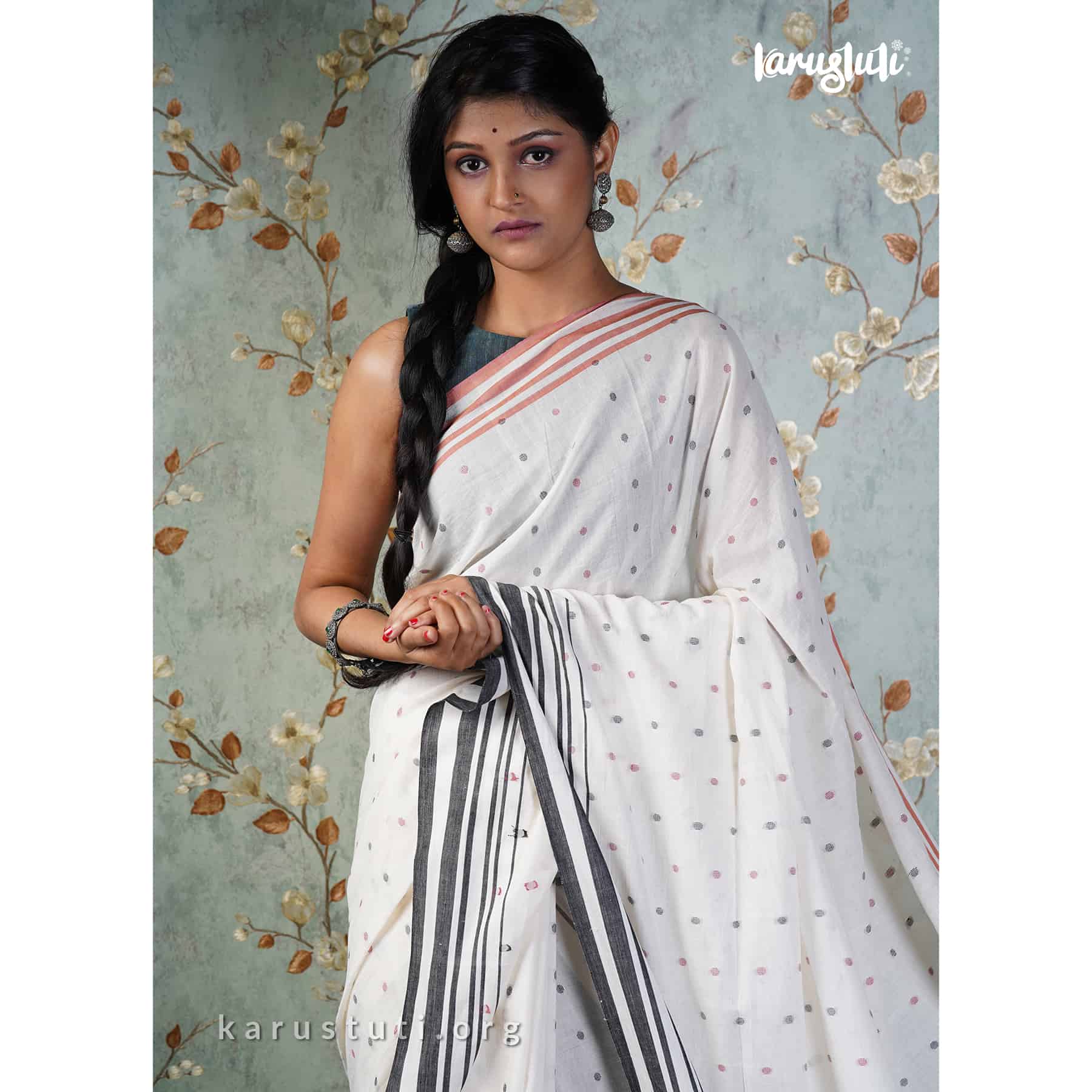 Soft handspun cotton body buta and jamdani pallu. Handmade breathable classy drape for all occasions.