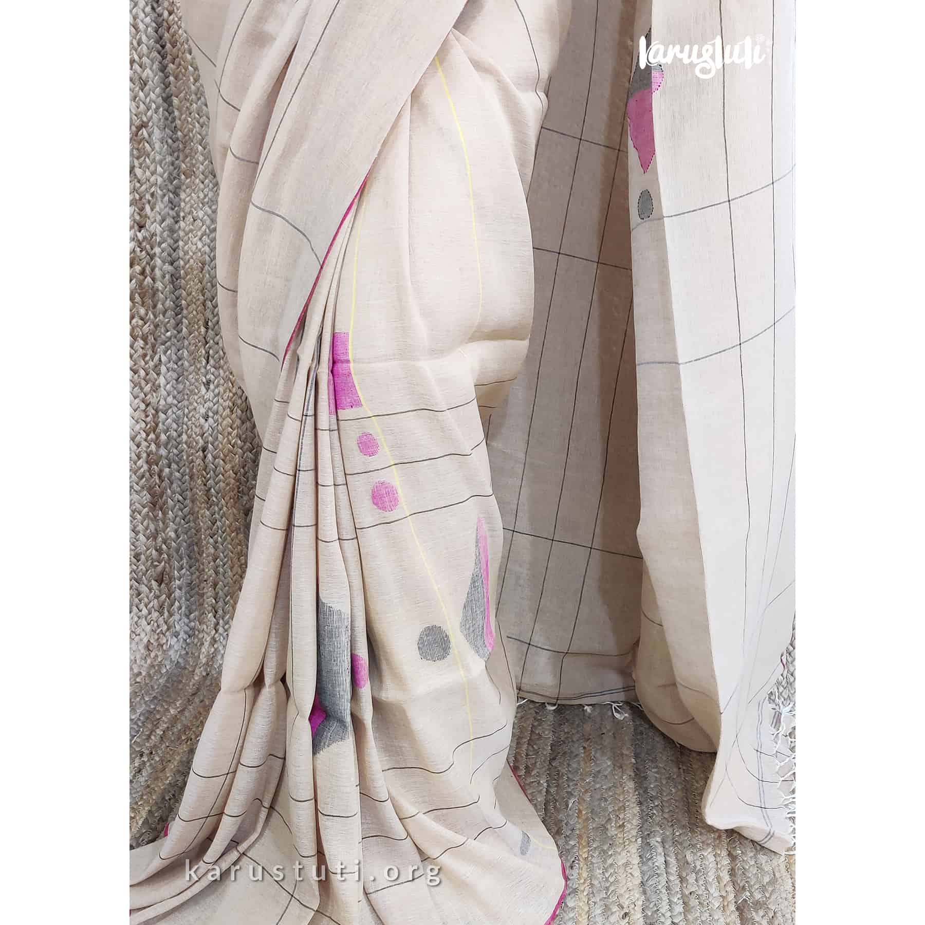 Soft handspun cotton with handwoven jamdani mottif with pallu. Handmade breathable classy drape for daily wear.