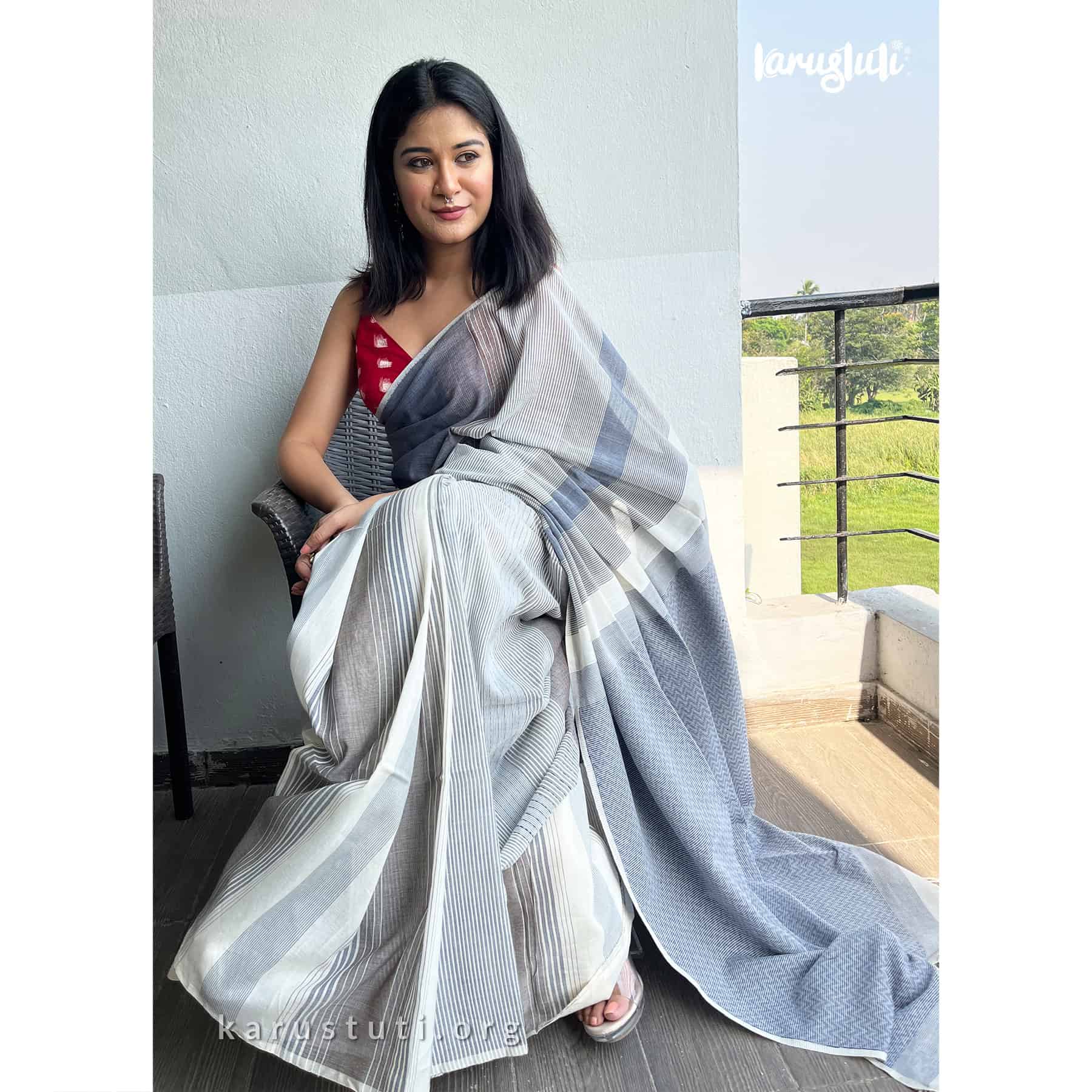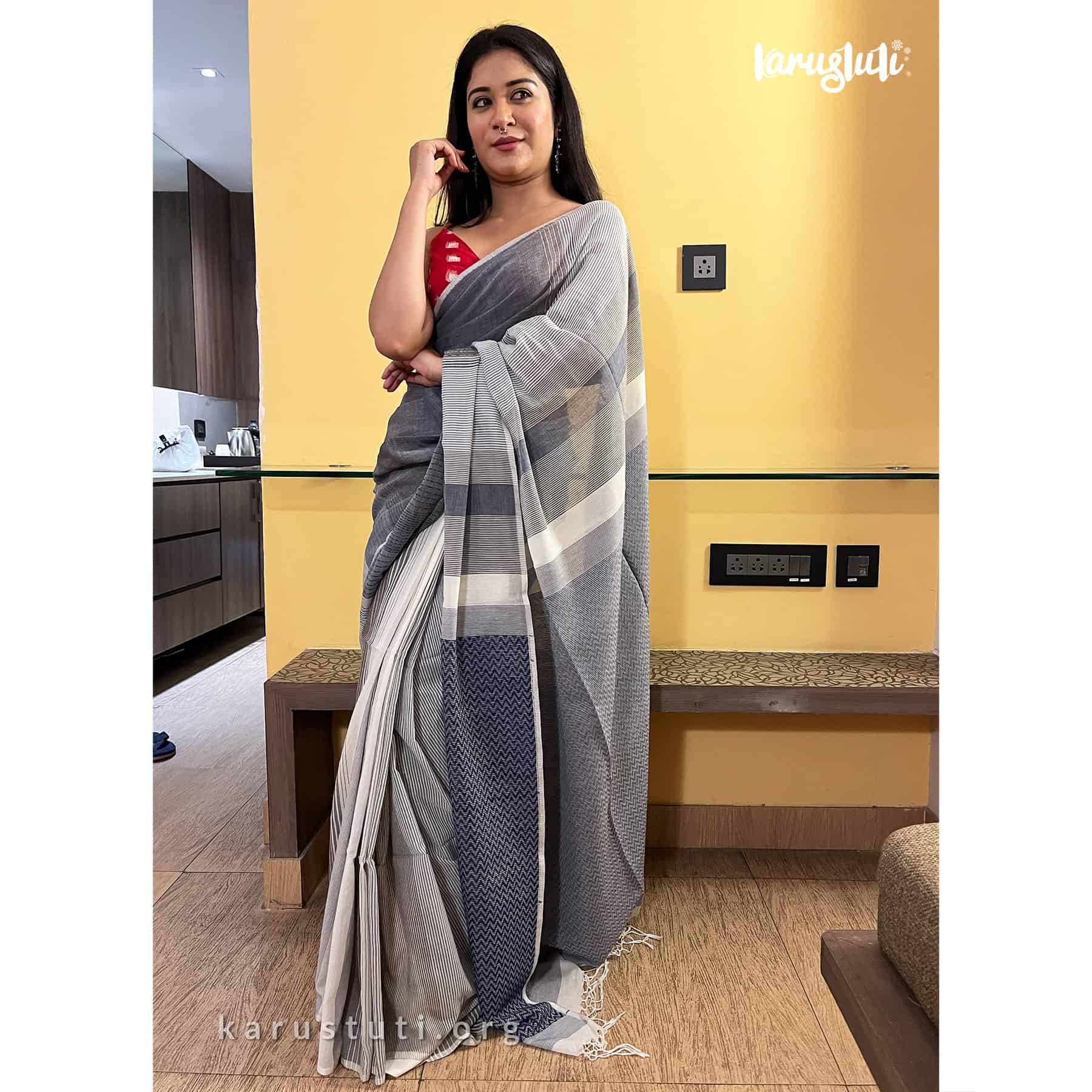 Soft handspun cotton jacquard weaving all over the saree has non repeated woven stripes and geometric mottif in pallu.. Handmade breathable classy drape for all summer occasions. this saree took 4-5 days to complete. AZO PCP free color. Premium quality cotton handloom saree.