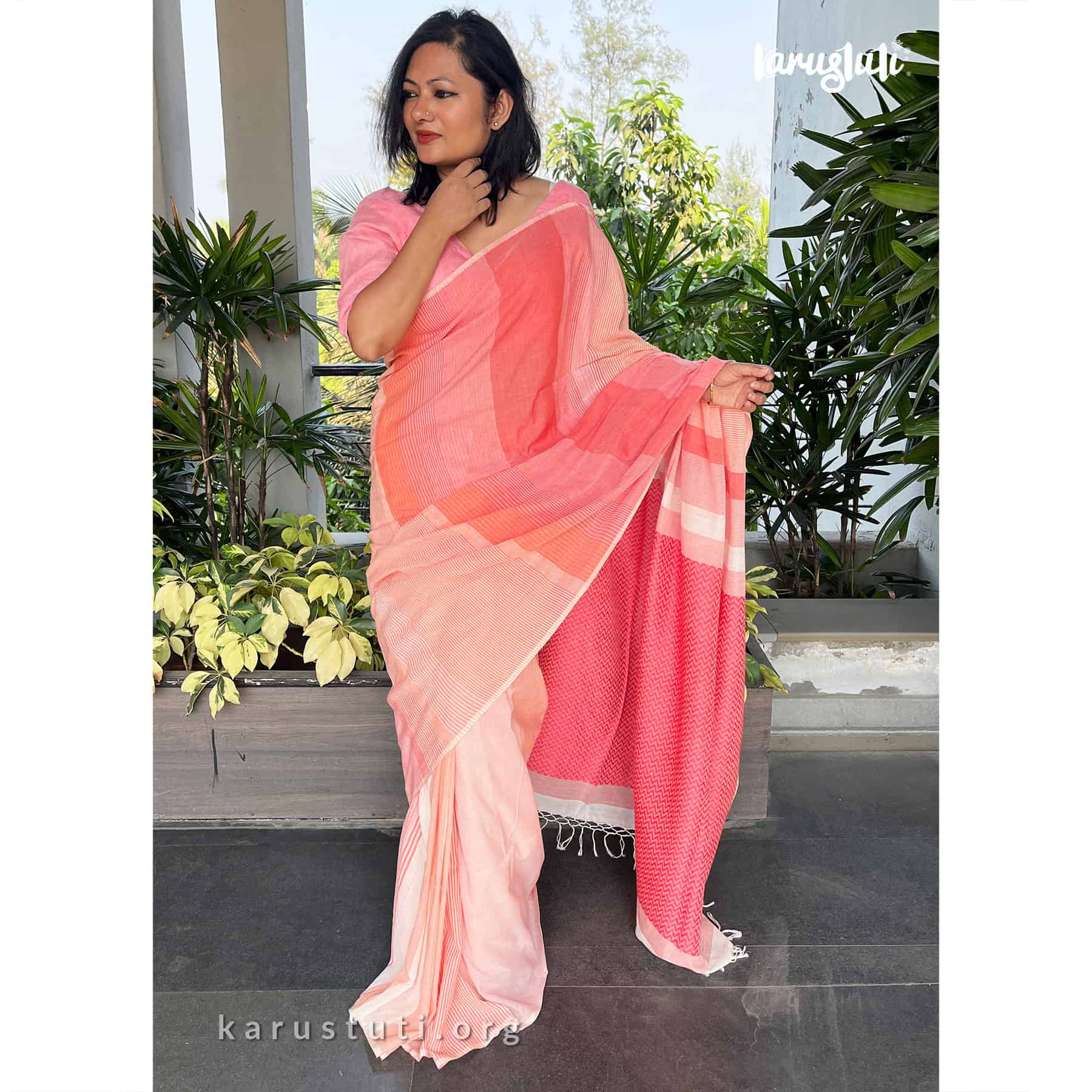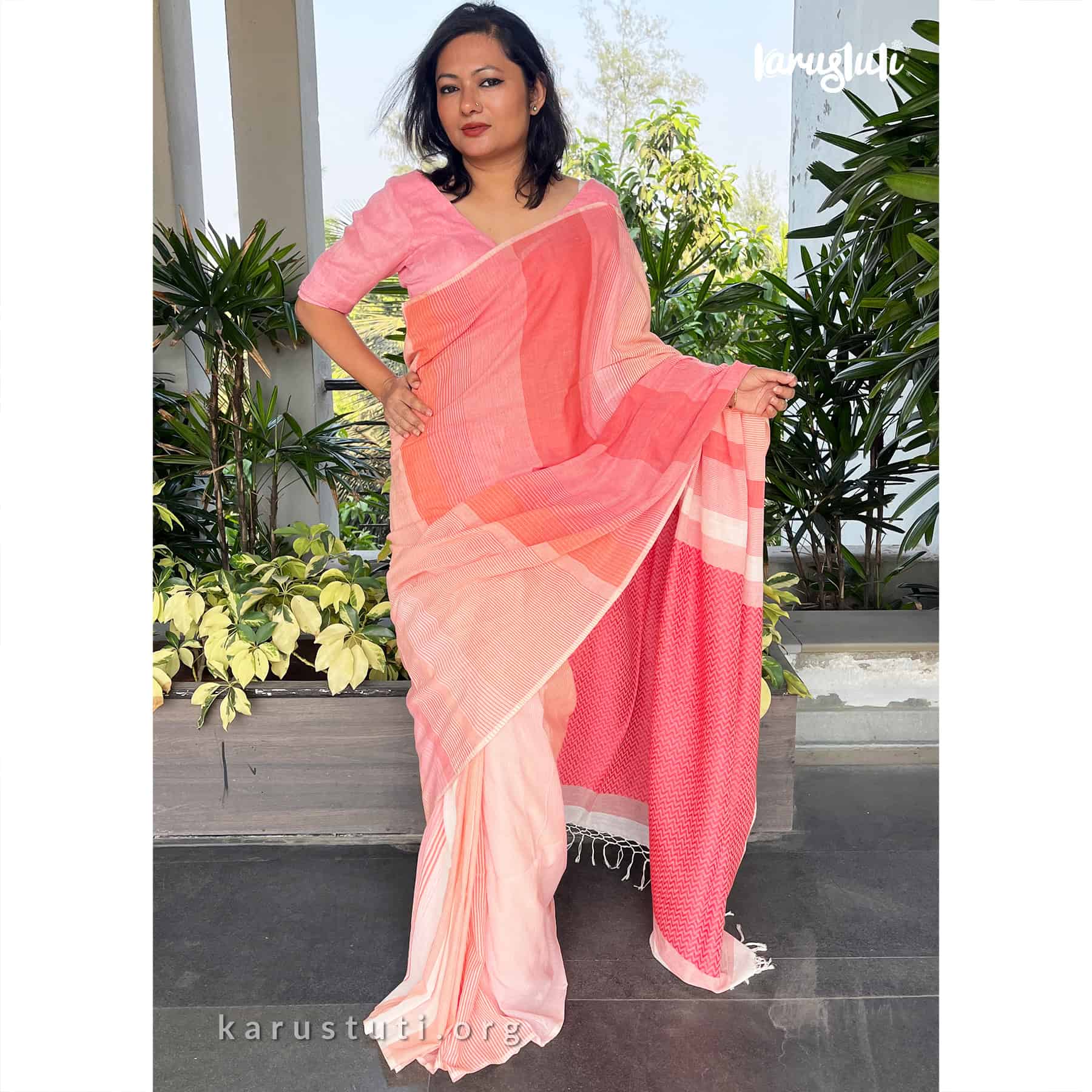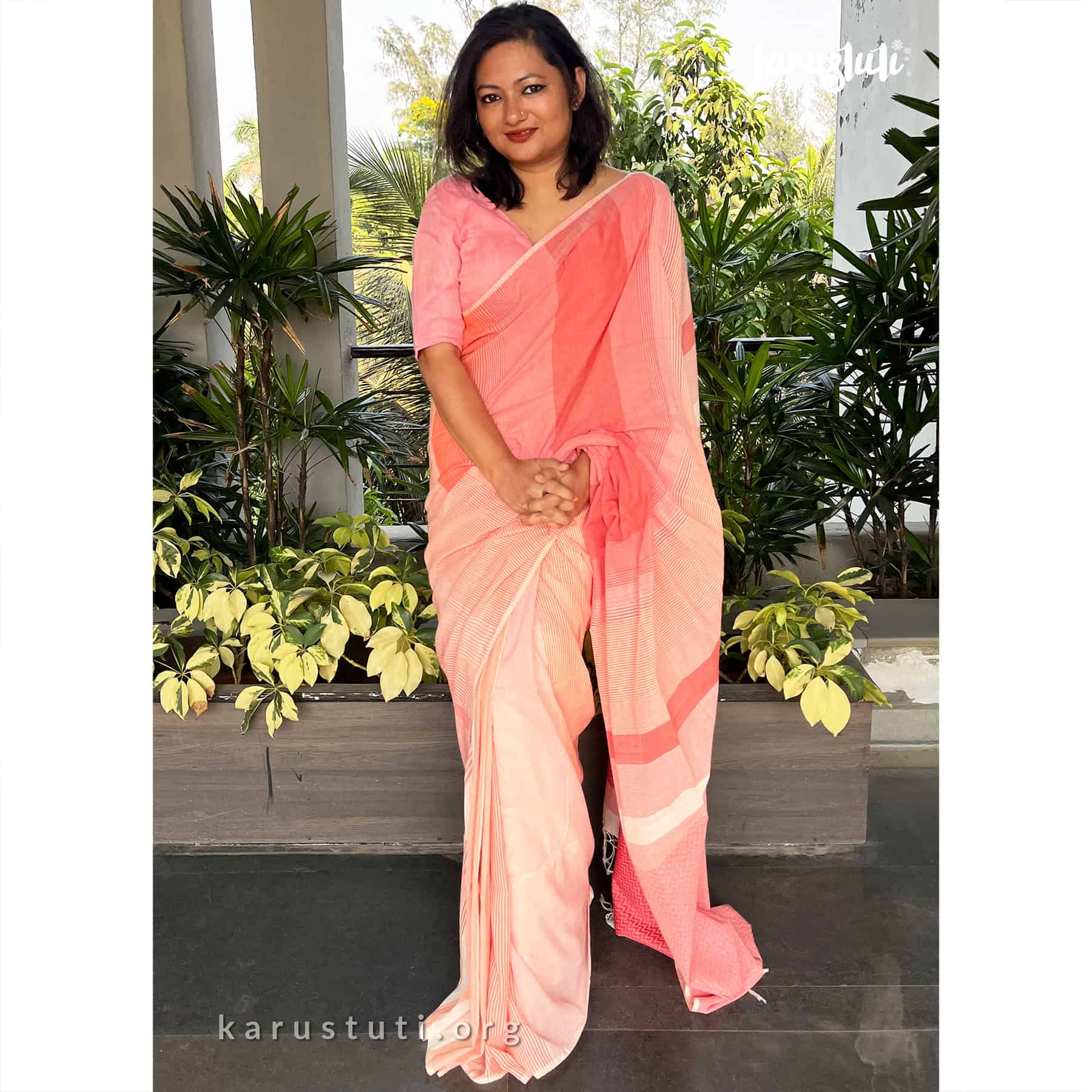Soft handspun cotton jacquard weaving all over the saree has non repeated woven stripes and geometric mottif in pallu.. Handmade breathable classy drape for all summer occasions. this saree took 4-5 days to complete. AZO PCP free color. Premium quality cotton handloom saree.