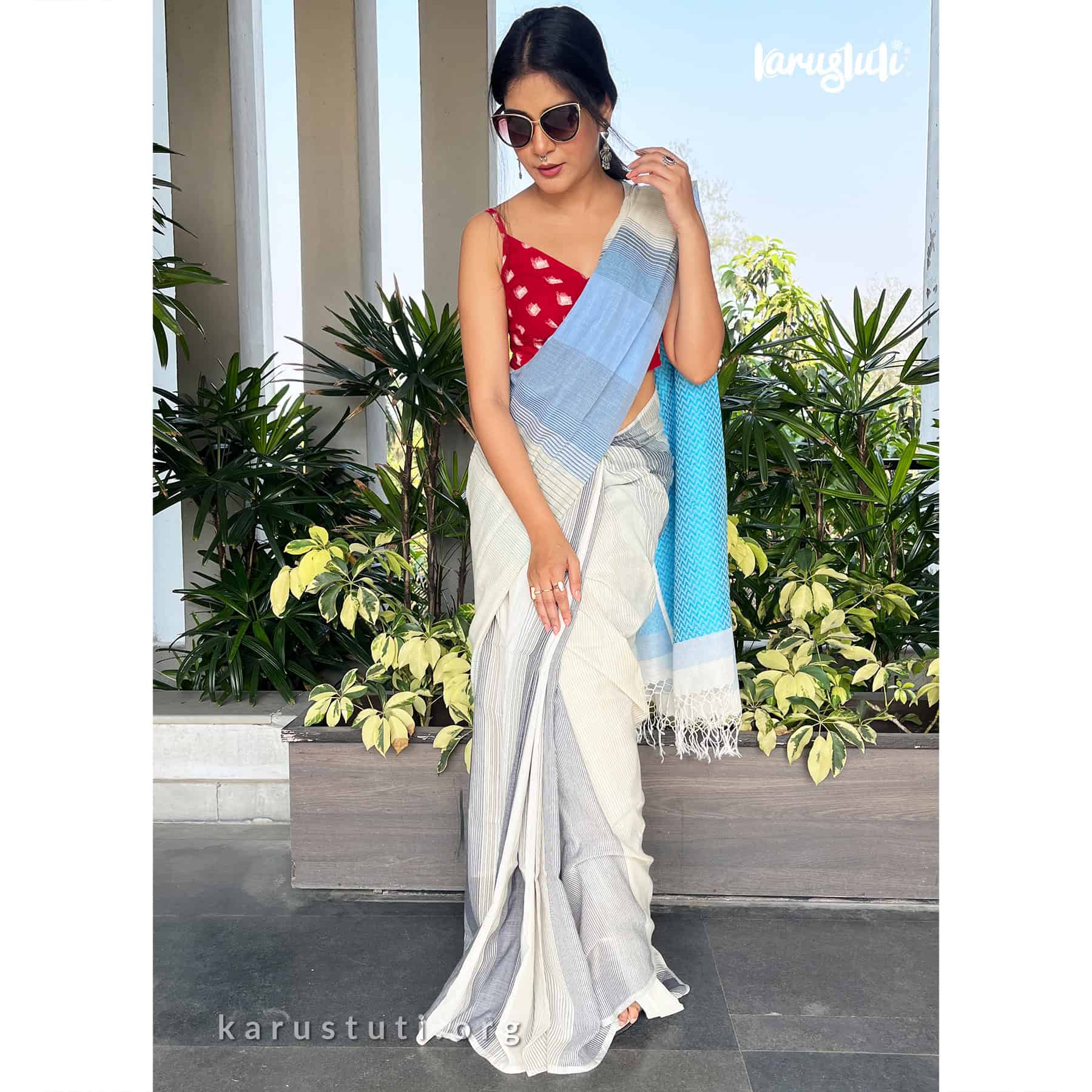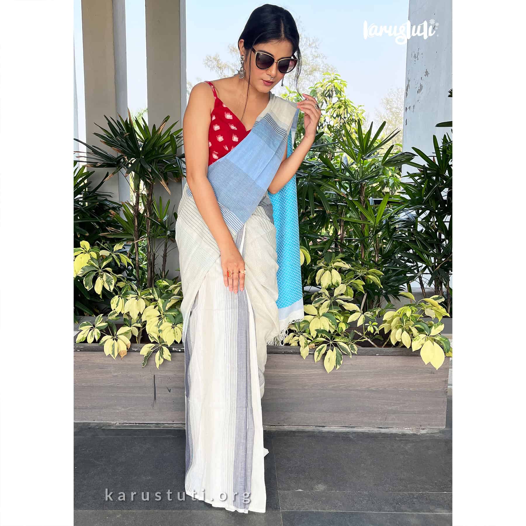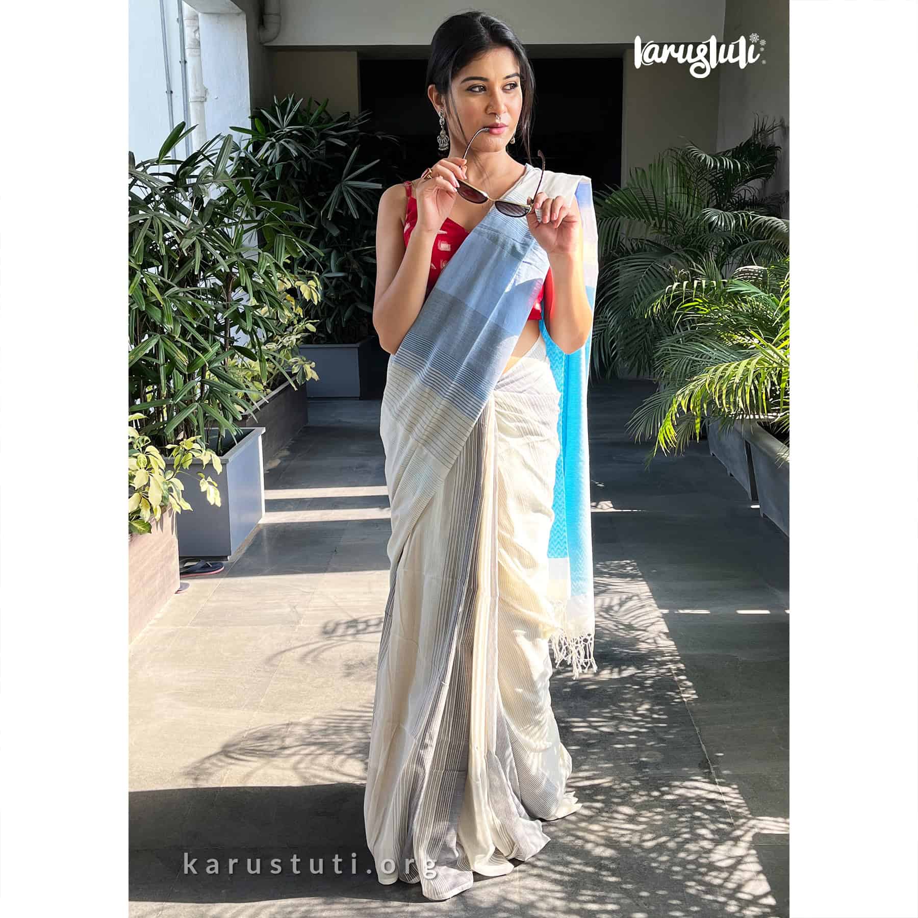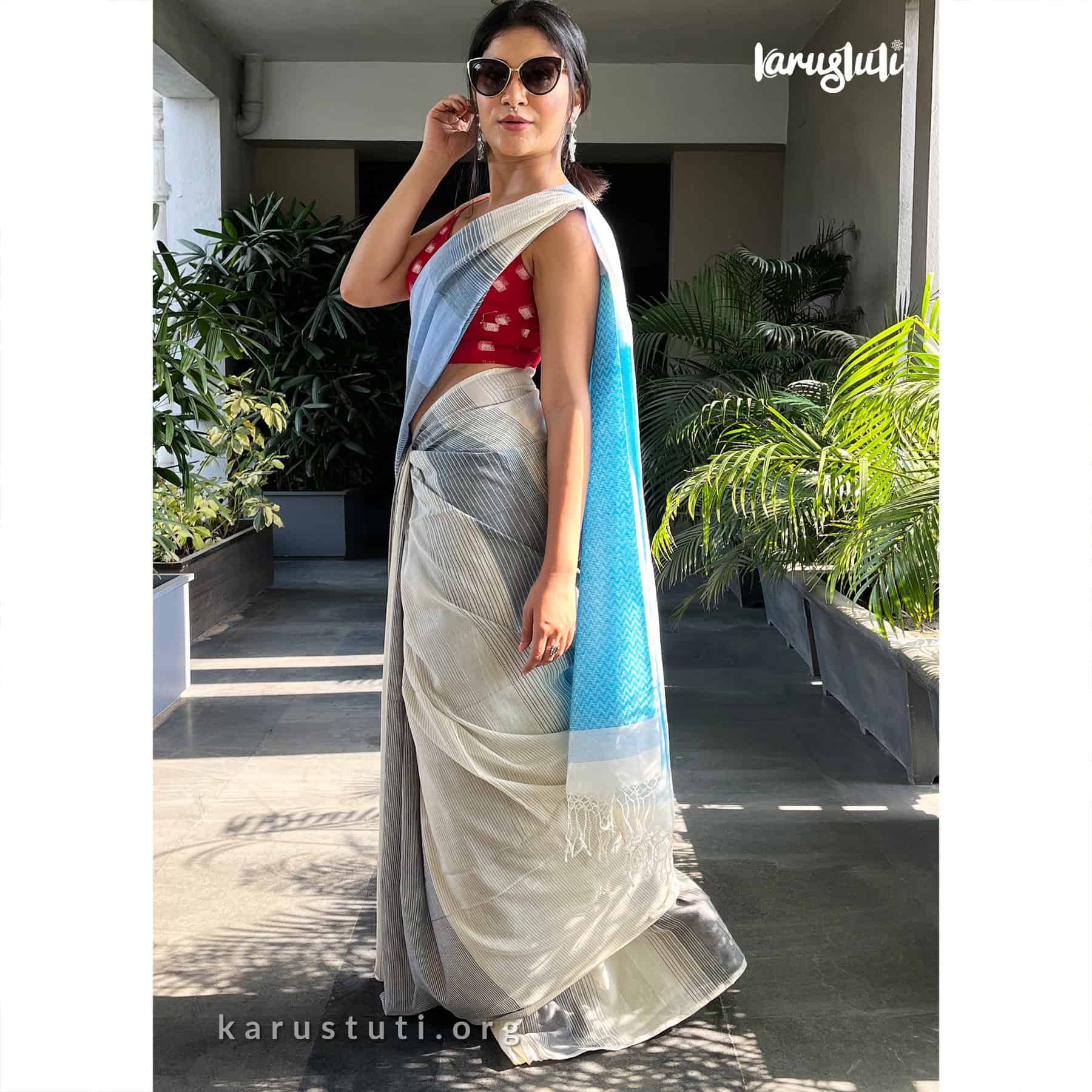 Soft handspun cotton jacquard weaving all over the saree has non repeated woven stripes and geometric mottif in pallu.. Handmade breathable classy drape for all summer occasions. this saree took 4-5 days to complete. AZO PCP free color. Premium quality cotton handloom saree.