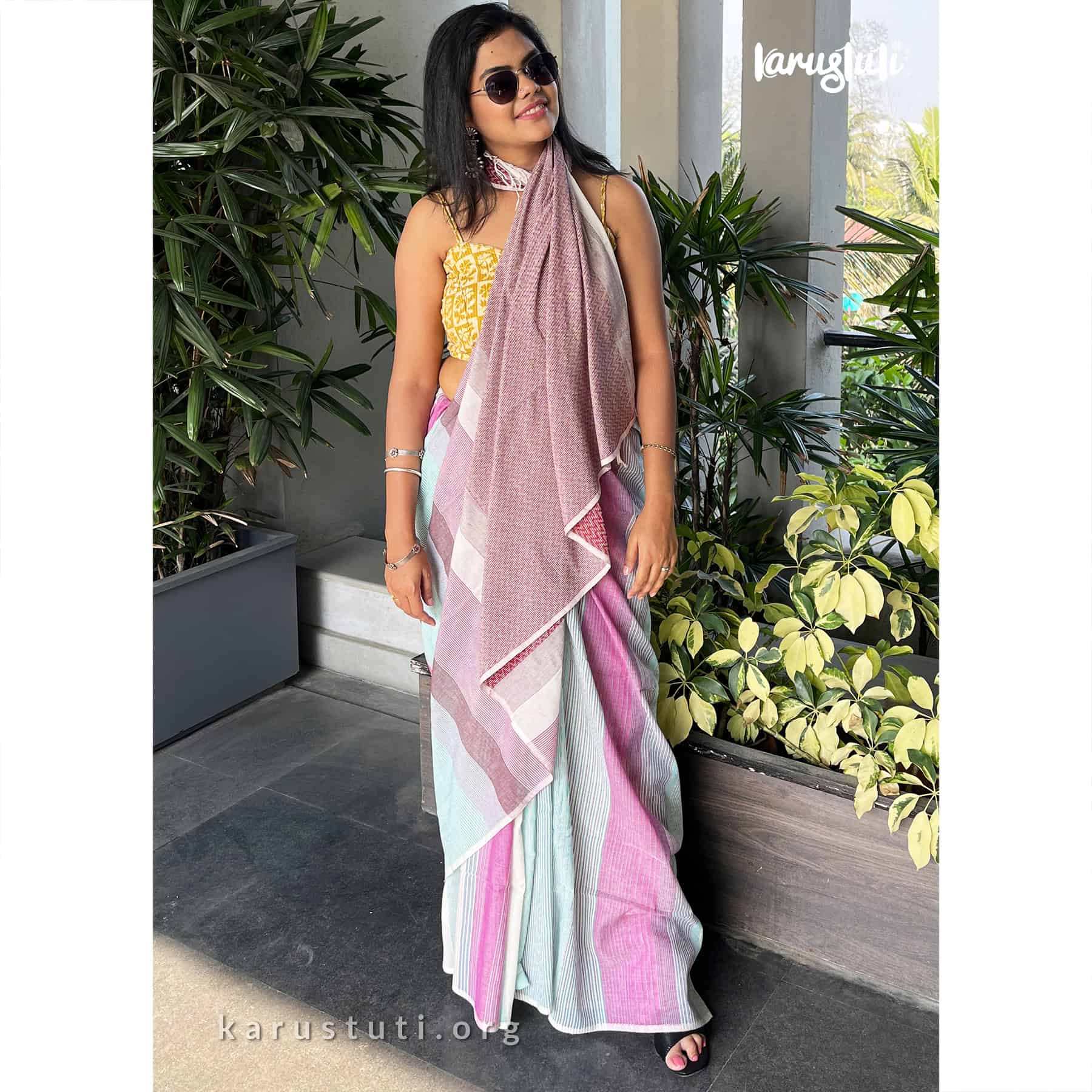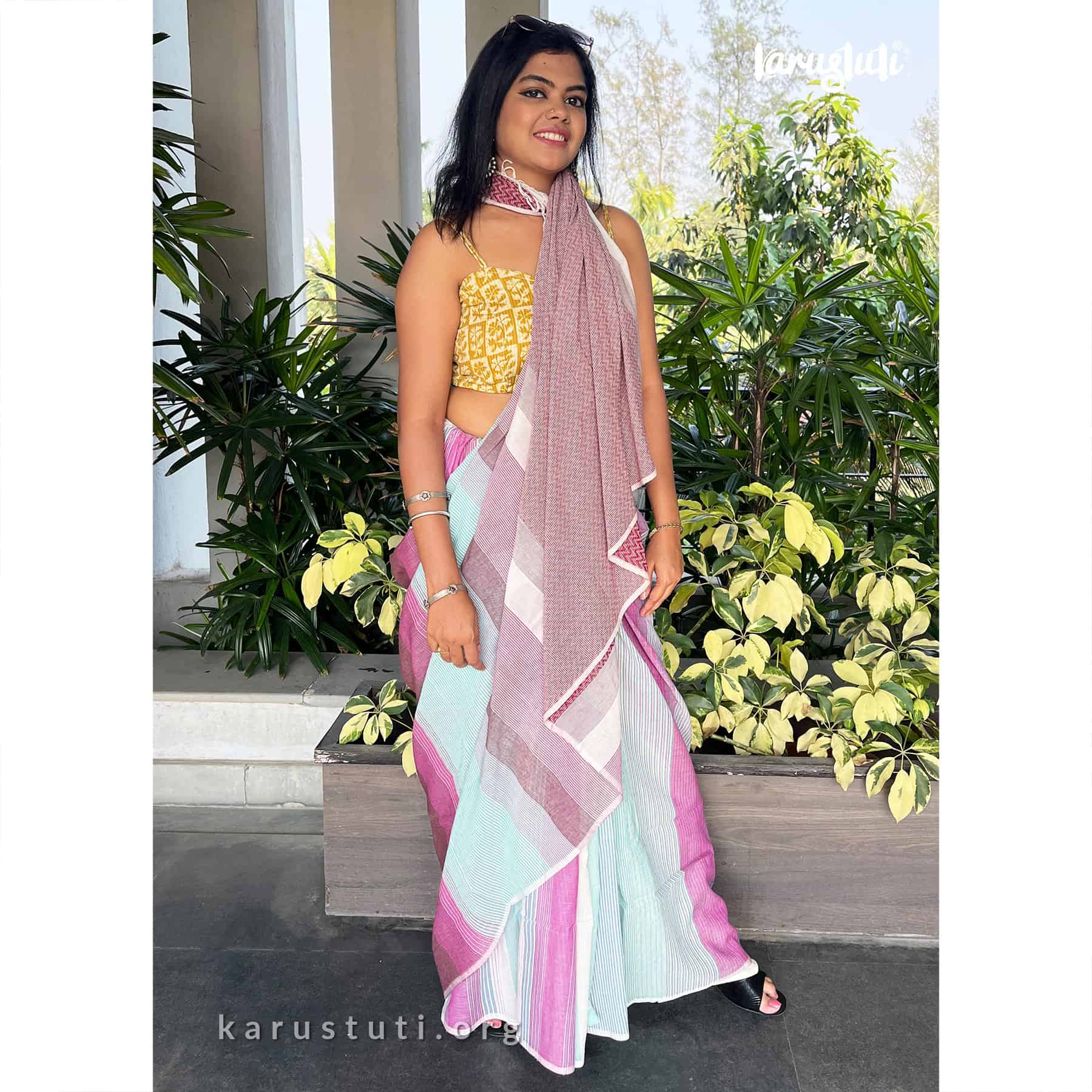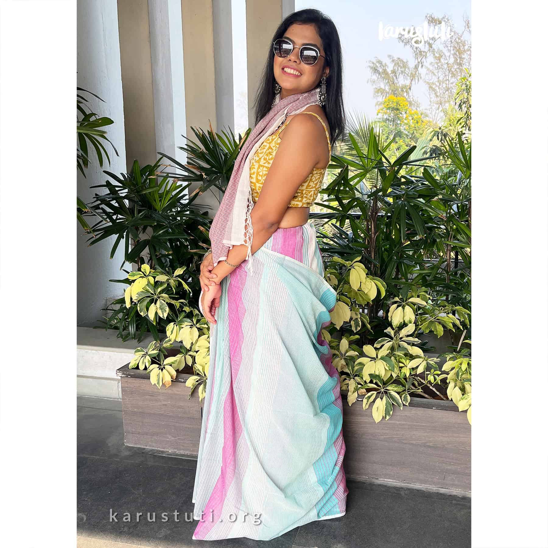 Soft handspun cotton jacquard weaving all over the saree has non repeated woven stripes and geometric mottif in pallu.. Handmade breathable classy drape for all summer occasions. this saree took 4-5 days to complete. AZO PCP free color. Premium quality cotton handloom saree.