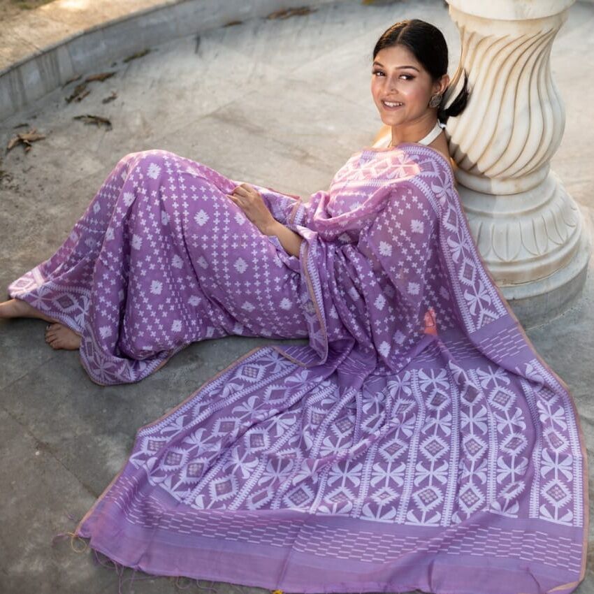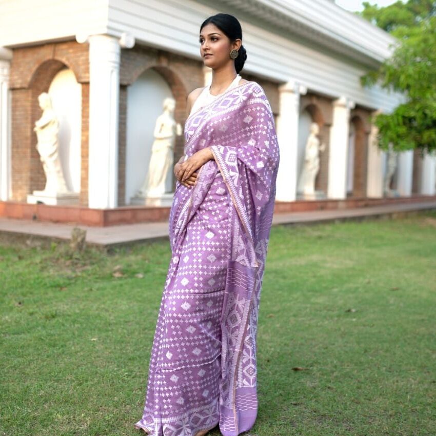 Handspun Cotton 100/84 With Handwoven Jamdani Work On That.Handspun handwoven jamdani. Beautiful lilac shade. This saree take 73 days to complete. Traditional jamdani by Weaver of Bangal