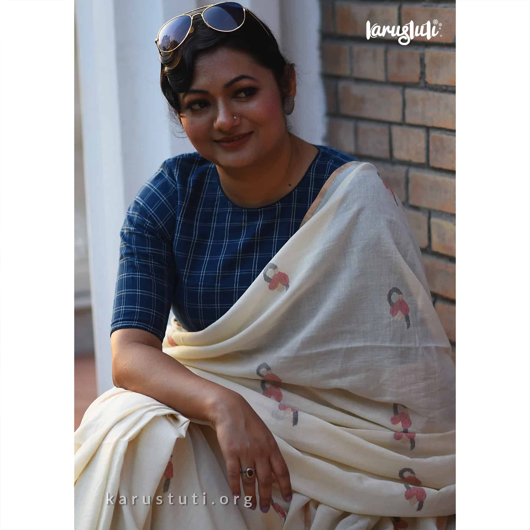 Traditional handspun cotton handwoven jamdani saree. Rich textile weaving of Bengal. Handspun cotton with floral buta weaved saree takes 5 days ro complete. Best for regular saree admirers.