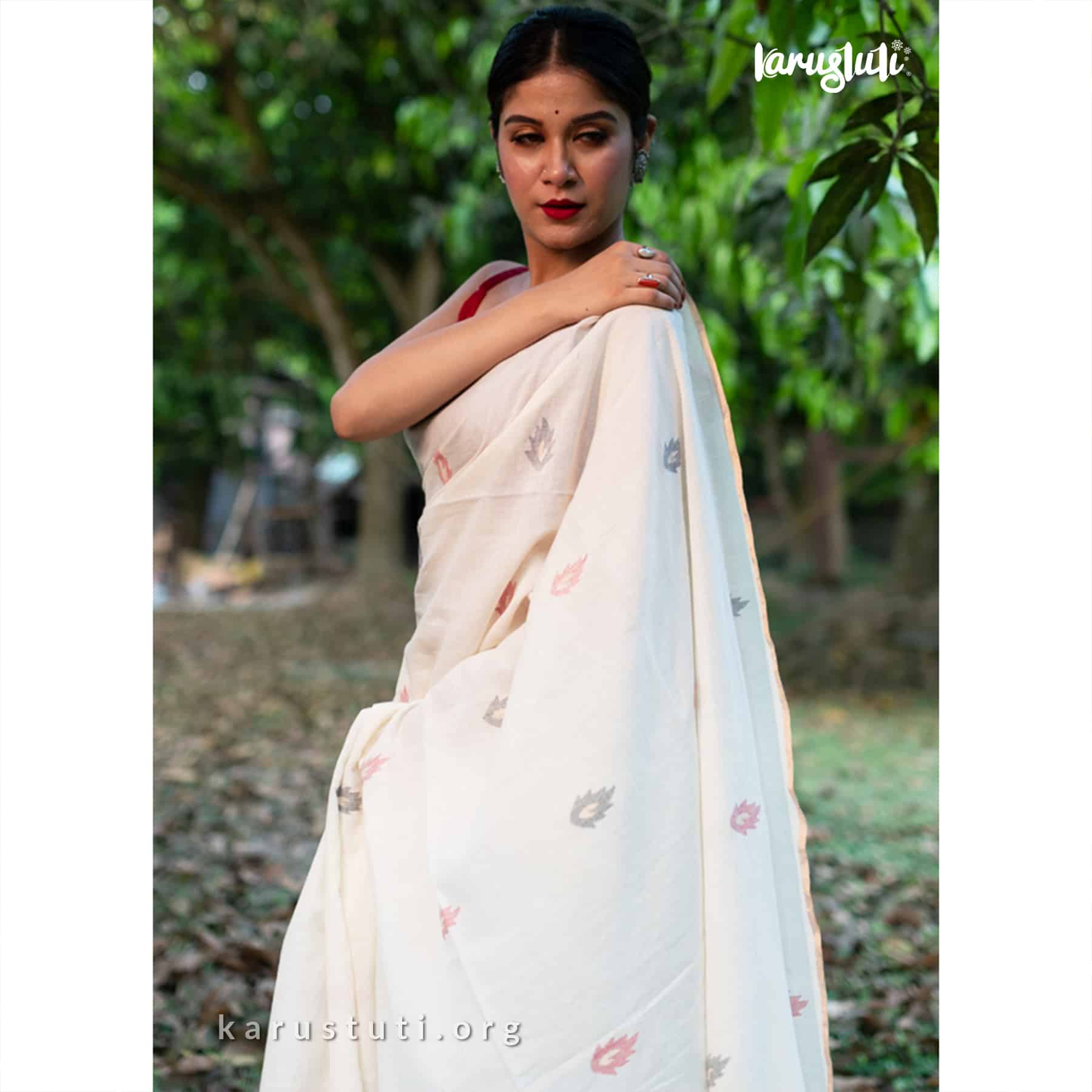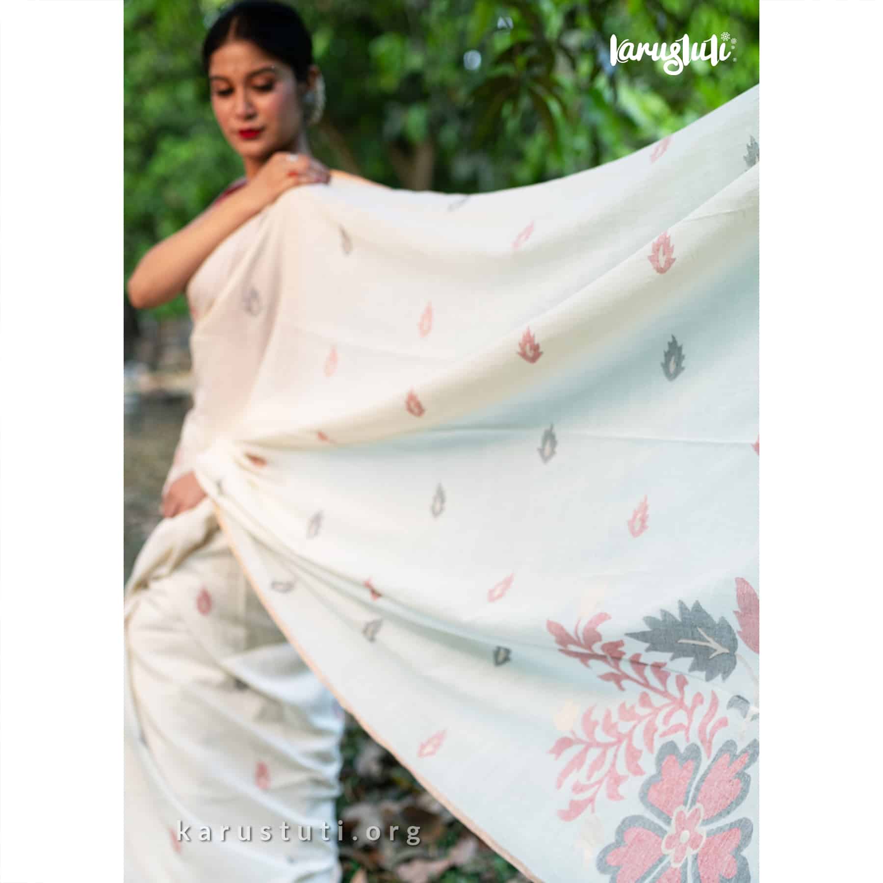 Traditional handspun cotton handwoven jamdani saree. Rich textile weaving of Bengal. Handspun cotton with floral buta weaved and jamdani floral naksha in pallu. this saree takes 7 to 8 days to complete. Best for regular saree admirers.