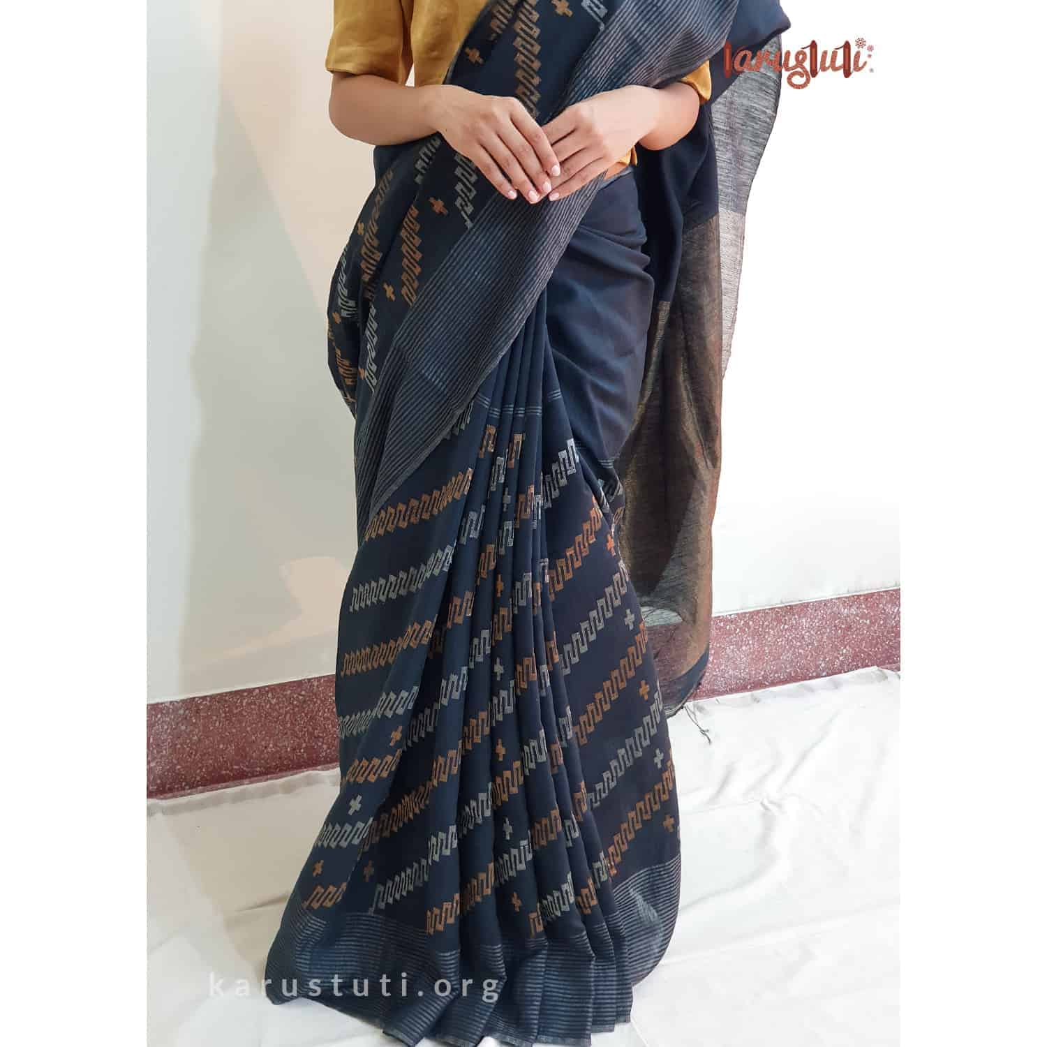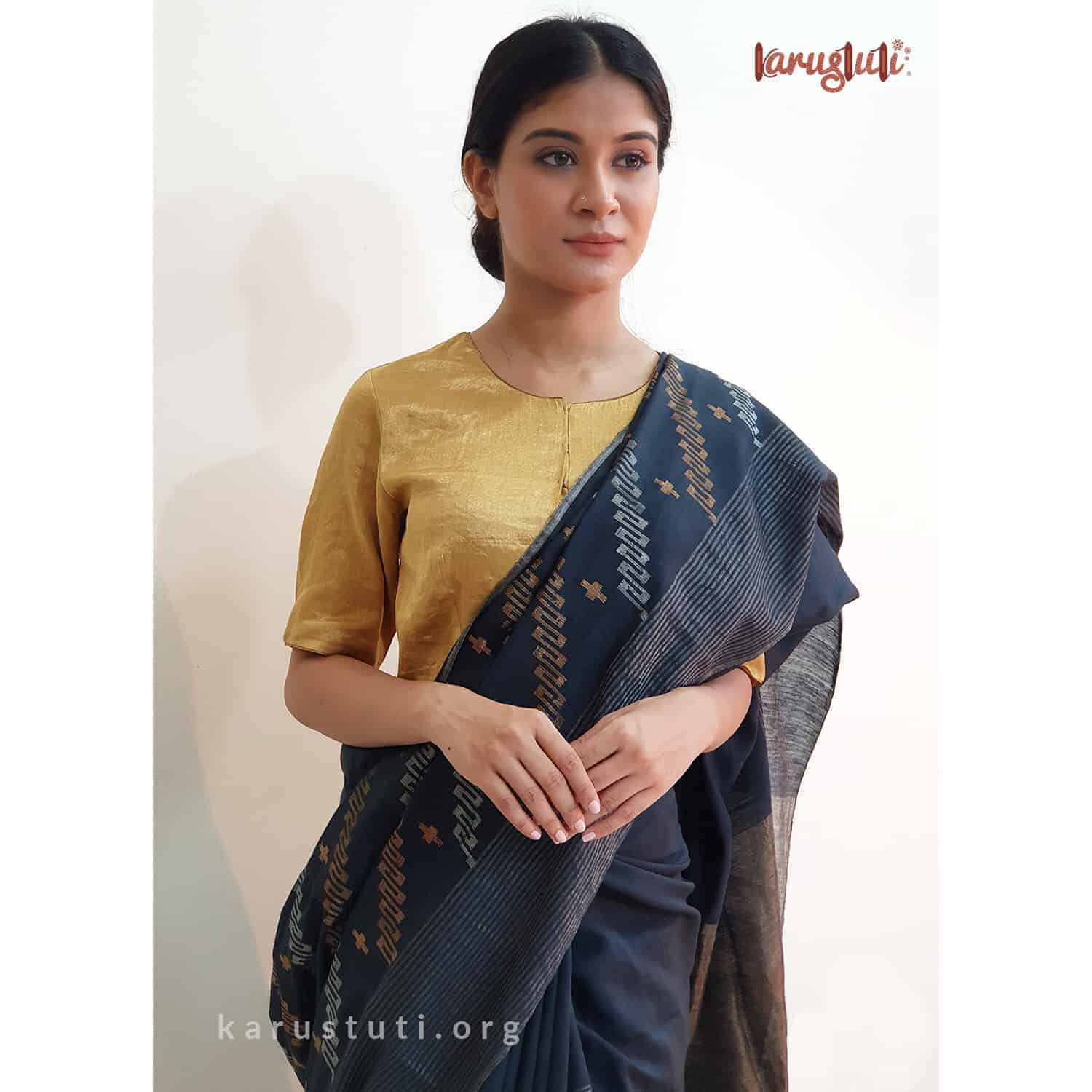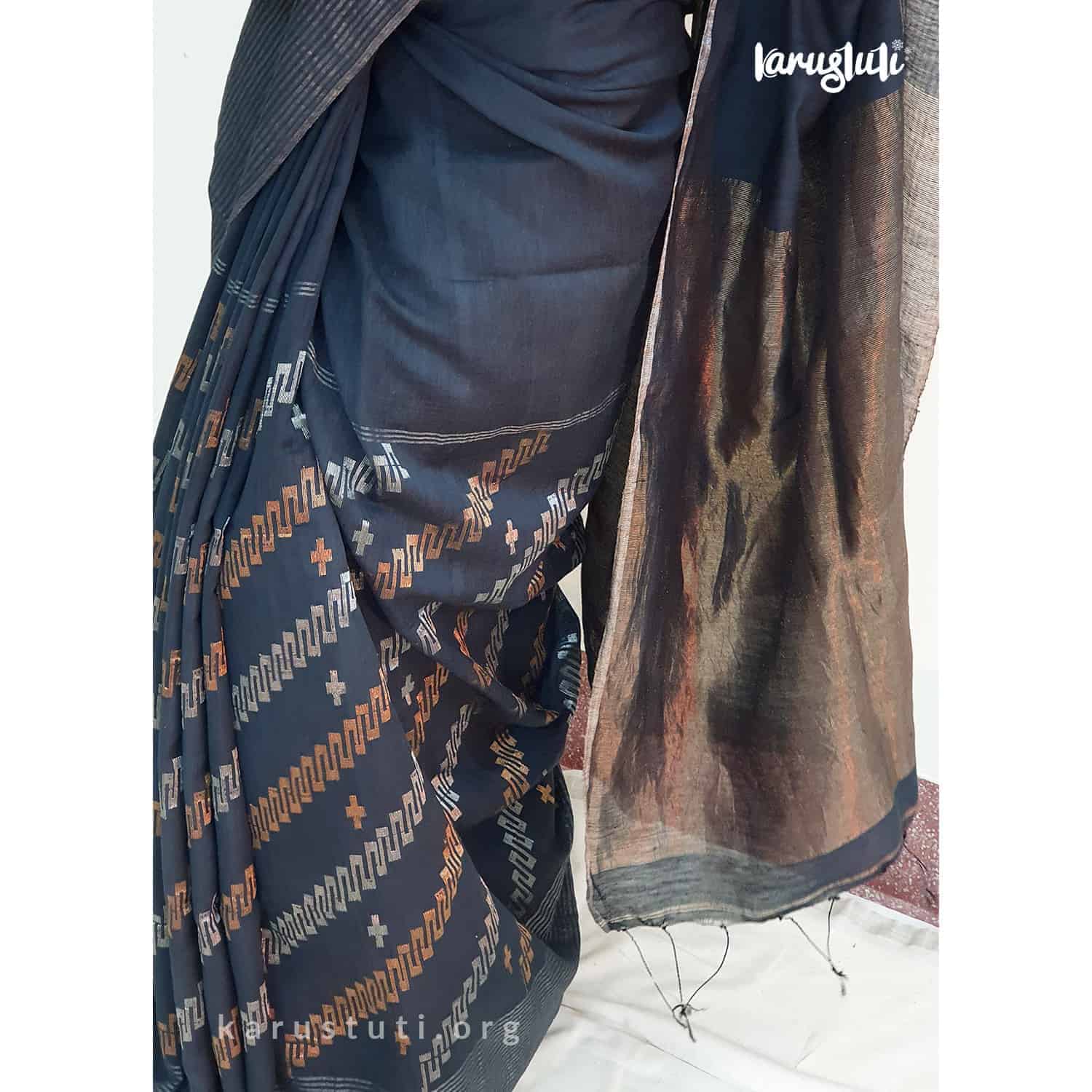 Elevate your ethnic wardrobe with the exquisite Karustuti Handwoven Muslin Jamdani Saree in a timeless black hue. Crafted from luxurious muslin, this handloom masterpiece showcases intricate jamdani weaves that reflect both tradition and sophistication. With a generous length of 6.5 meters, it drapes beautifully, offering versatility for any occasion. The accompanying running blouse piece allows for seamless customization to match your personal style. Designed for modern elegance while honoring age-old craftsmanship, this saree is an essential addition to your collection. To maintain its beauty, opt for dry cleaning care. Experience the allure of heritage woven into every thread—make the Karustuti Handwoven Muslin Jamdani Saree yours today and celebrate the art of Indian weaving!