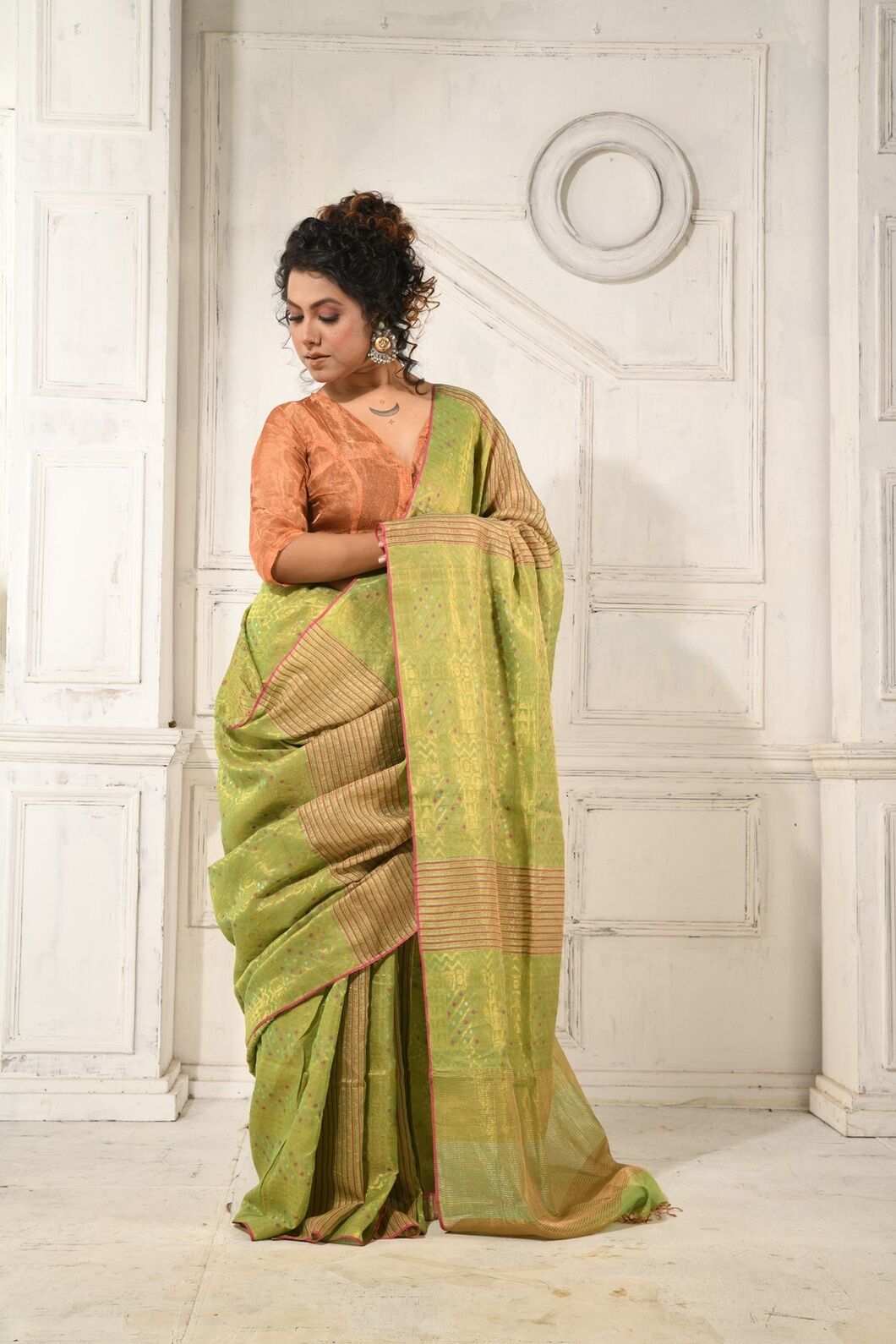 Karustuti Leaf Green Metallic Jacquard Handloom Saree