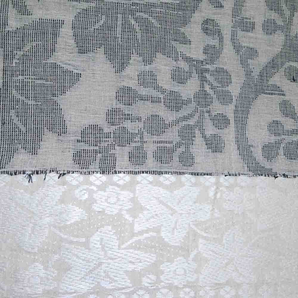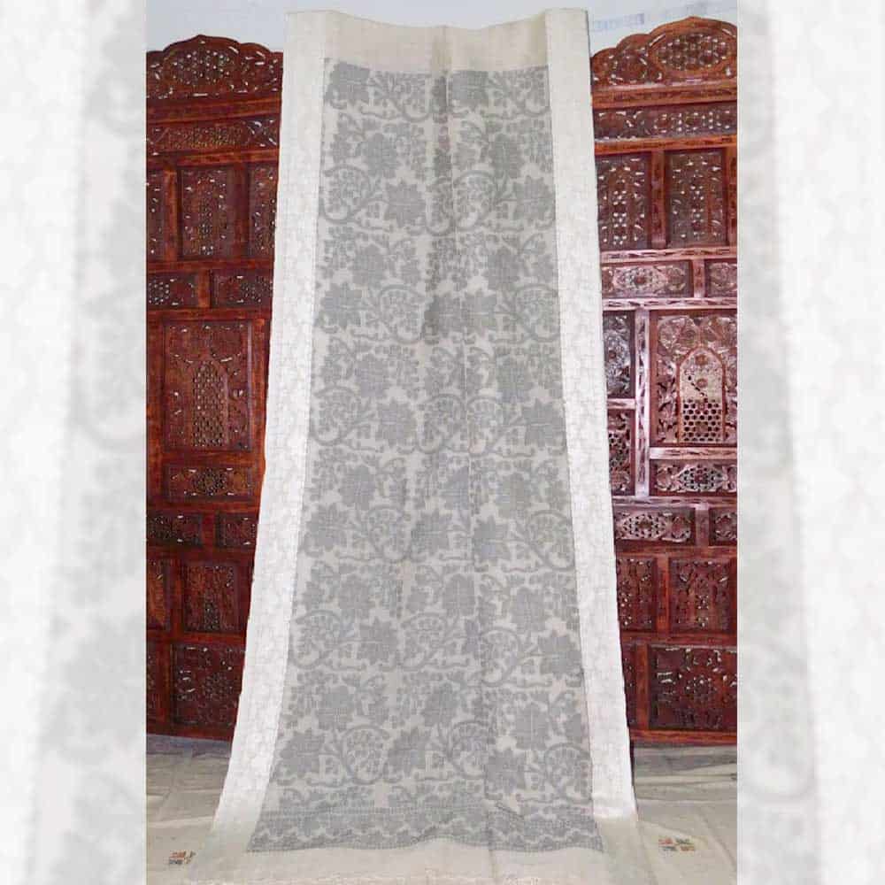 80cnt linen with floral hand jacquard jamdani weaving with thread, woven wide border, half and half design floral motif jamdani, this handloom Saree takes 15 to 17 days to complete. Rich AZO & PCP tested color non-allergic thread provides a rich look, an ultimate party, and traditional wear. Starch not required.