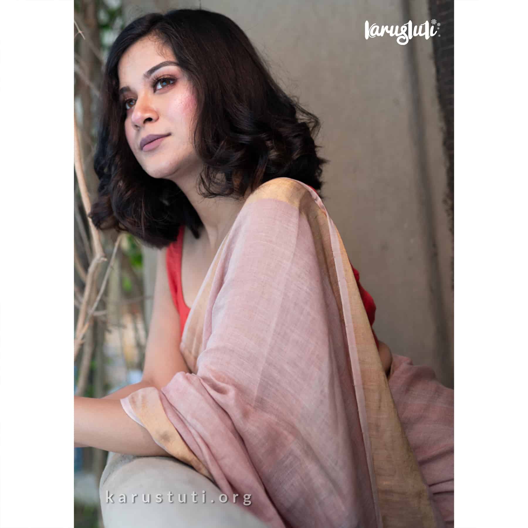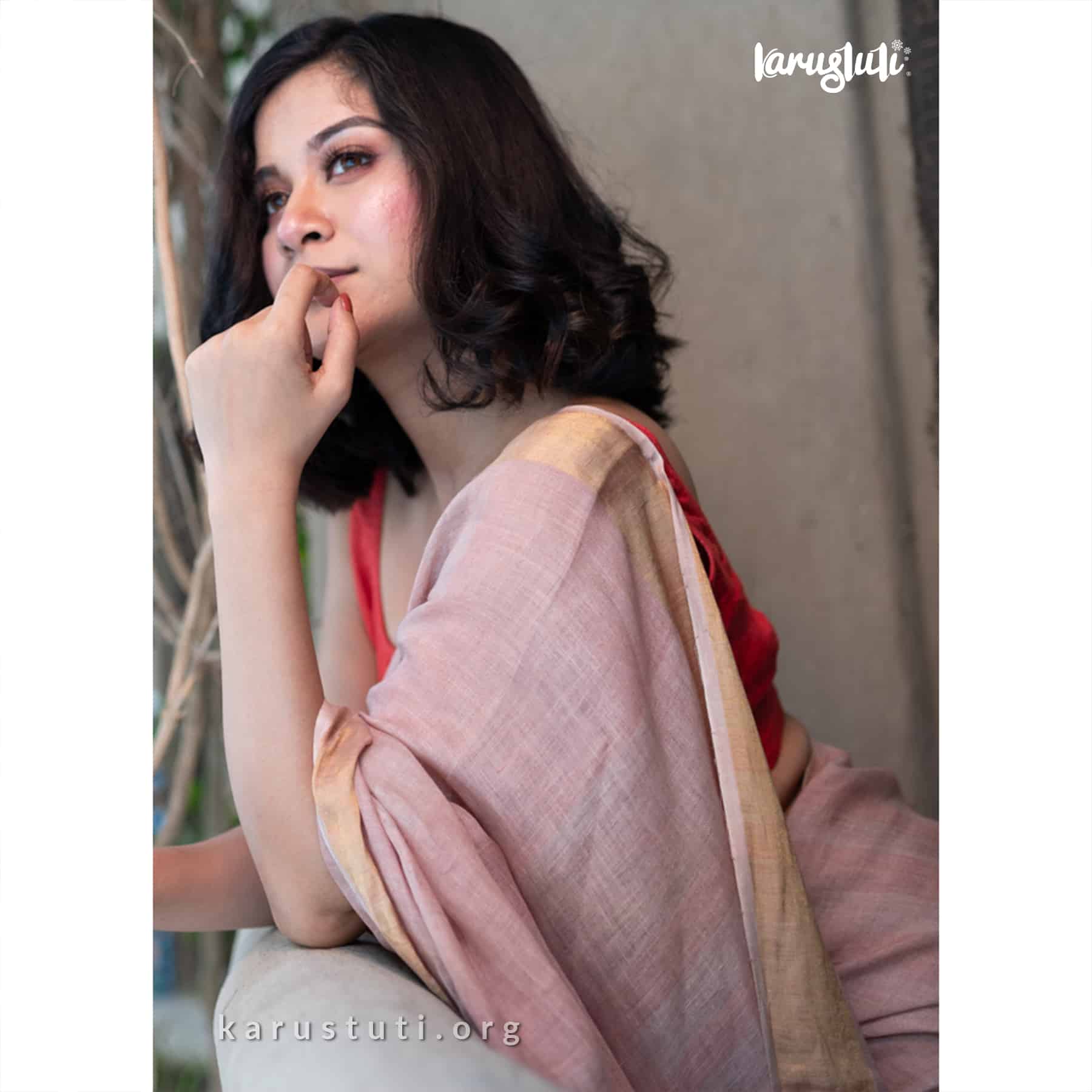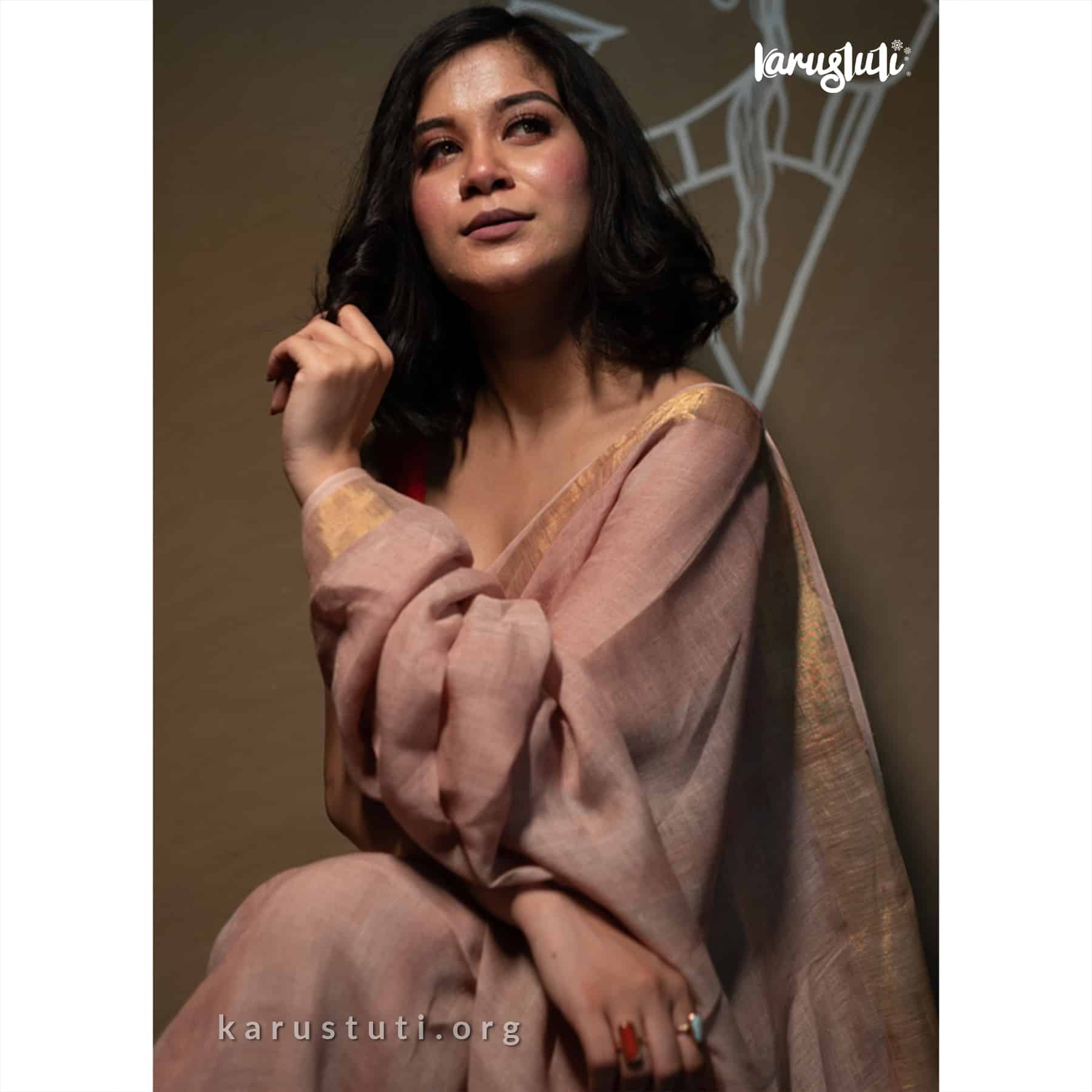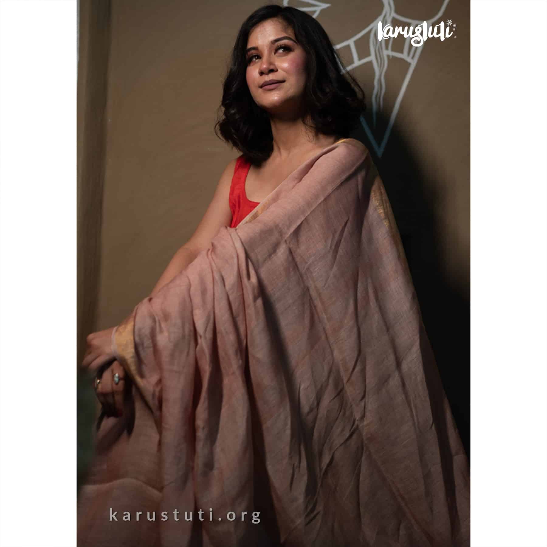 Premium linen with all over non repeat self color stripes. Airy breathable and fashionable linen handloom saree takes 3 to 4 days to complete. AZO and PCP free color. Best for summer party