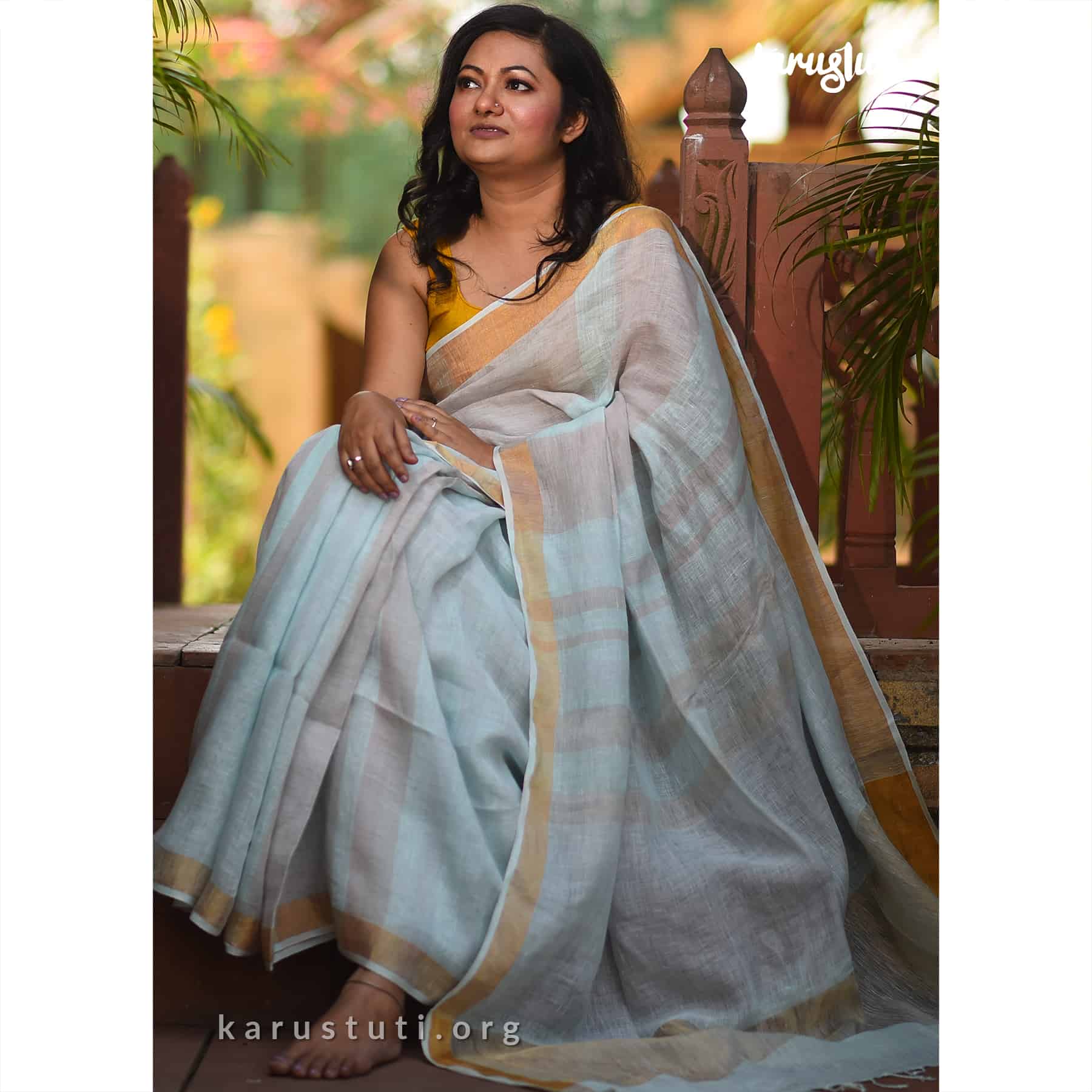 Premium linen with all over non repeat zari and multi color stripes. Airy breathable and fashionable linen handloom saree takes 3 to 4 days to complete. AZO and PCP free color. Best for summer party