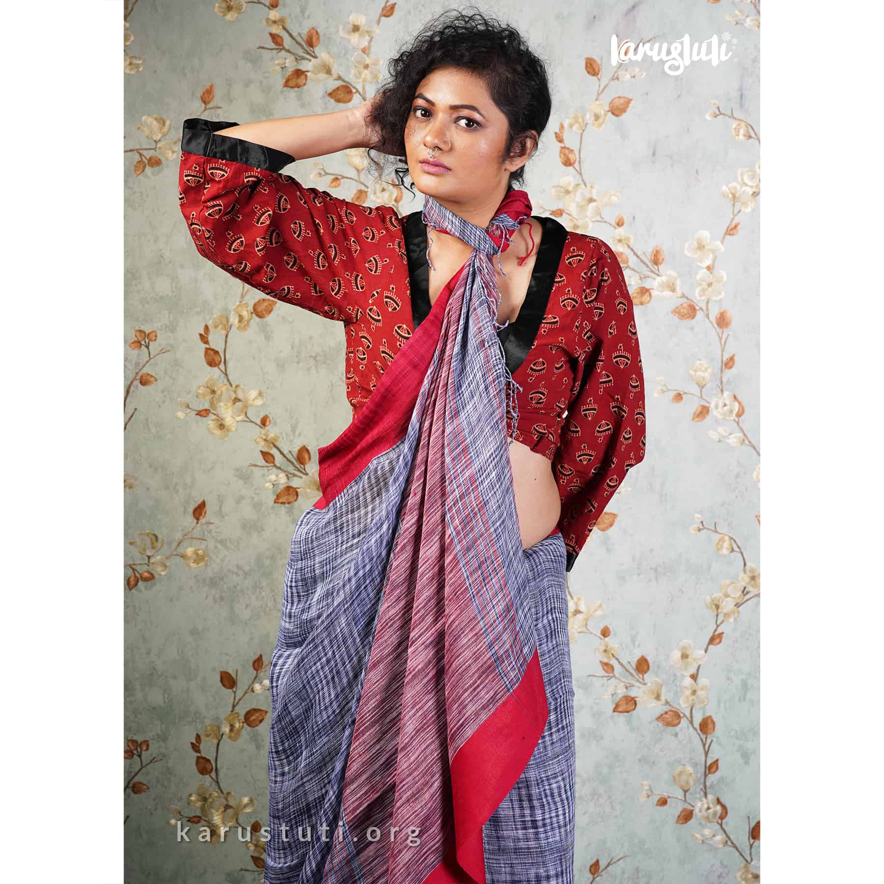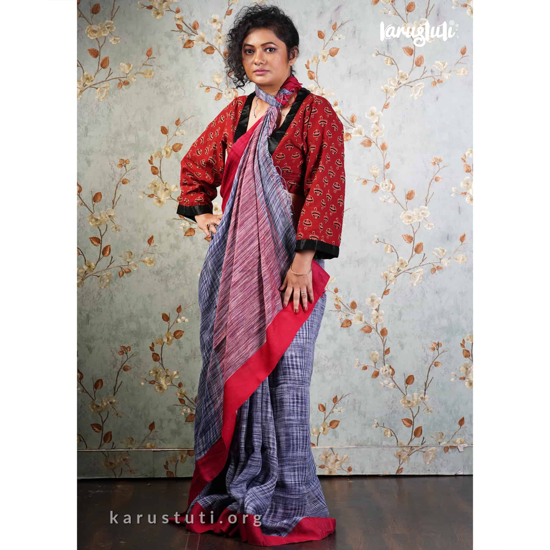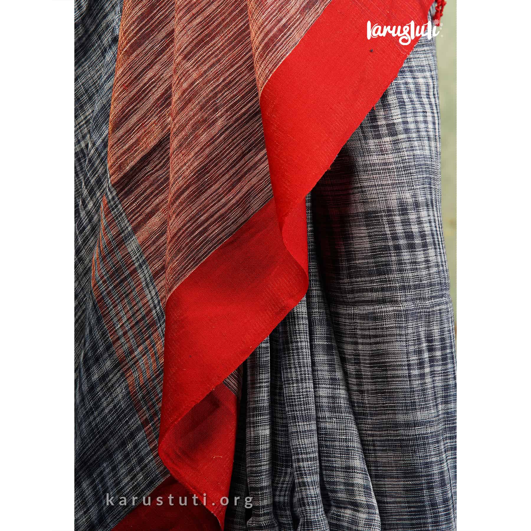 Linen handloom with red satin border. Handmade breathable classy drape for all occasions.