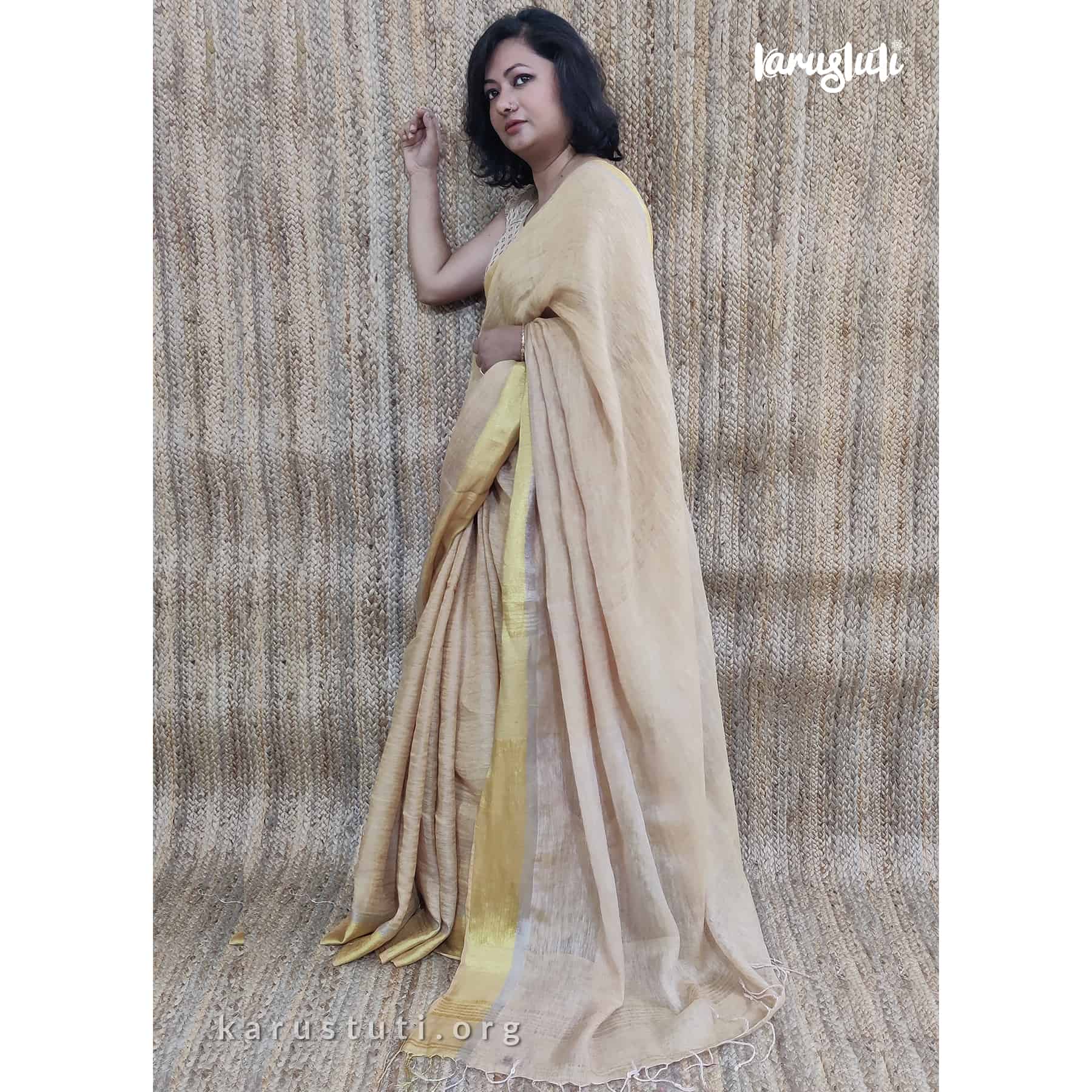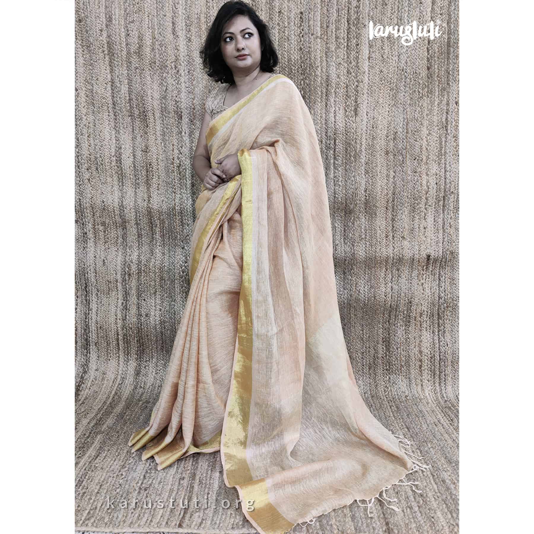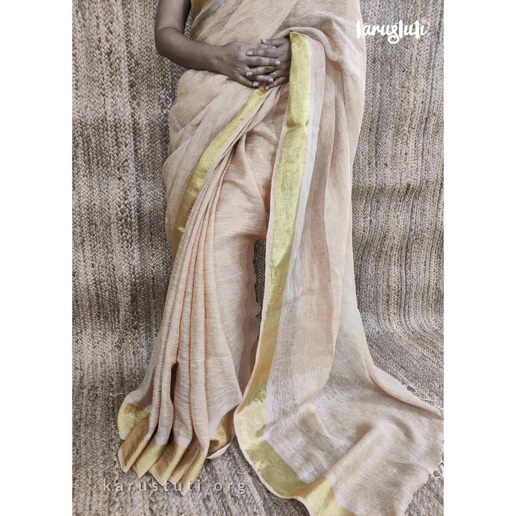 Linen handloom with wide zari border and pallu. Handmade breathable classy drape for all occasions.