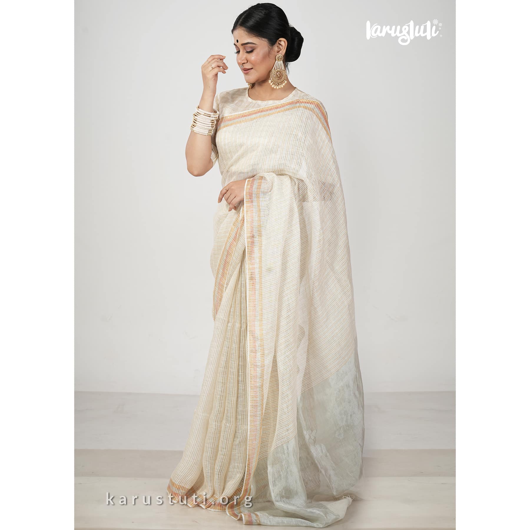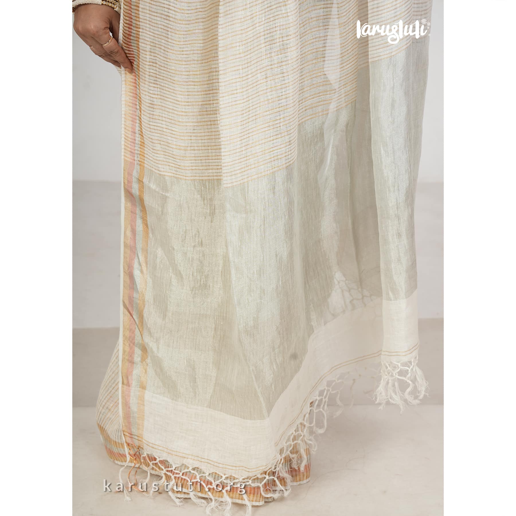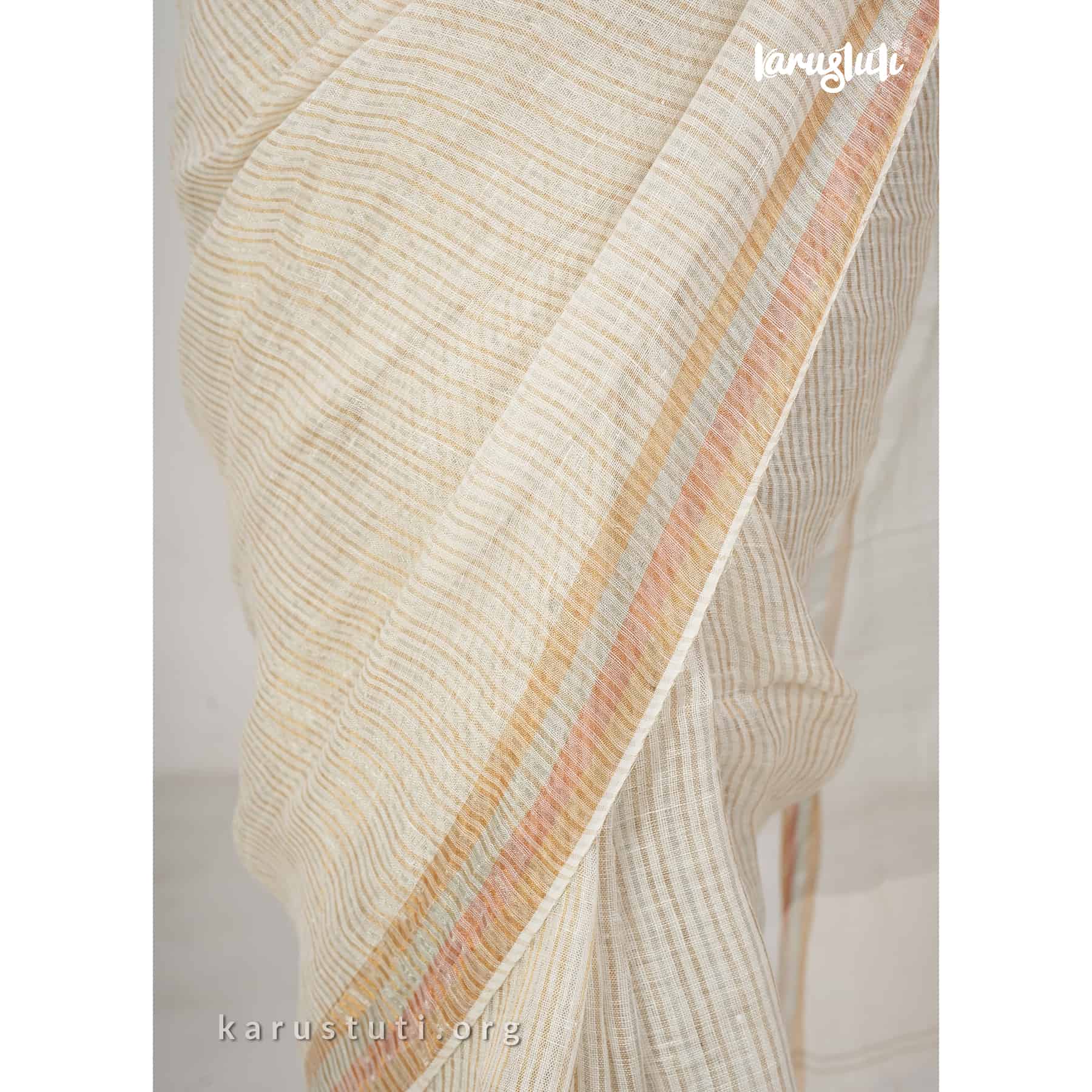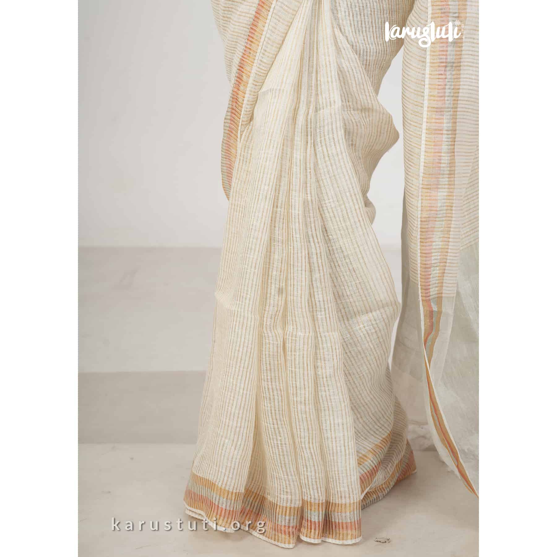 Linen handloom saree in fine stripes with tested zari blended in silver and gold shades and known as linen zari handloom saree. This saree took 3 to 4 days to complete. Bright and azo and PCP free colour. Best for any occasion.