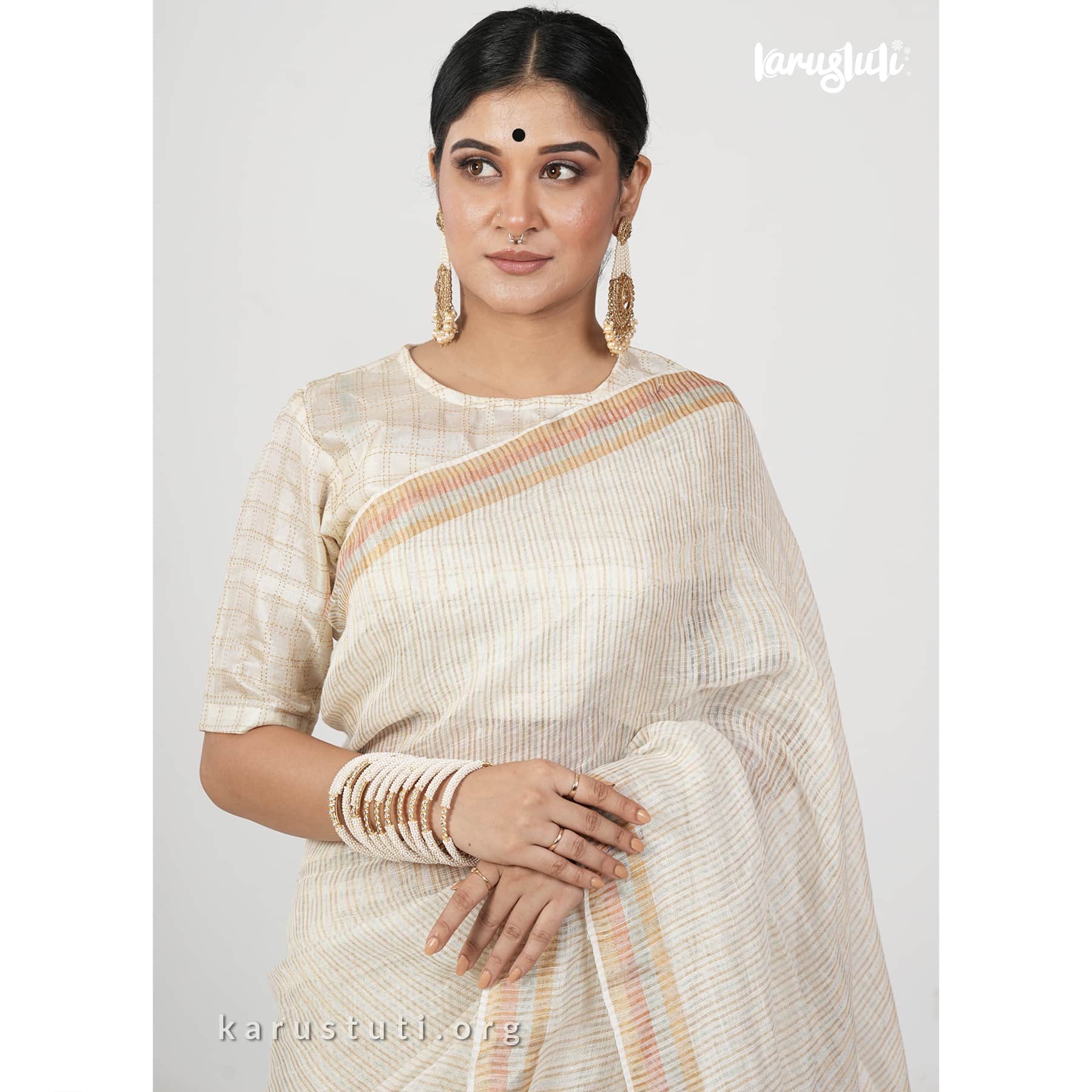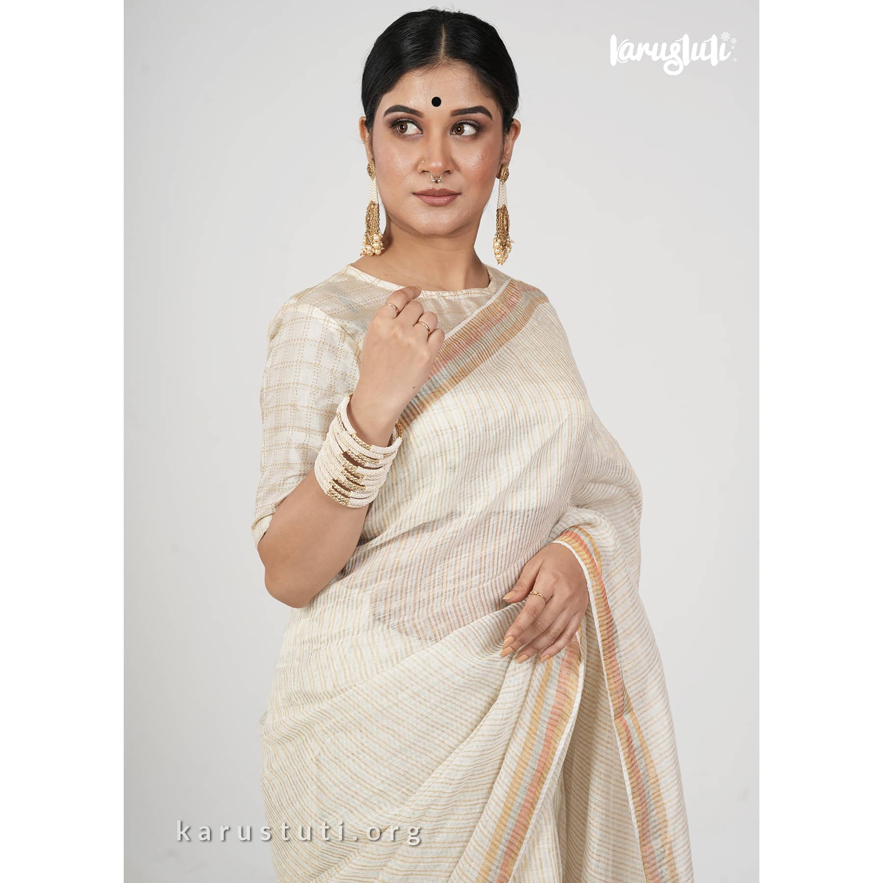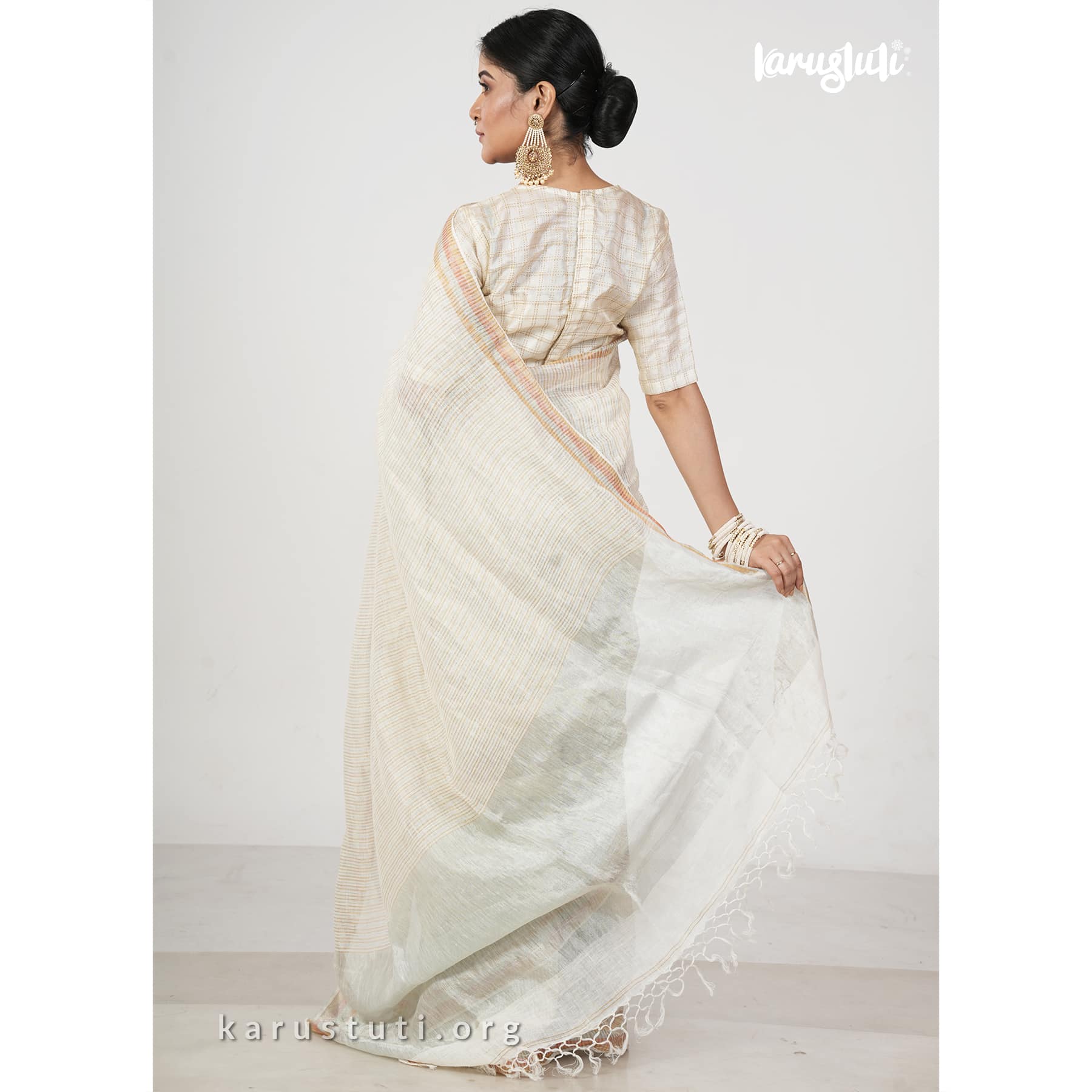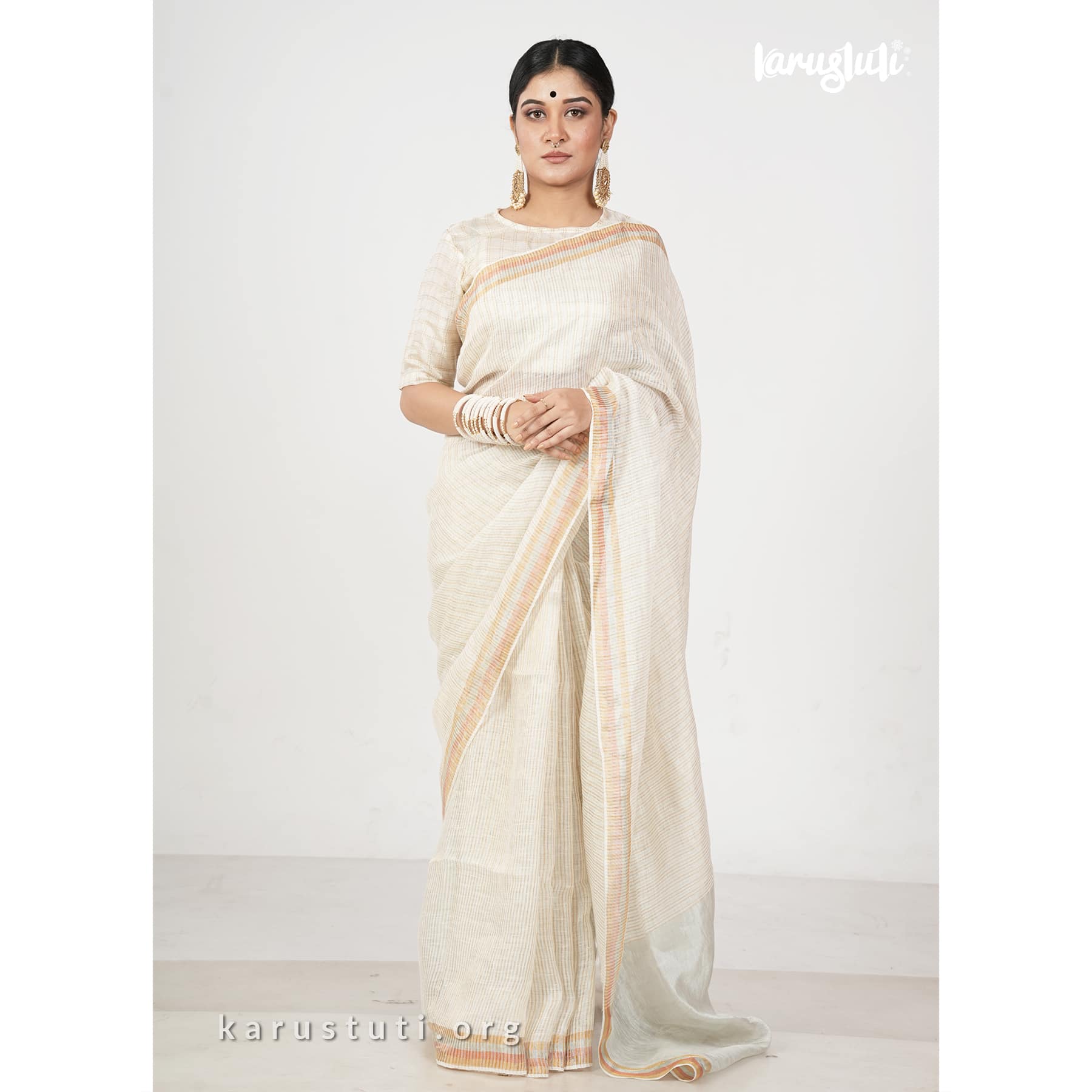 Linen handloom saree in fine stripes with tested zari blended in silver and gold shades and known as linen zari handloom saree. This saree took 3 to 4 days to complete. Bright and azo and PCP free colour. Best for any occasion.
