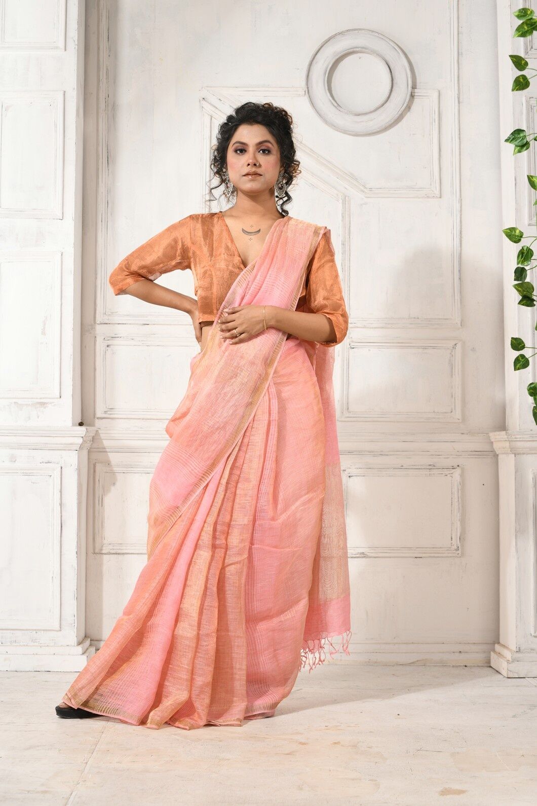 The Karustuti Soft Pink Linen Metallic Handloom Saree is not just an outfit—it’s a statement of elegance, patience, and heritage. A perfect choice for women who celebrate timeless grace and refined artistry in every thread.