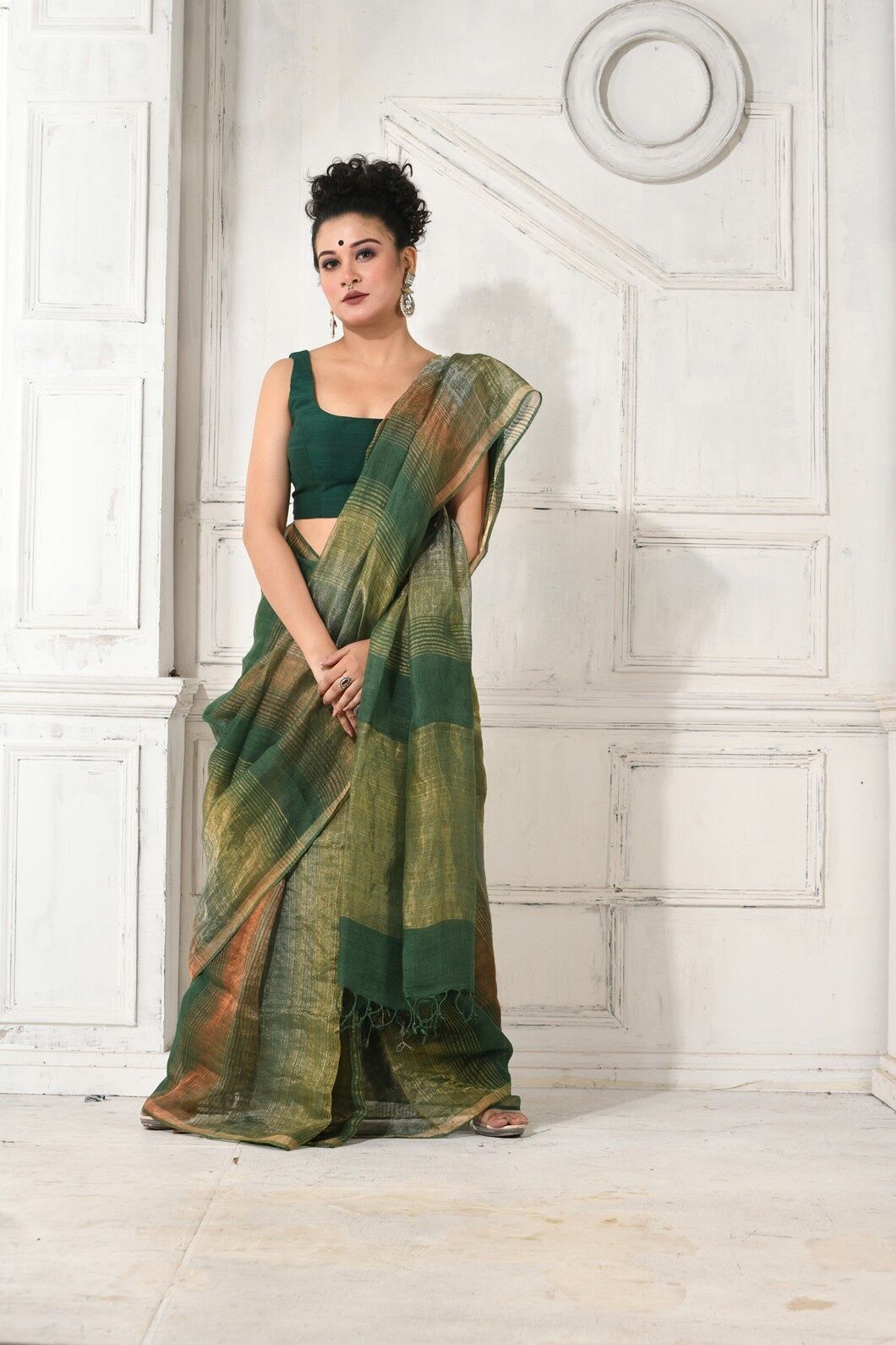 Karustuti Bottle Green Linen Metallic Handloom Saree