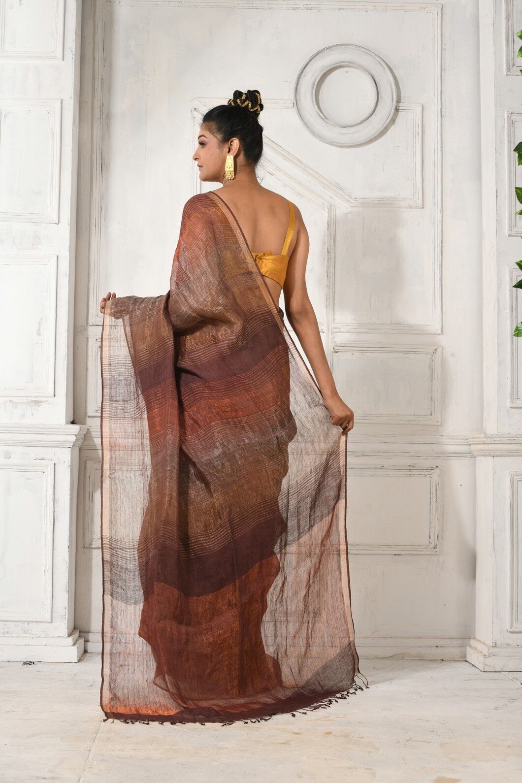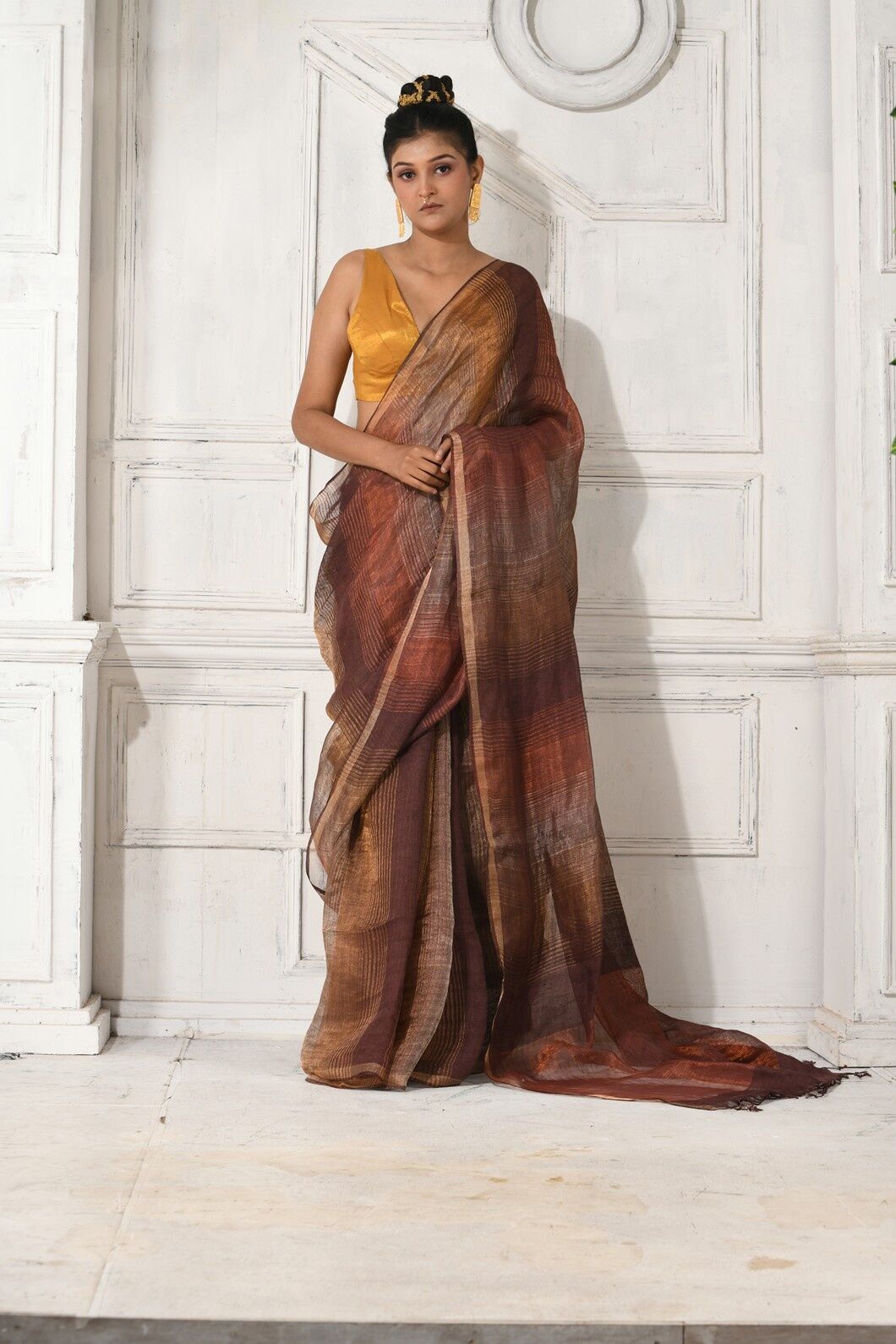 The Karustuti Brown Linen Metallic Handloom Saree is more than an outfit—it’s a testament to artistry, patience, and timeless fashion. Designed for women who appreciate subtle luxury, it transforms every occasion into a statement of elegance.