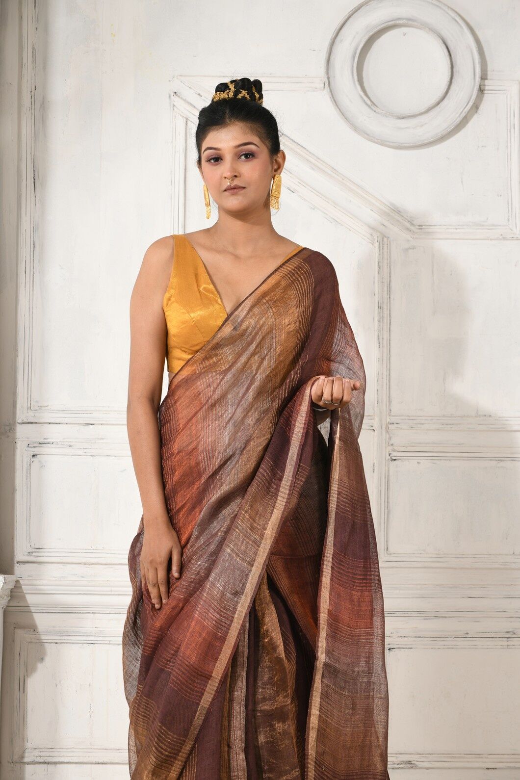 The saree features an exquisite all-over vertical tissue ombré woven design, giving it a soft metallic shimmer that gracefully catches the light with every movement. The deep brown hue exudes understated sophistication, while the tissue pallu enhances its regal charm with a luminous touch. Ideal for festive occasions, formal gatherings, or elegant celebrations, this saree reflects refined taste and effortless style.