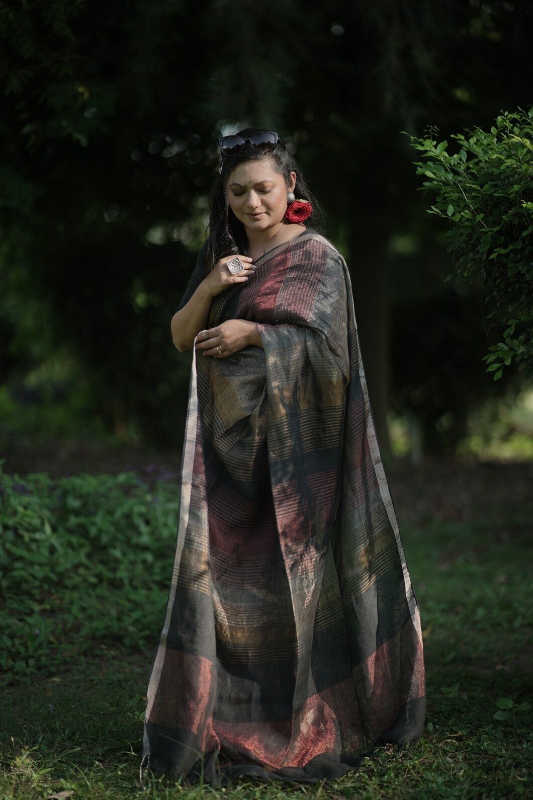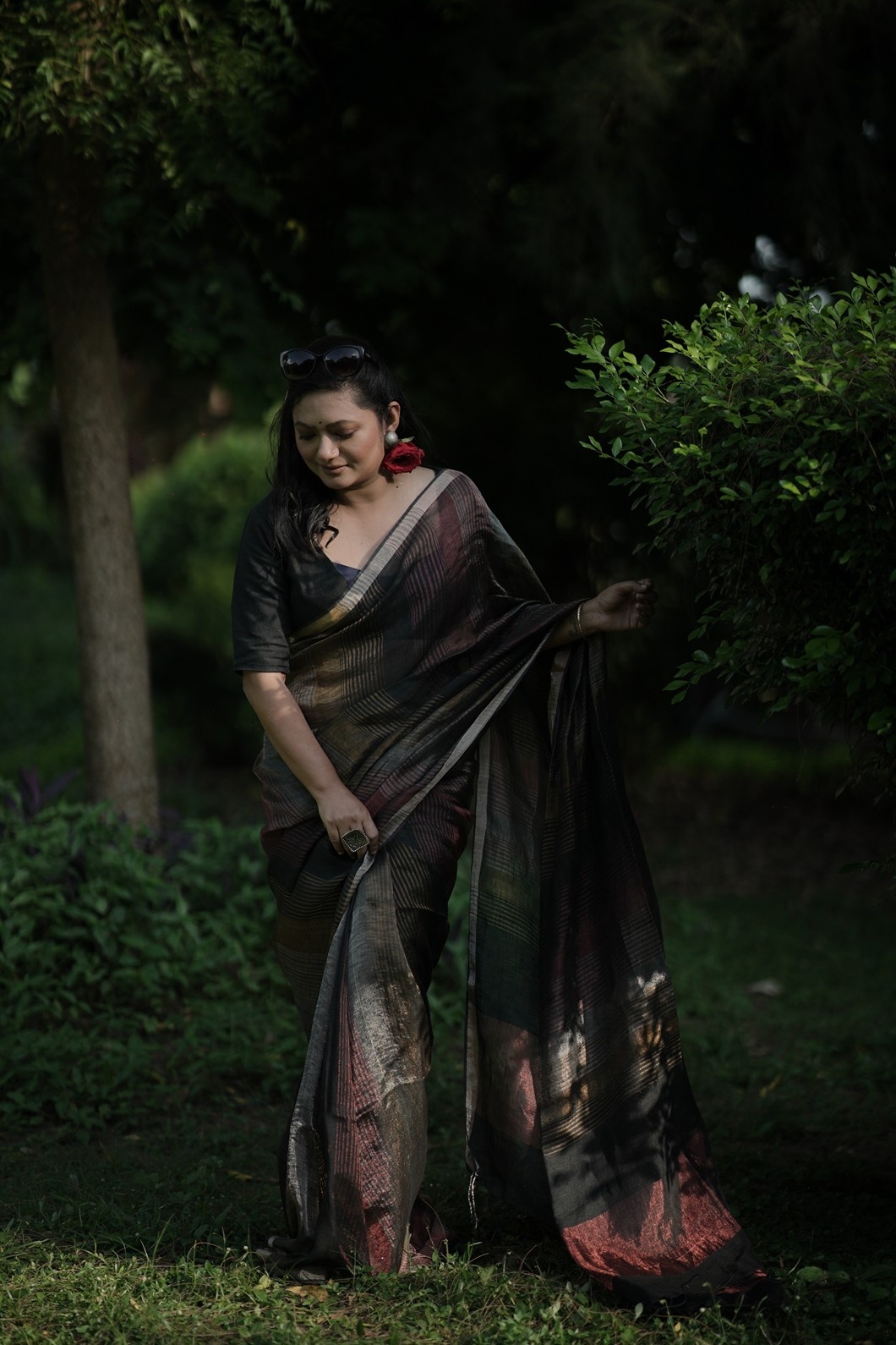 The Karustuti Black Linen Metallic Handloom Saree is not merely attire — it is a reflection of timeless artistry, individuality, and grace, designed for women who appreciate elegance woven by hand