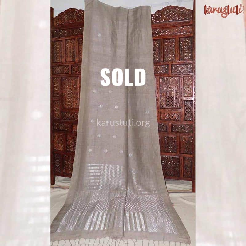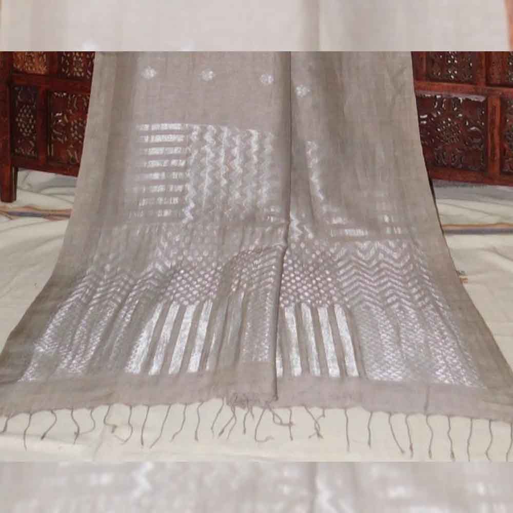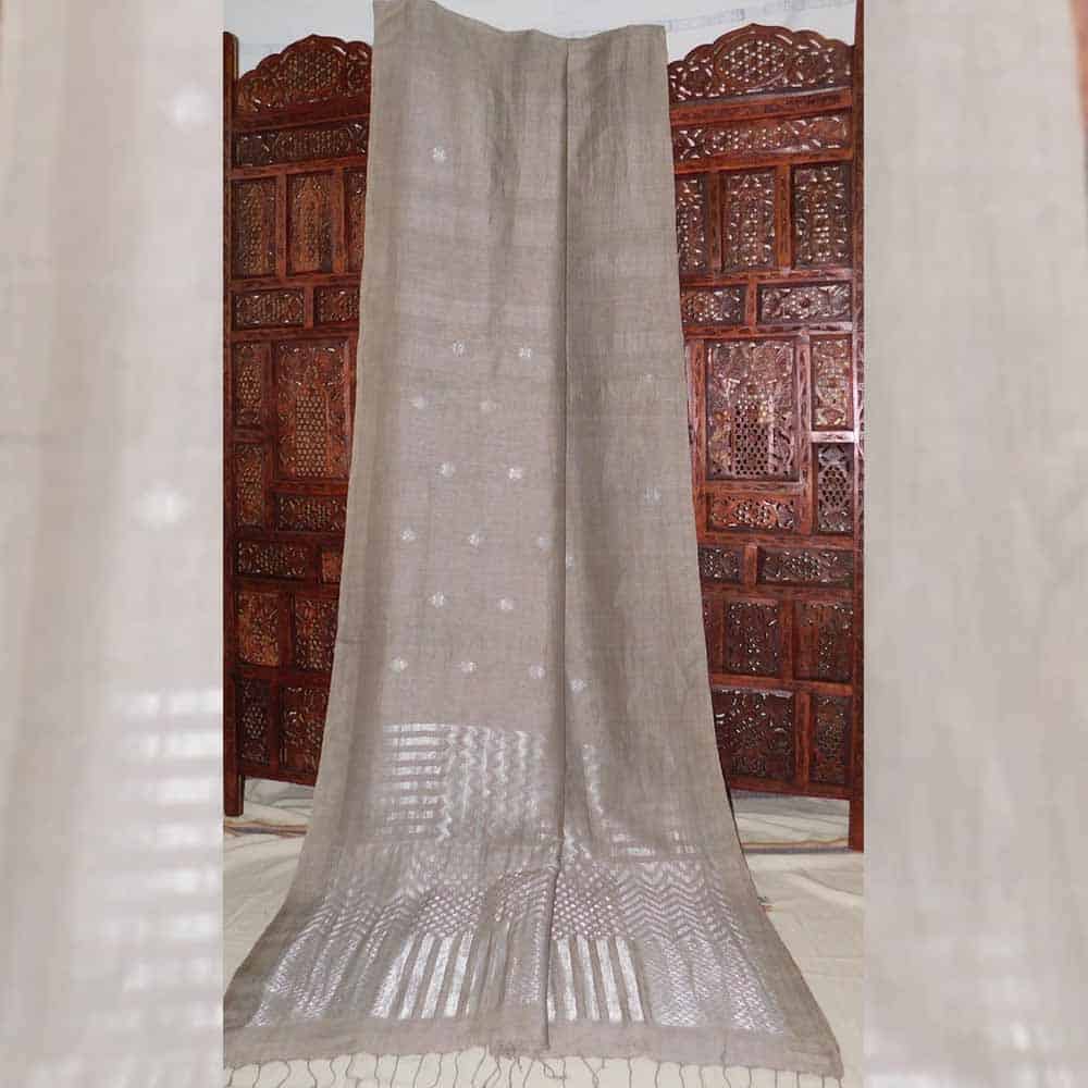 80cnt linen with, all over Mughal buta jamdani design with silver silk tested zari and geometric jacquard Jamdani design in pallu, elegant and comfortable handloom linen saree takes 8 to 10 days to complete. Natural dye with AZO and PCP tested, non-allergic color .starch not require. Best for any evening party and occasion.