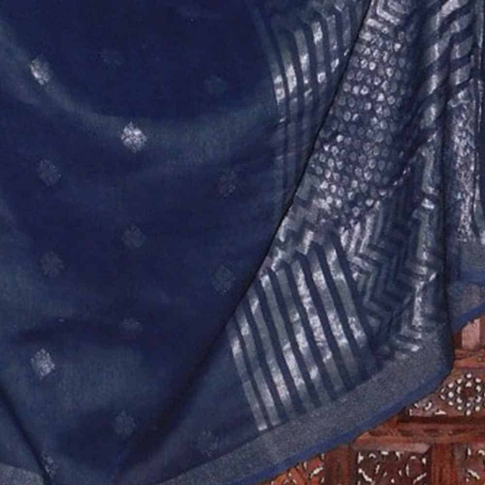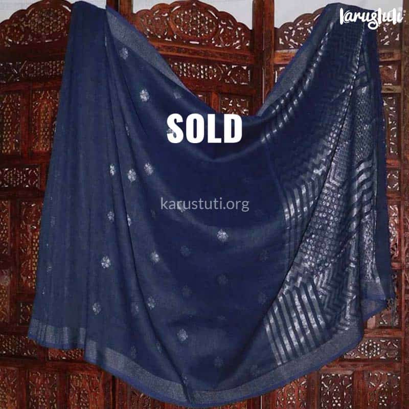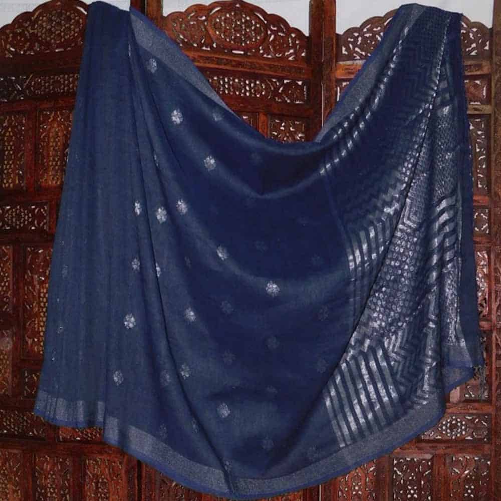 80cnt linen with, all over Mughal buta jamdani design with silver silk tested zari and geometric jacquard Jamdani design in pallu, elegant and comfortable handloom linen saree takes 8 to 10 days to complete. Natural dye with AZO and PCP tested, non-allergic color .starch not require. Best for any evening party and occasion.