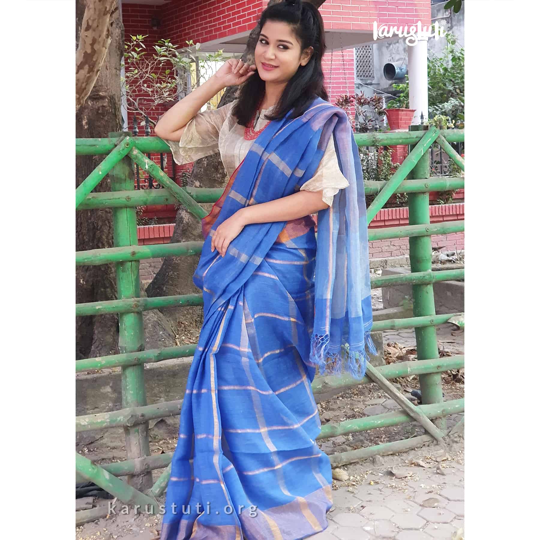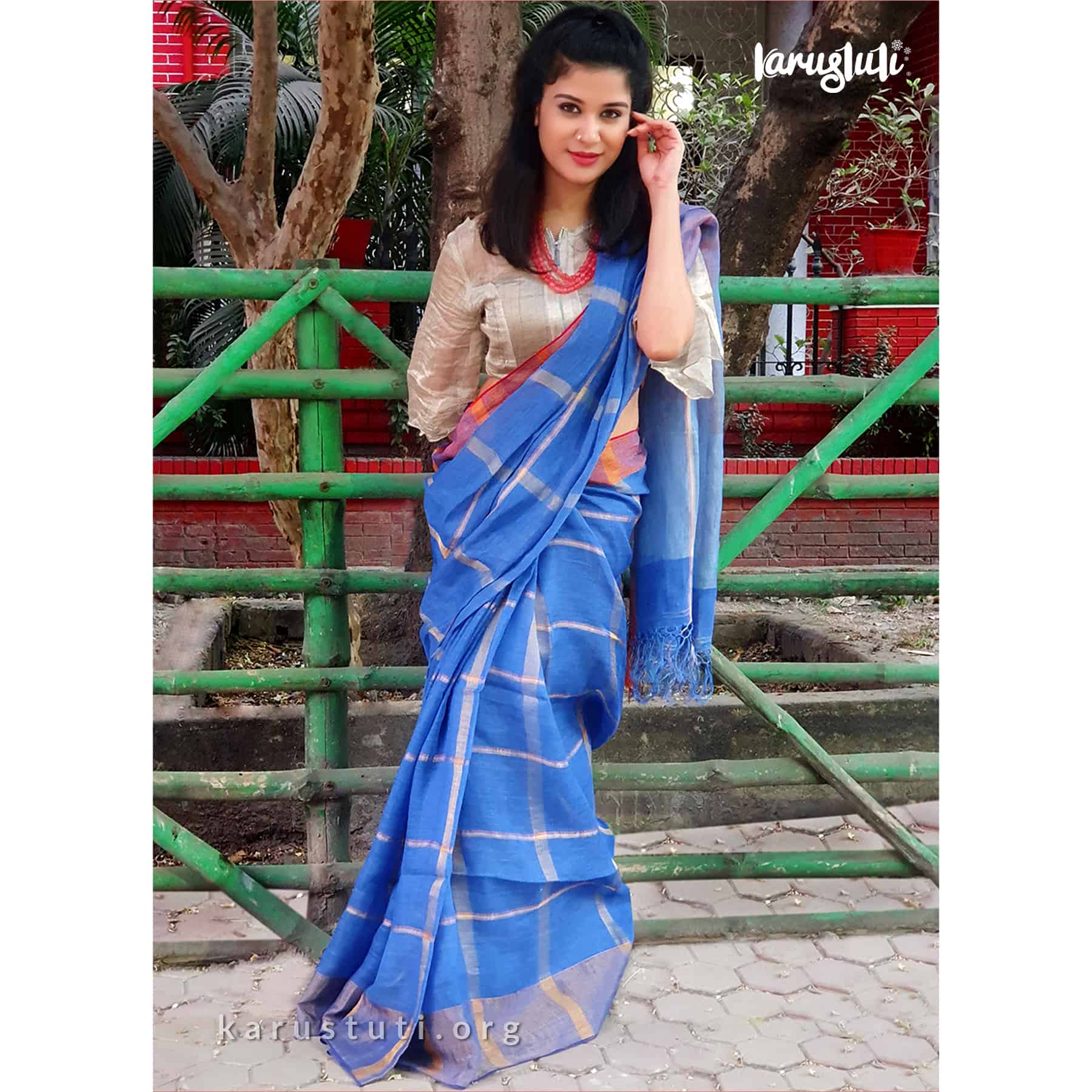 Elevate Style with Linen Zari Blue Handloom Saree | Karustuti