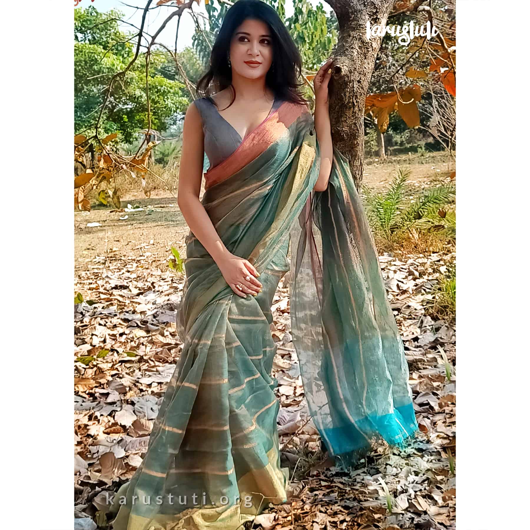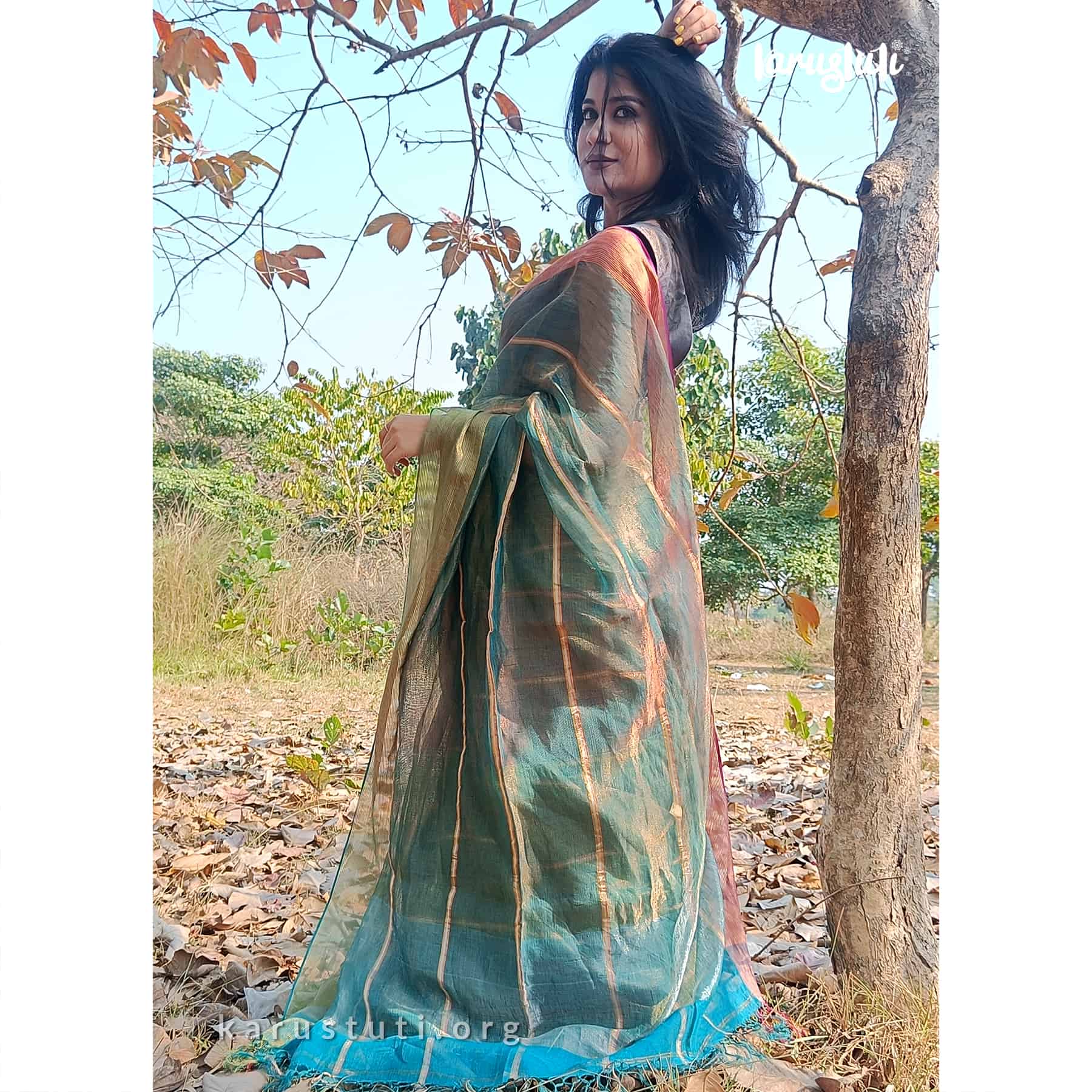 Linen handloom saree in multi-coloured checks with tested zari blended in silver and gold shades and known as linen zari handloom saree. This saree took 3 to 4 days to complete. Bright and azo and PCP free colour. Best for any occasion.