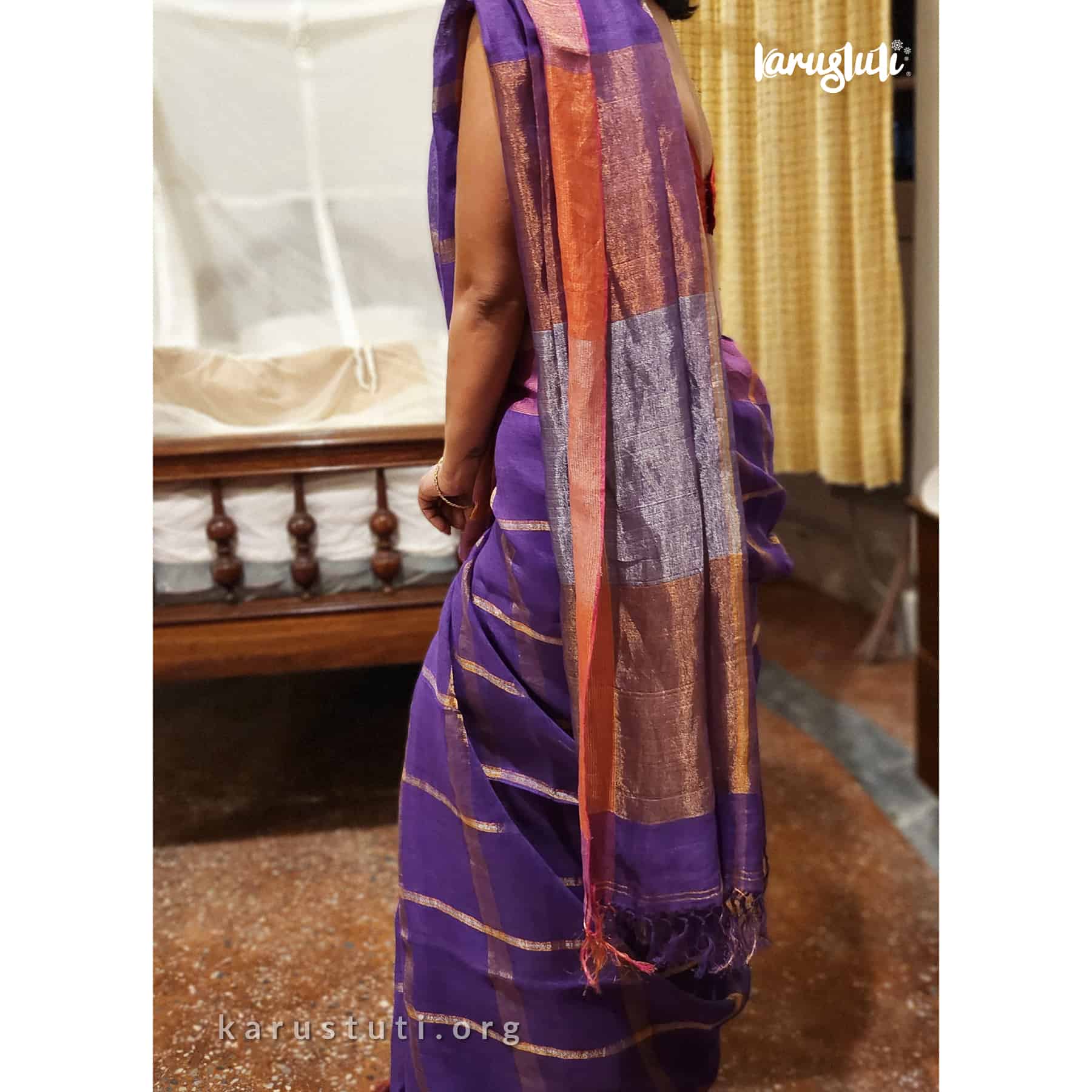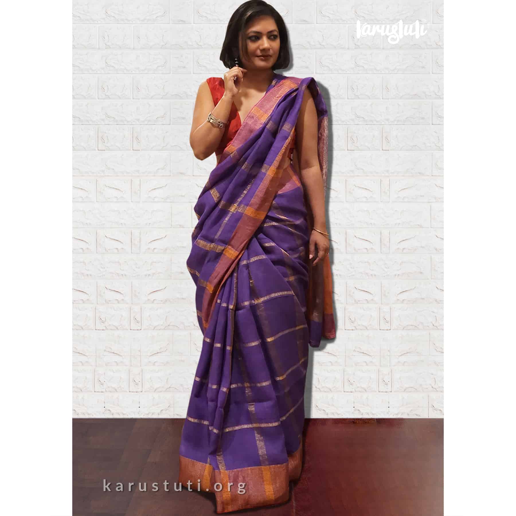 Linen handloom saree in multi-colored checks with tested zari blended in silver and gold shades and known as linen zari handloom saree. This saree took 3 to 4 days to complete. Bright and azo and PCP free color. Best for any occasion.