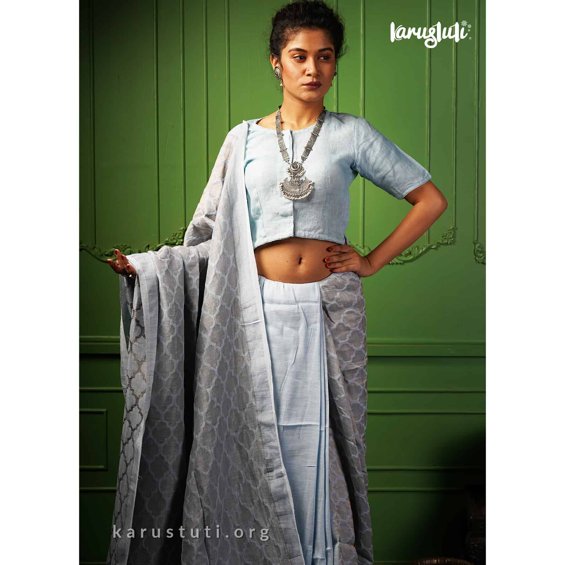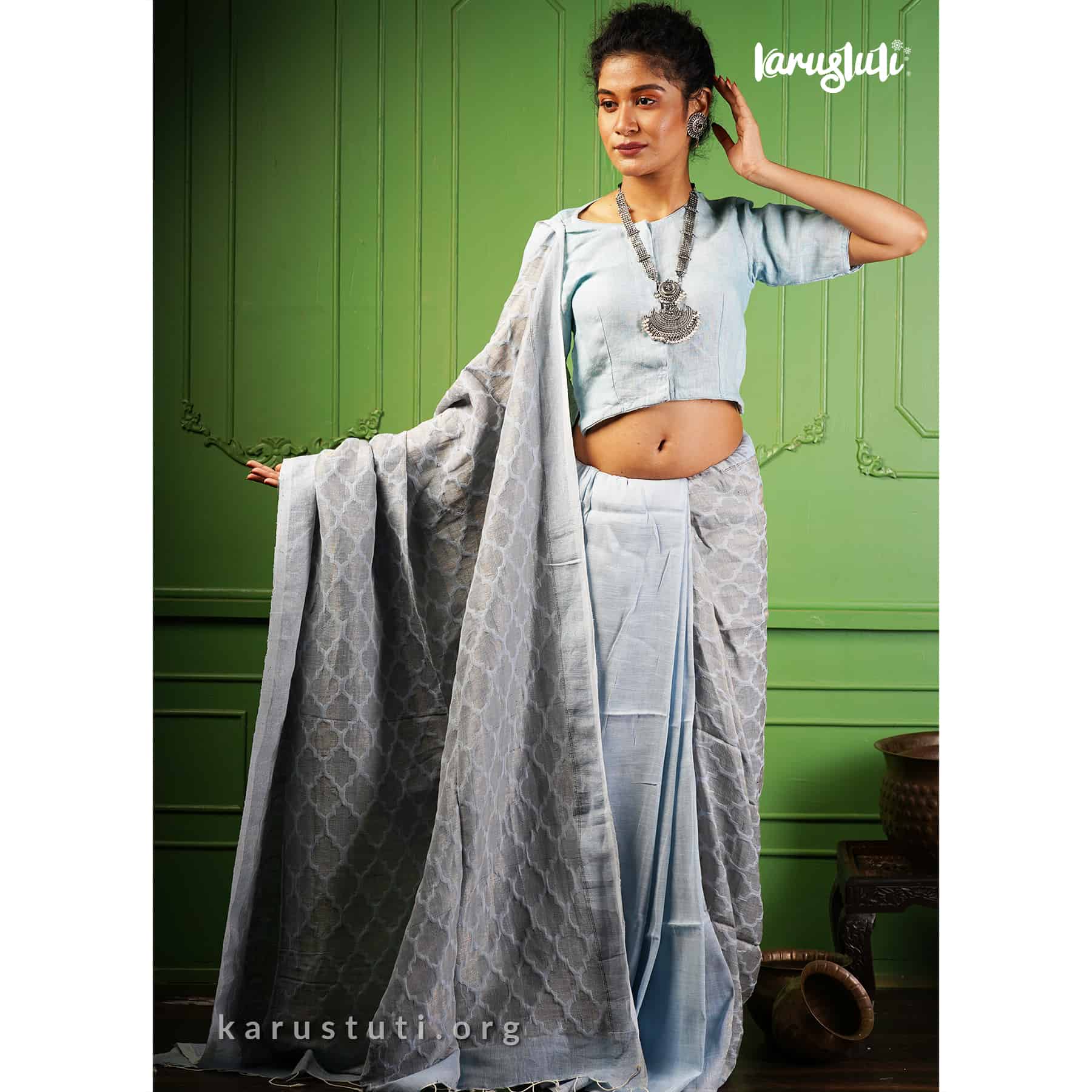 Linen handloom with all-over zari jacquard work. Handmade breathable classy drape for all occasions.