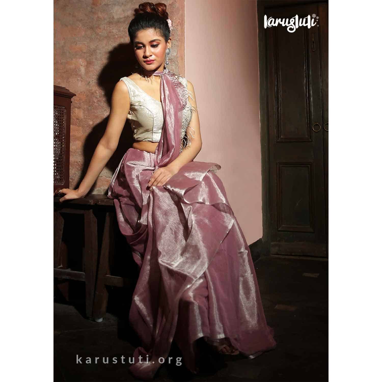 120cnt premium linen with silk tested silver zari in warp, this saree known as Metallic saree. Use of high count and premium linen gives very delicateland light-weight feel, extraordinary classy linen saree. This saree takes 8 days to complete, Delicate ultimate fashion for the party. AZO and PCP free non-allergic color.