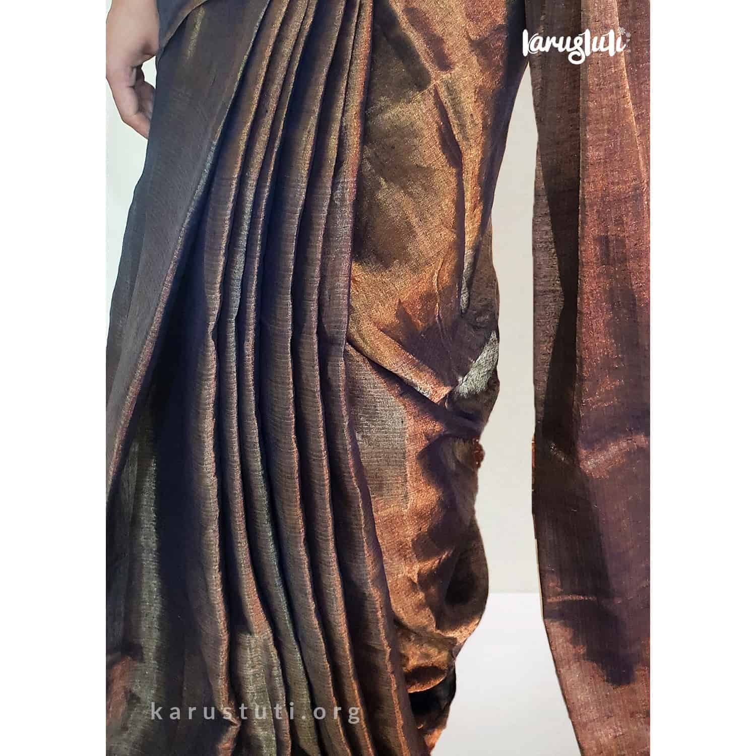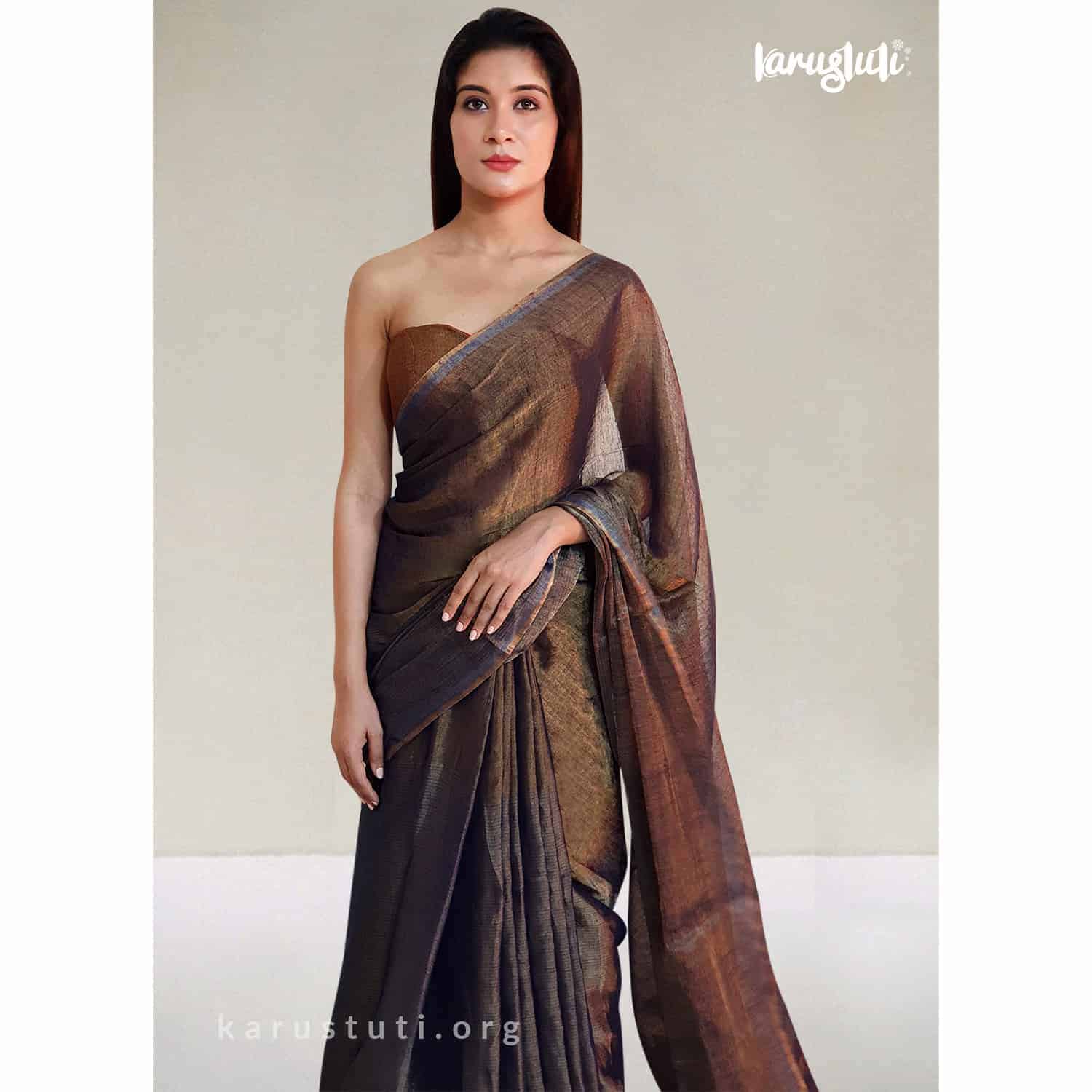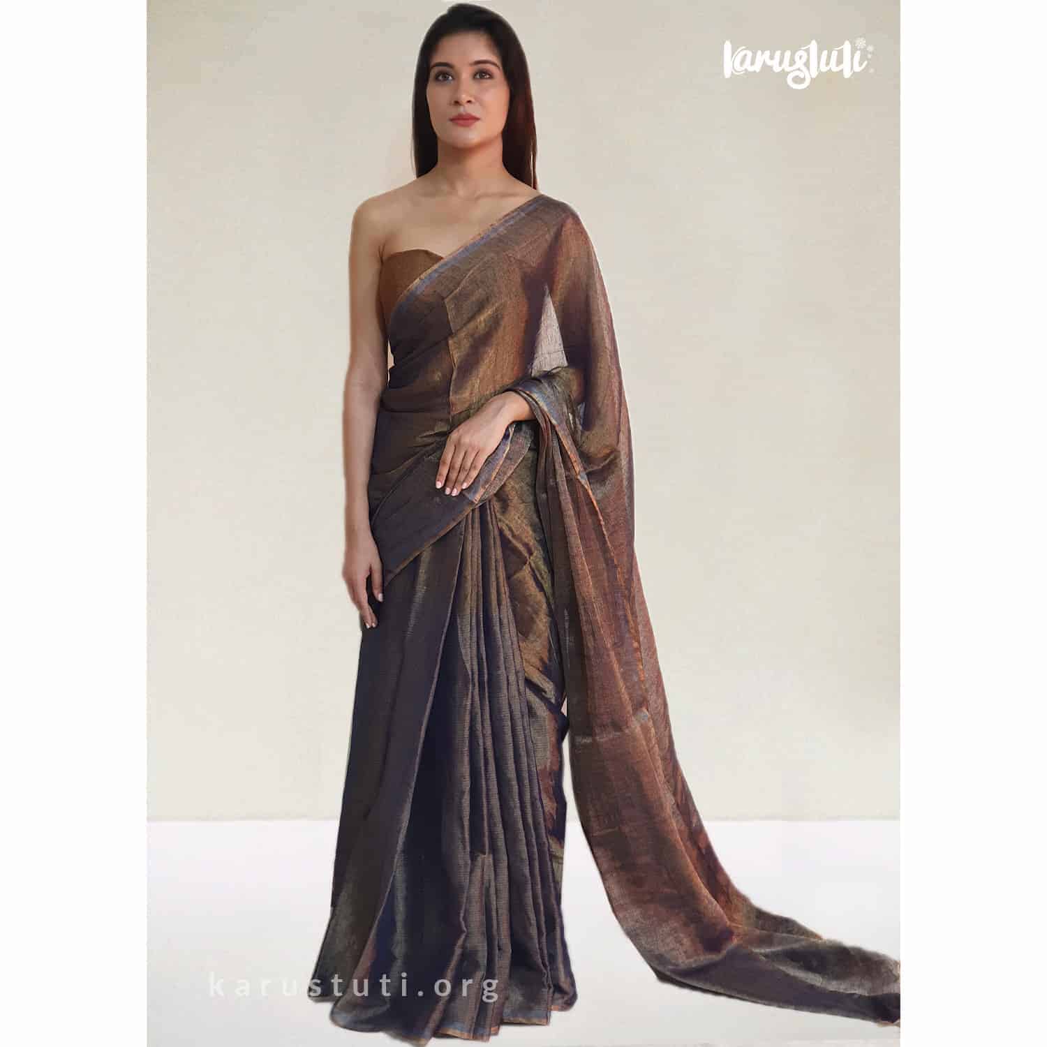 This 120cnt premium linen saree with silk tested zari in warp is a Metallic Handloom saree. Use of highest count and premium linen with fine stripes design weaving has given a gorgeous look and delicate light-weight feel to it. It is a classy linen saree that has been completed over 10 days. An ultimate style pick for a party, this handloom saree is created with AZO and PCP free non-allergic color.