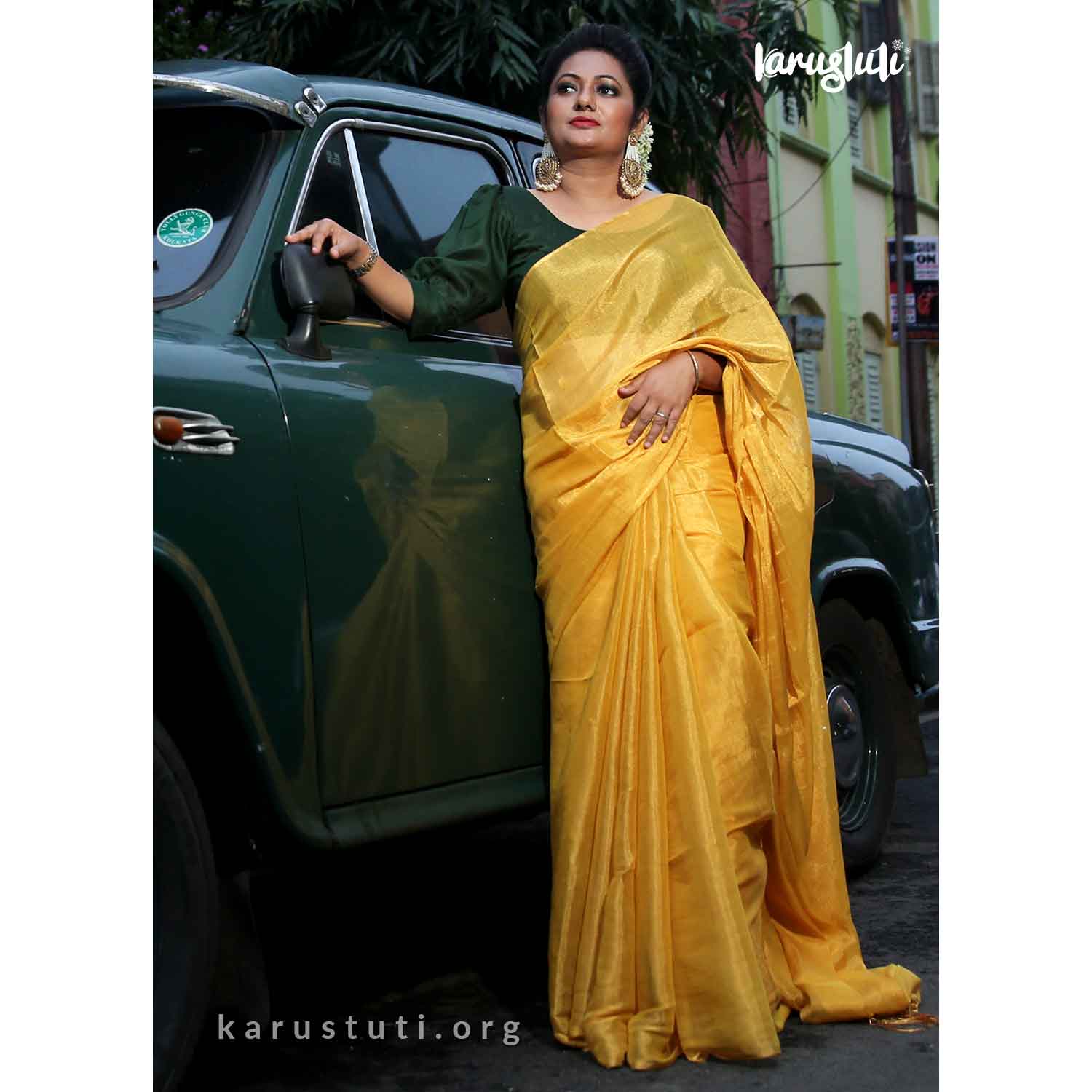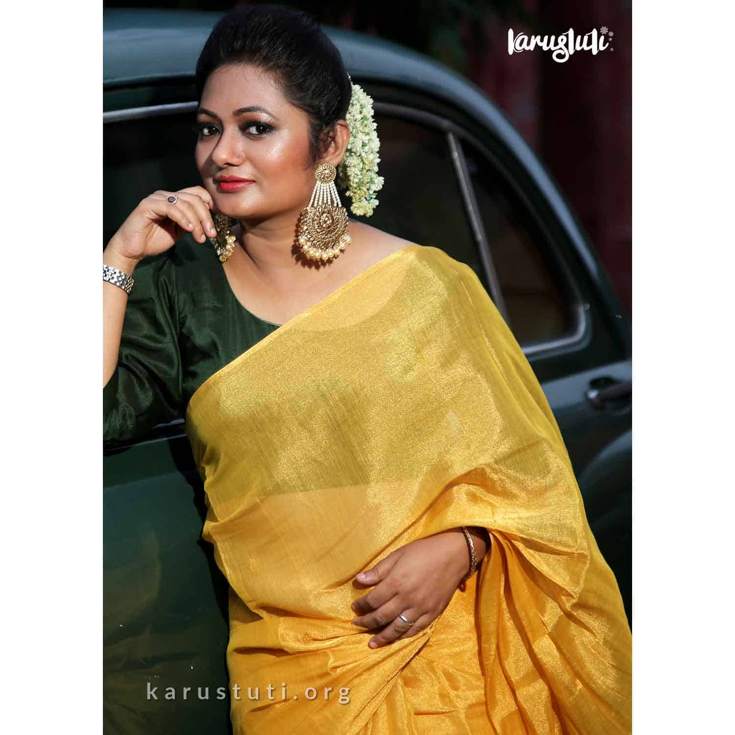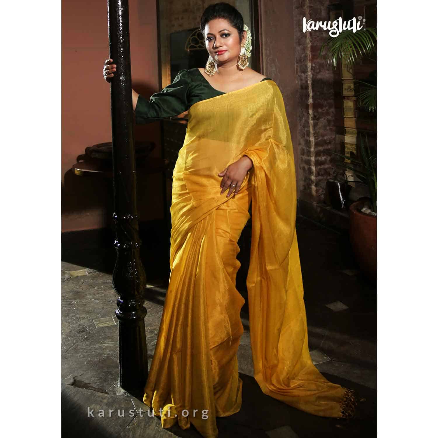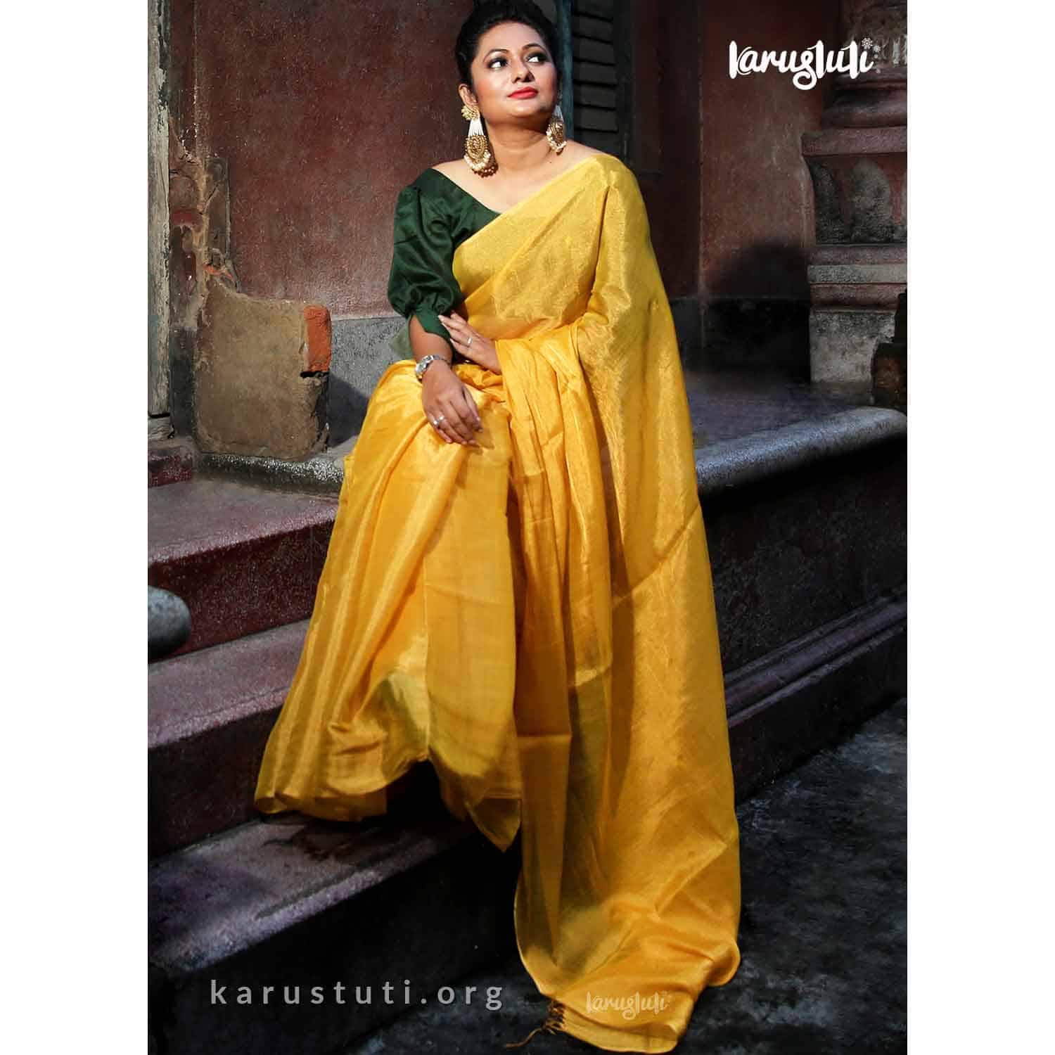 120cnt premium linen with gold tested zari in warp and all over small barfi weaving, this saree known as Metalic saree. highest count of linen with shade of dark copper gold gives very delicate and light-weight feel, An extraordinary classy linen saree. This saree takes 8 days to complete, Delicate ultimate fashion for the party. AZO and PCP free non-allergic color.