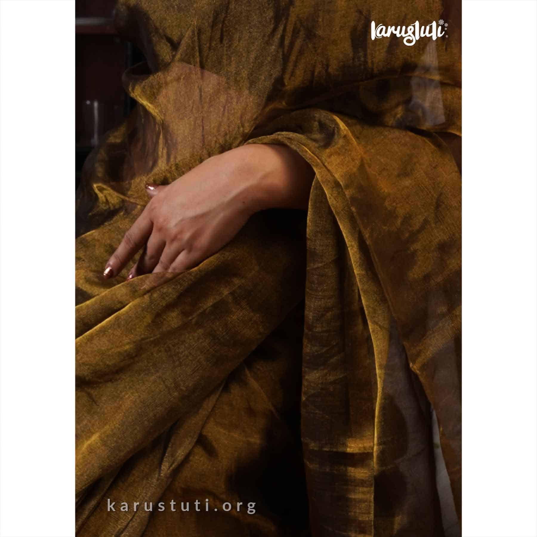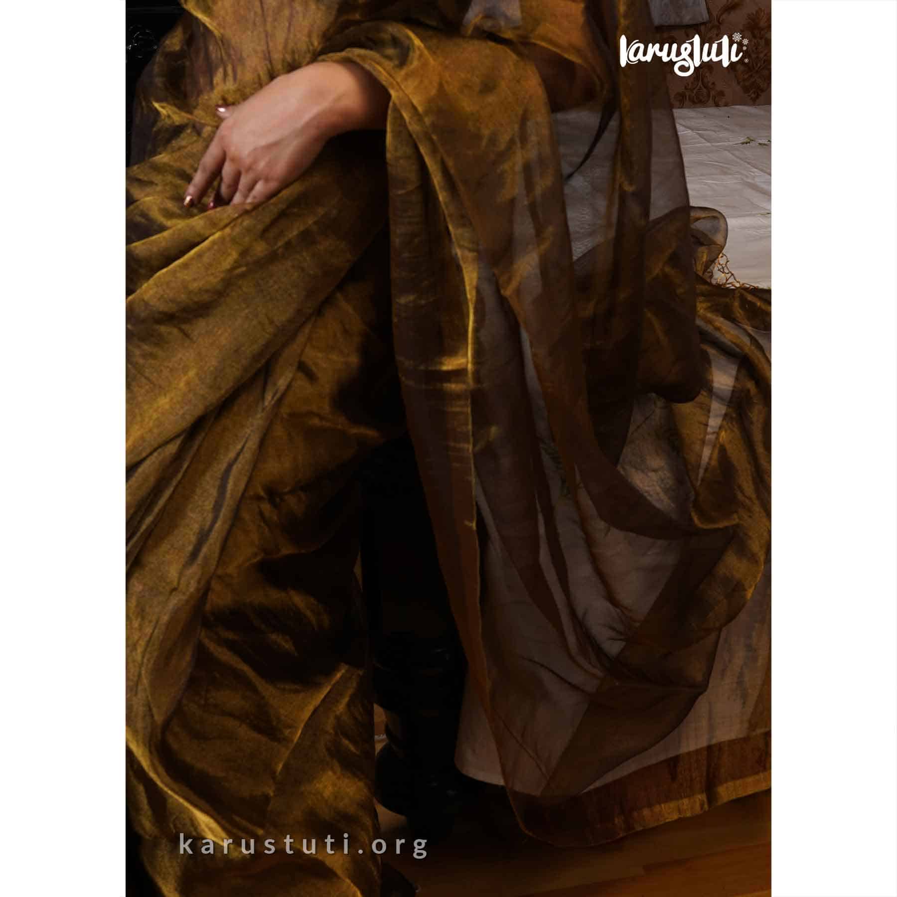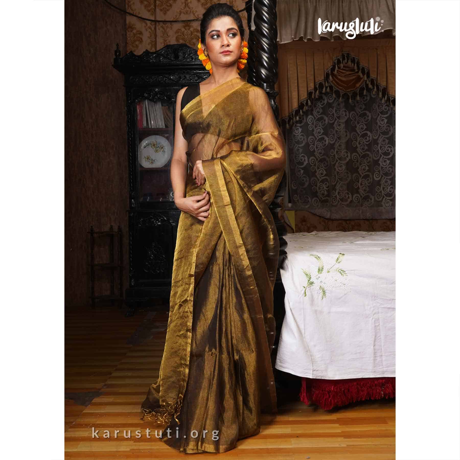 This is a Tissue Handloom saree with copper gold tested zari in warp embellished with reshum in weft. This creates a rich and classy metallic look in the saree, thereby making it ideal as a party wear.This saree takes 7 to 9 days to be completed. It is created by best practices naturally and is completely free of AZO and PCP non allergic colours. The saree does not require starch.
