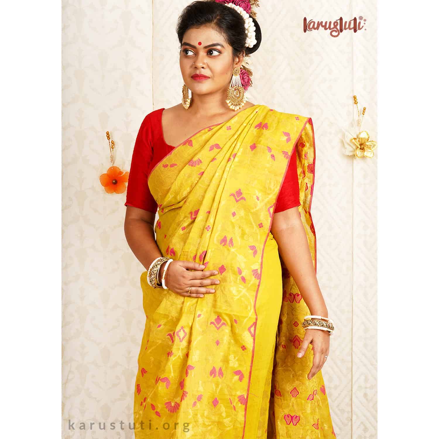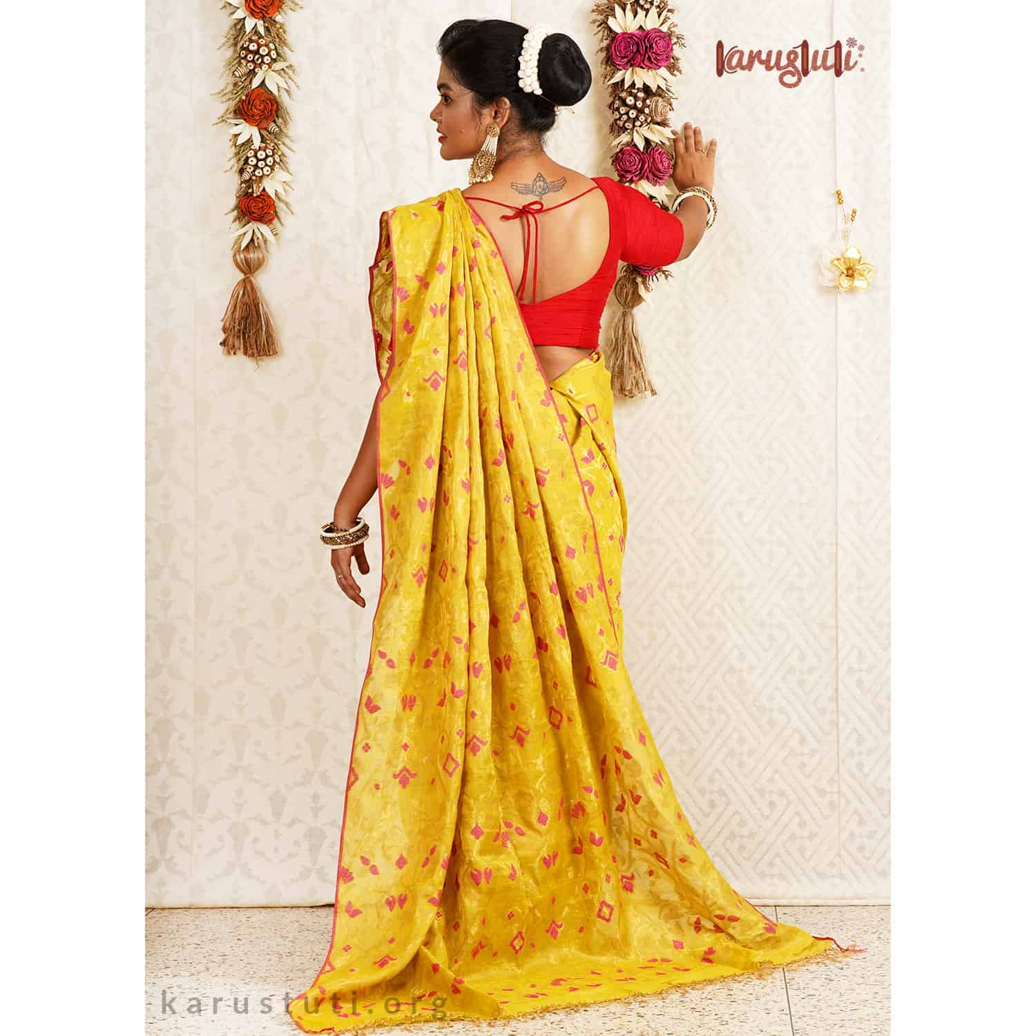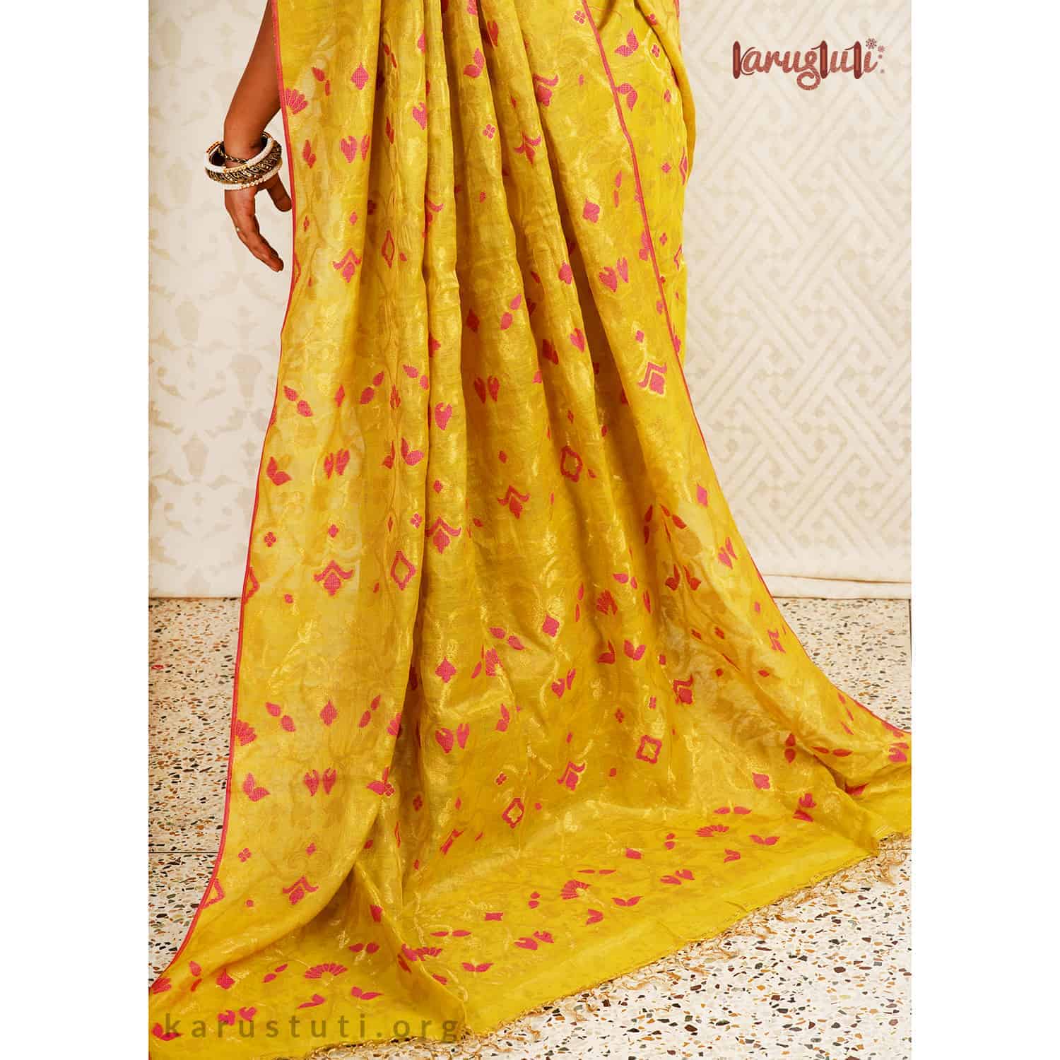 This classy tissue handloom saree with silk golden tested zari in weft, has all over floral weaving in jacquard with gold and silver tissue. Its meenakari weaving gives a rich and classy look, making it an ultimate choice as a party wear. Its comfort makes it suitable for all climates. This saree takes 7 to 9 days to be completed and is completely natural, AZO and PCP free non-allergic color made. This saree does not require starch.