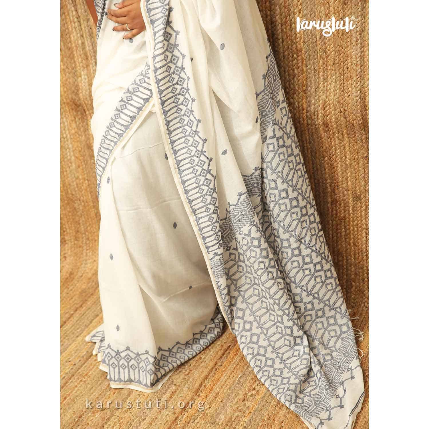 100 count fine muslin cotton with traditional jamdani border along with traditional motifs jamdani pallu. Allover small buta weaving gives an elegant look. An ultimate choice for handloom lover. This saree takes 8 to 10 days to complete. Azo and PCP free colour, starch not require