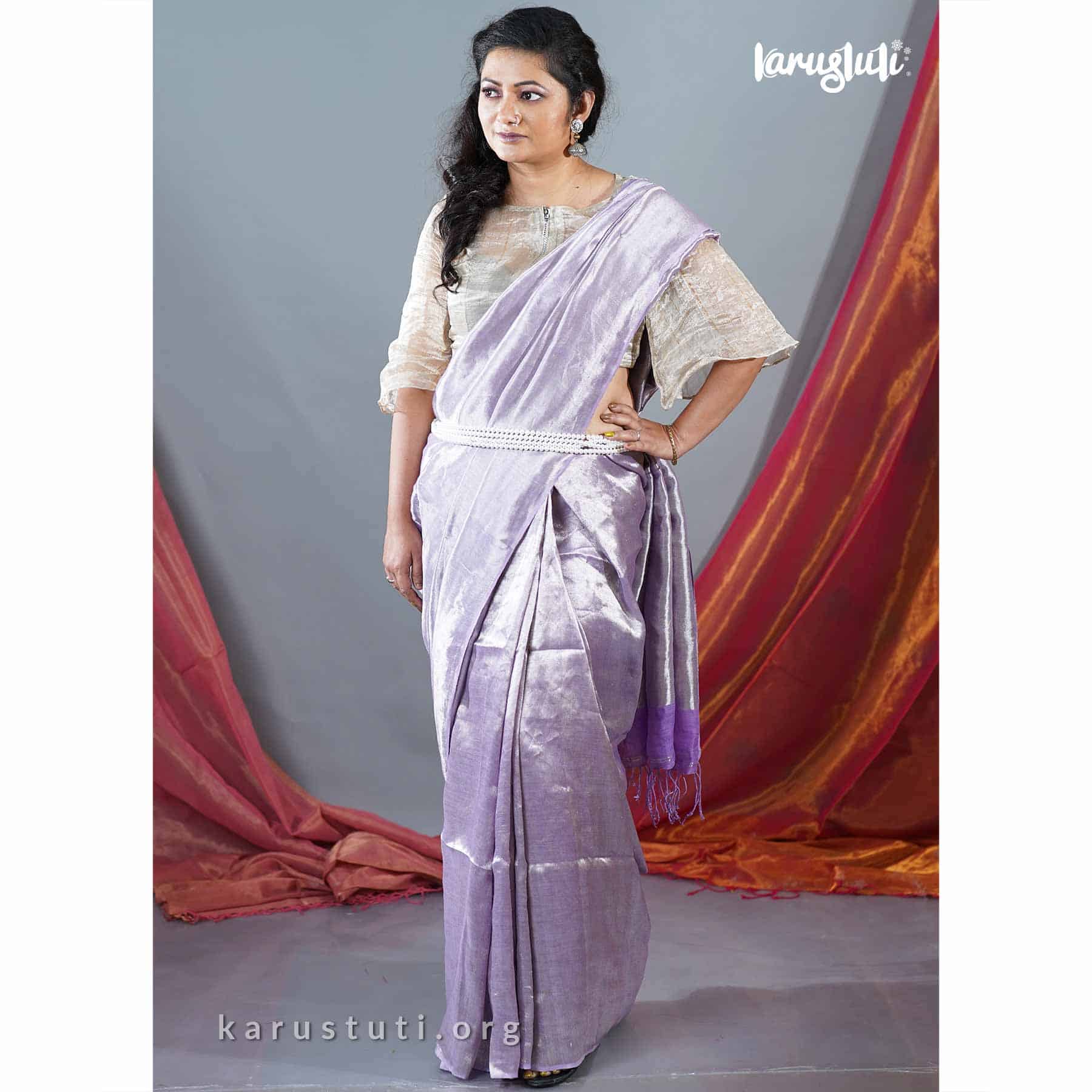 Introducing the Twill Metallic Linen Handloom Saree from the prestigious brand Karustuti! Prepare to dazzle with this exquisite Lilac saree adorned with stunning Silver metallic accents. Crafted with love, this handloom saree is a true masterpiece that will make you stand out in any occasion.