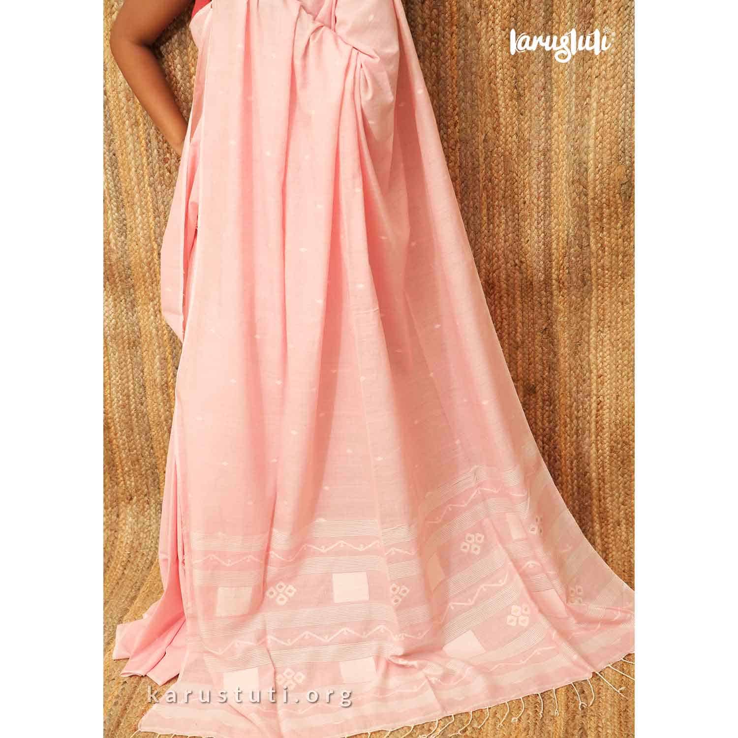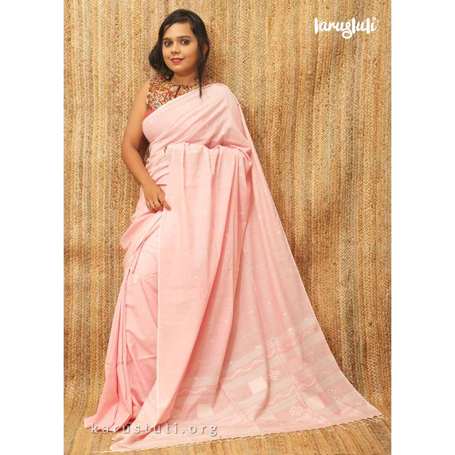 100 CNT fine muslin cotton hand jamdani with all over small buta weaving and geometric naksha jamdani in pallu. Very soft and elegant saree takes 7 to 9 days to complete. AZO and PCP free, non-allergic colour. Best for summertime. Starch not require.