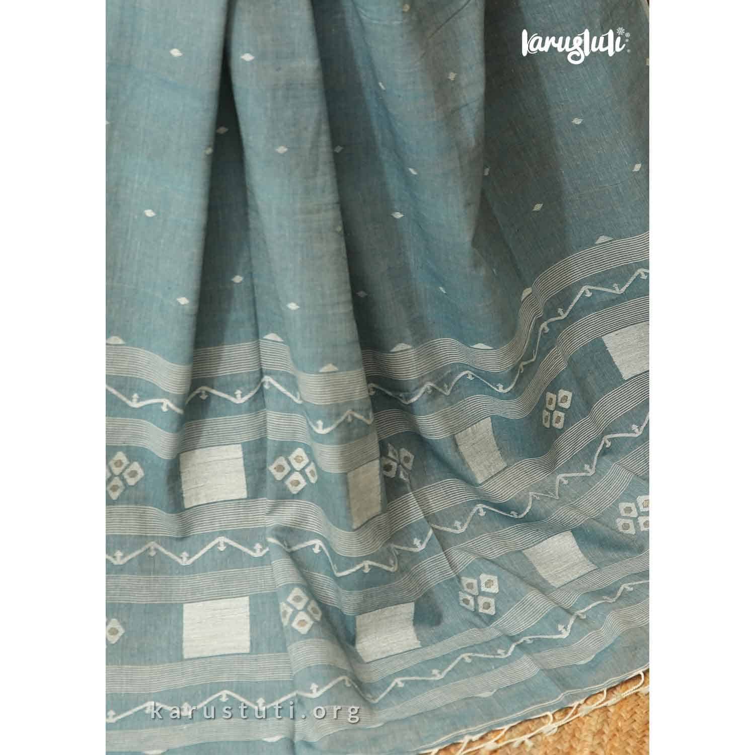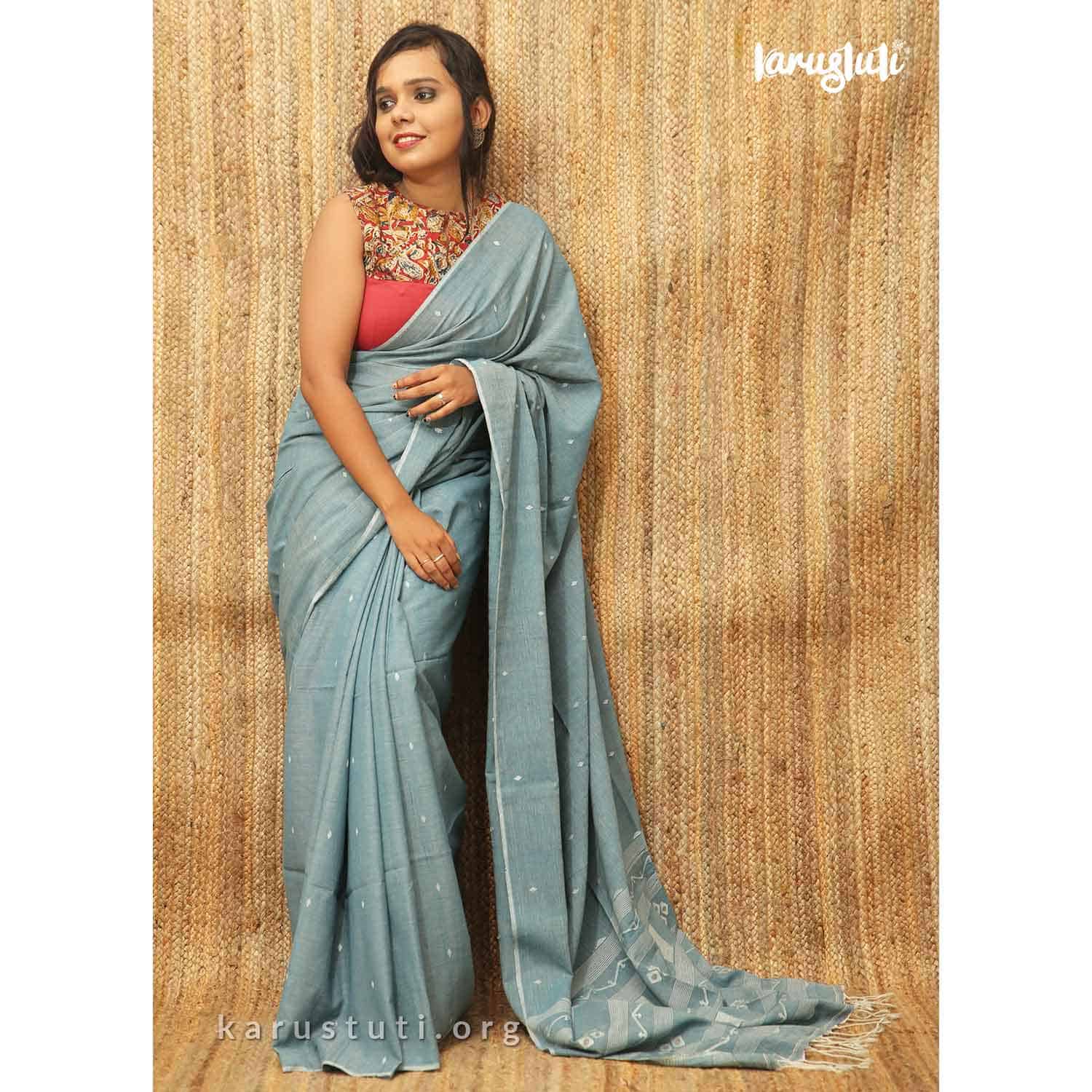 100 CNT fine muslin cotton hand jamdani with all over small buta weaving and geometric naksha jamdani in pallu. Very soft and elegant saree takes 7 to 9 days to complete. AZO and PCP free, non-allergic colour. Best for summertime. Starch not require.