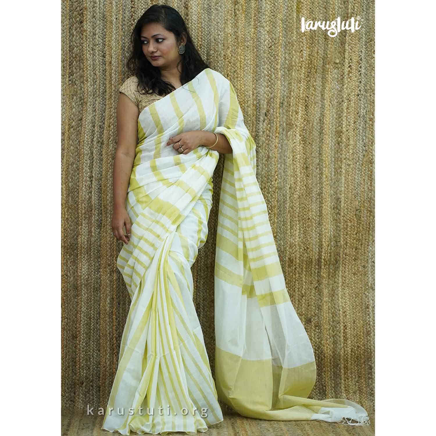 100 CNT cotton bright summer shade with vertical stripes, classy handloom soft cotton, nice fall. This saree takes 3 days to complete. AZO PCP free colour. Look special at any time, anywhere.