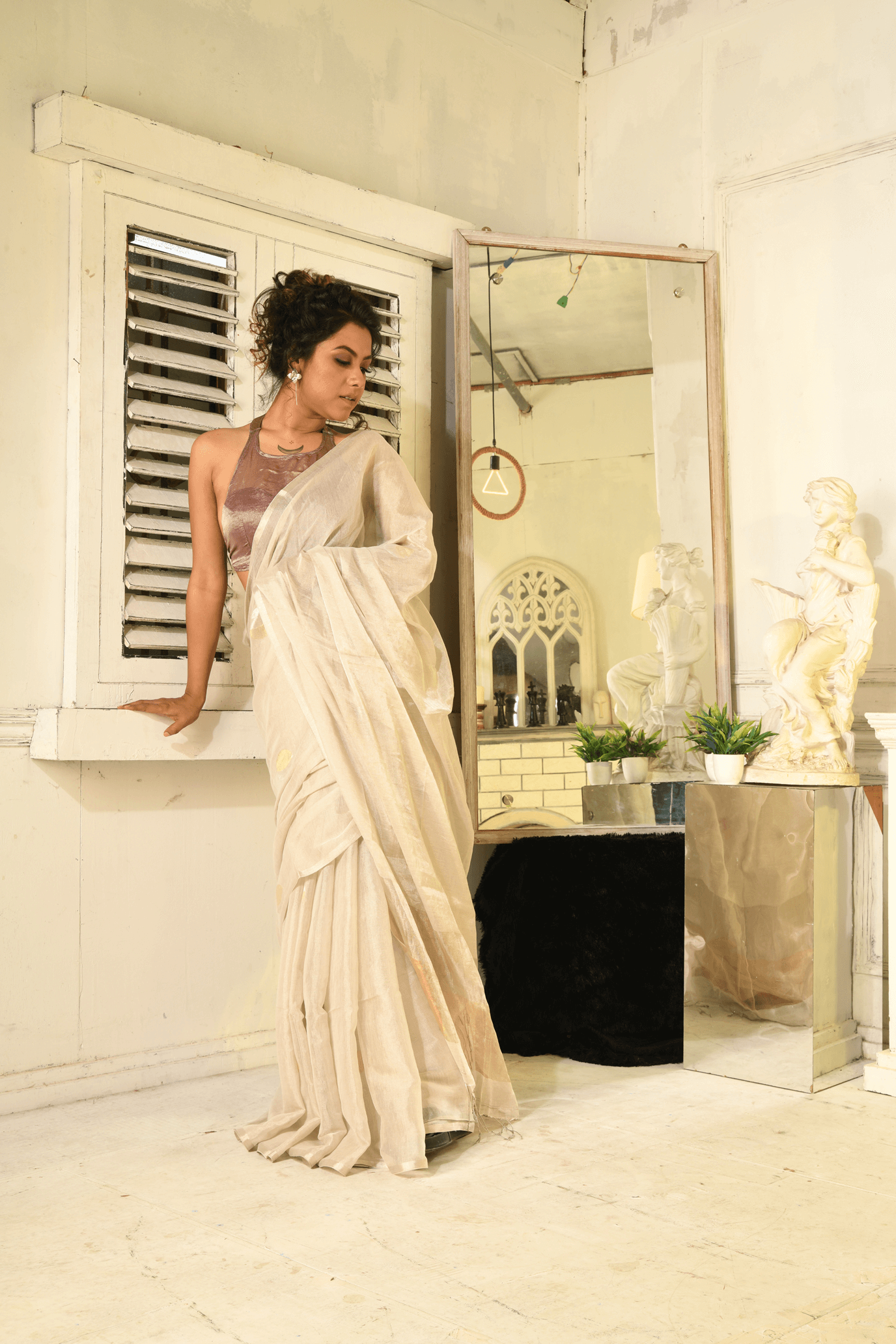 Made with a premium blend of metallic, tissue, cotton, and linen, this saree is lightweight yet luxurious, offering a subtle shimmer that catches the light beautifully. The metallic yarns are intricately woven into the Jamdani pattern, creating a mesmerizing texture that reflects both tradition and innovation.