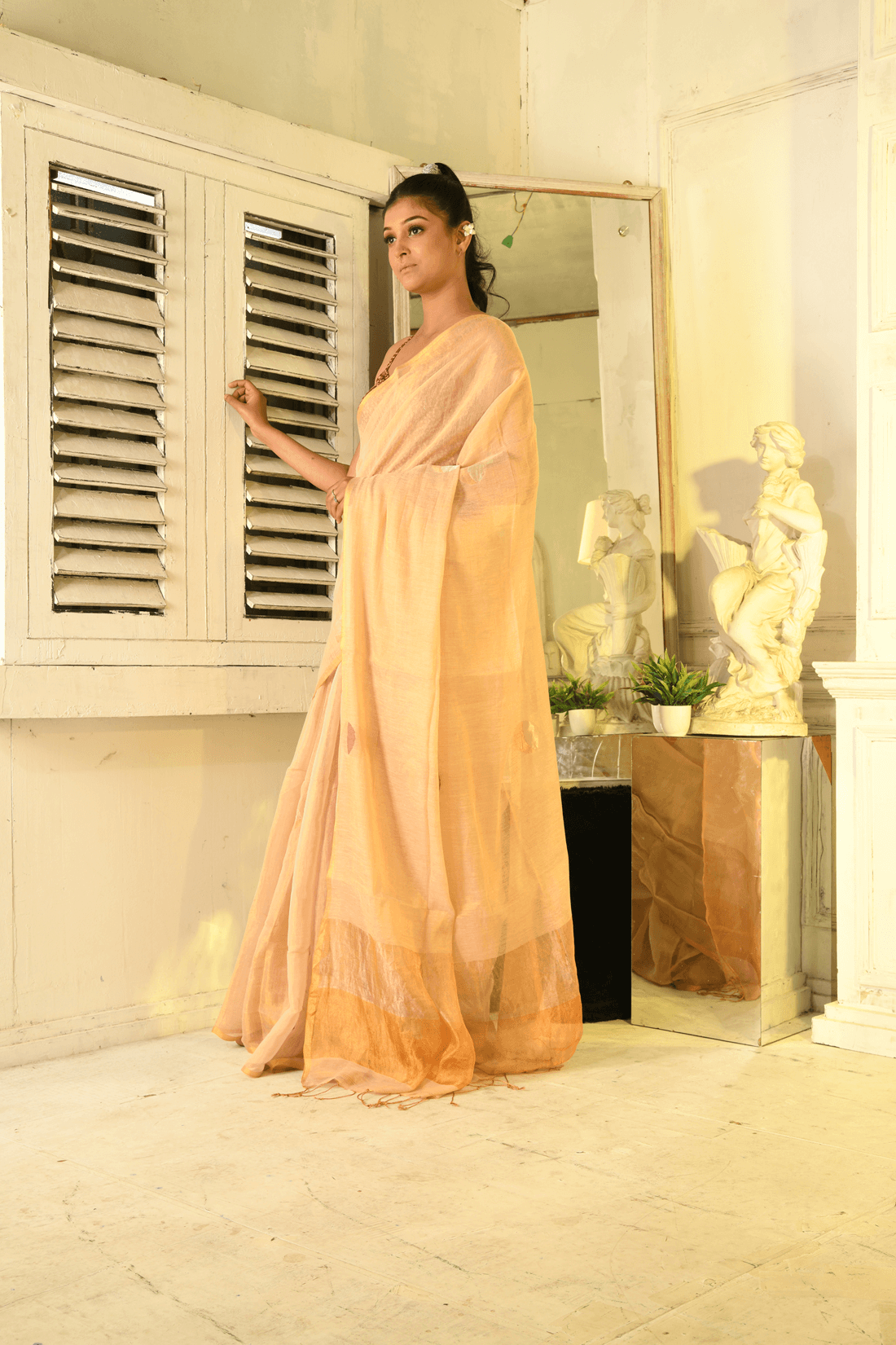 Crafted from a premium blend of metallic, tissue, cotton, and linen, this saree delivers a luxurious yet lightweight drape. The metallic yarns are intricately woven into the Jamdani design, creating a delicate shimmer that catches the light beautifully. The breathable cotton-linen base ensures all-day comfort, while the tissue element adds subtle texture and an elegant fall.