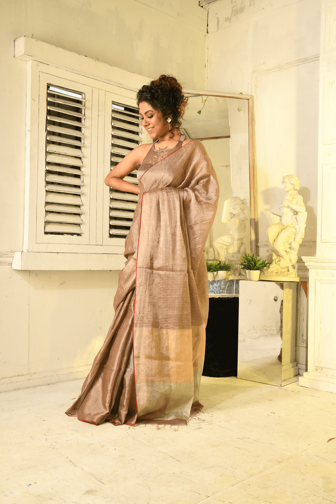 Metallic Handloom Saree | Handwoven Checks Metallic in Nude Beige