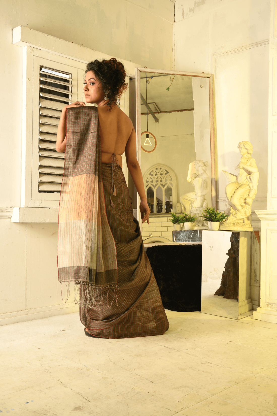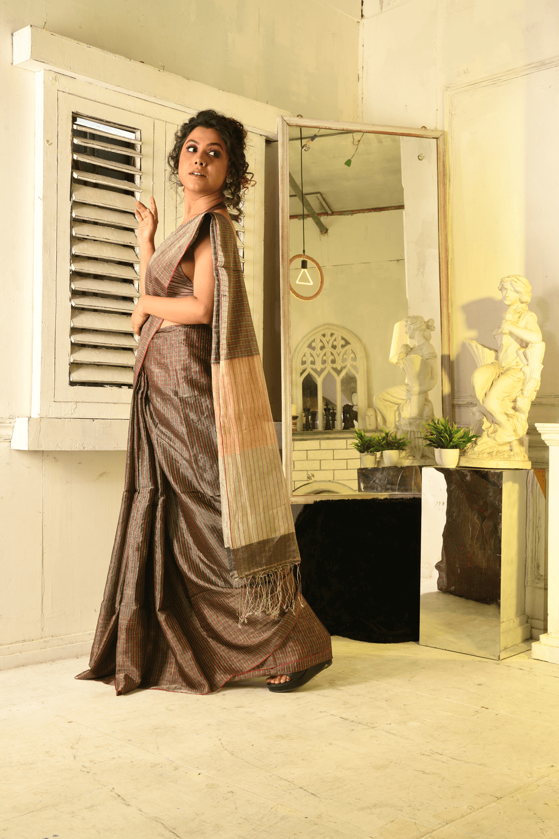 Handwoven metallic linen-cotton-tissue blend saree in elegant dark grey. Length 6.5m including 80cm blouse piece. Lightweight, breathable, luxurious drape. Care: gentle hand wash or dry clean. Brand: Karustuti.