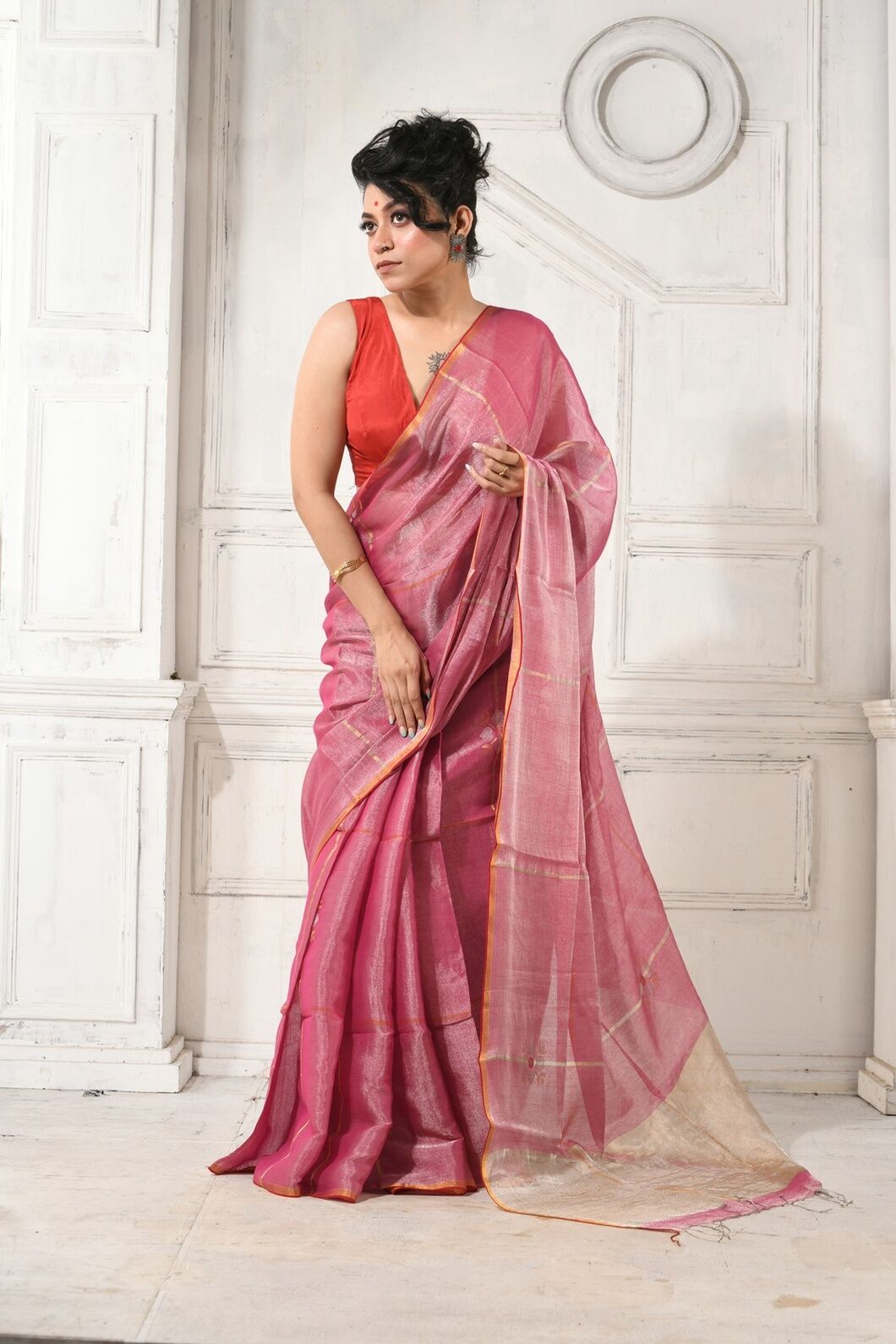 Pink & Silver Metallic Handloom Saree | Handwoven Jamdani Cotton Metallic