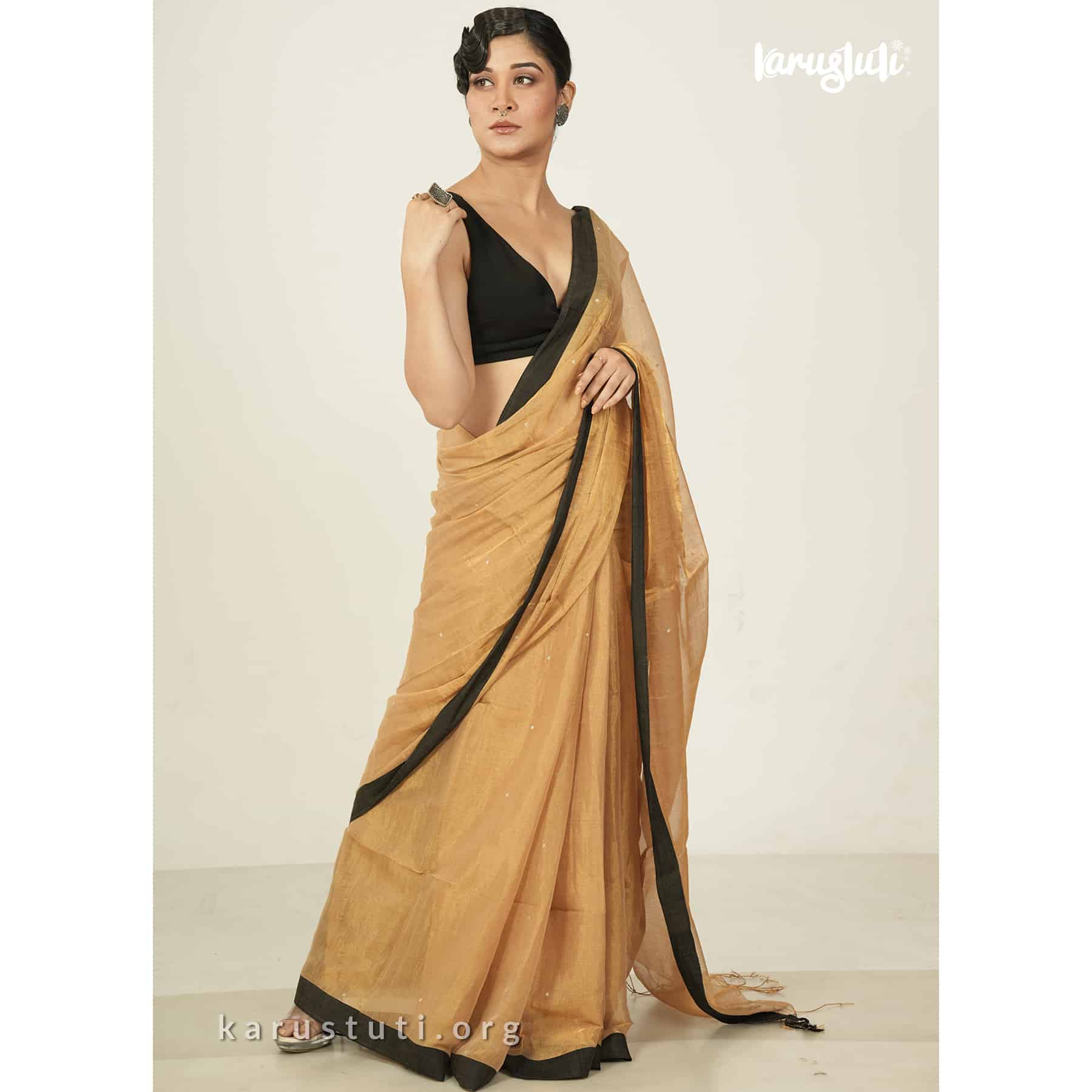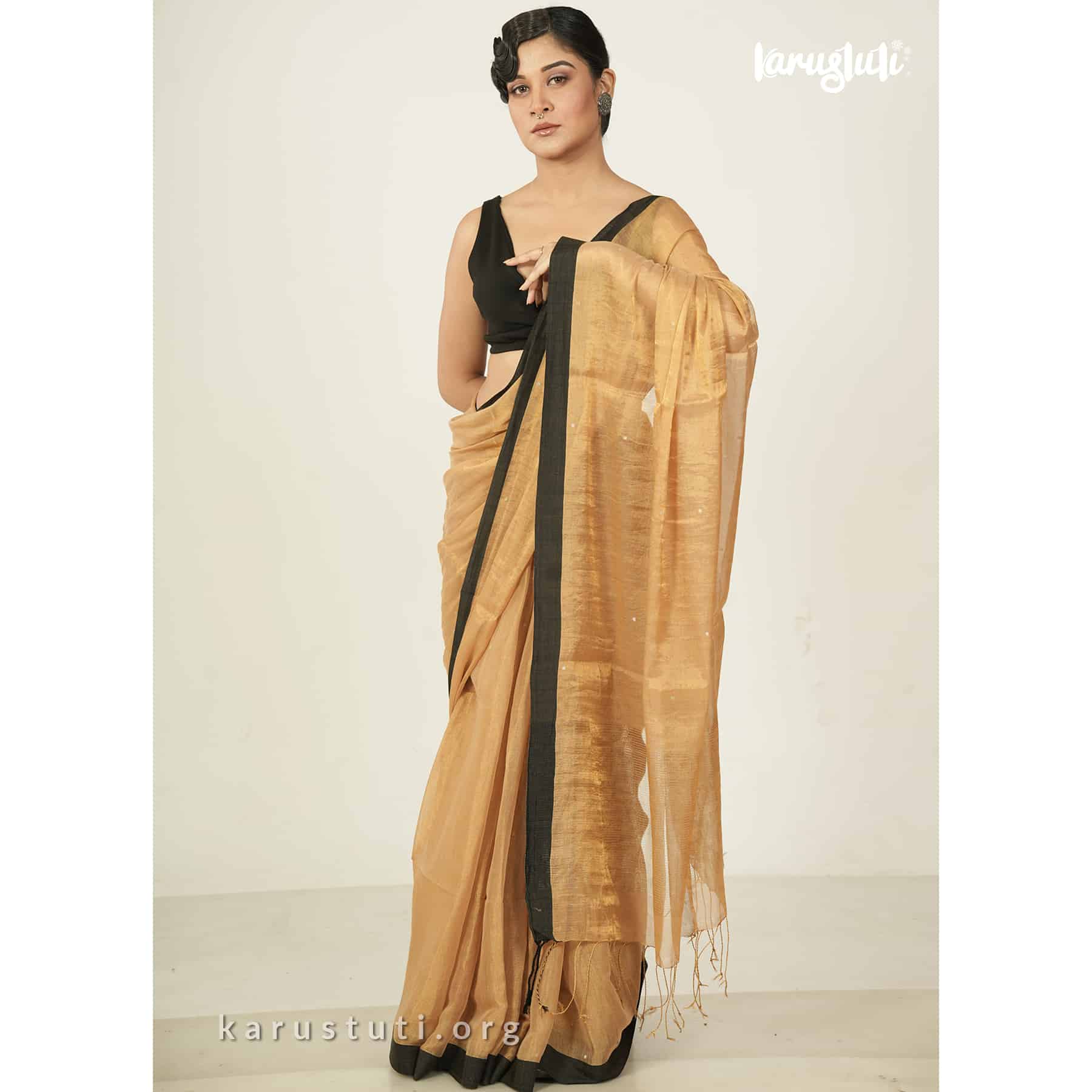 Introducing the epitome of elegance and luxury: the Melted Gold with Black Border Metallic Handloom Linen Saree from the prestigious brand Karustuti. This magnificent saree is a true work of art, crafted with meticulous attention to detail.