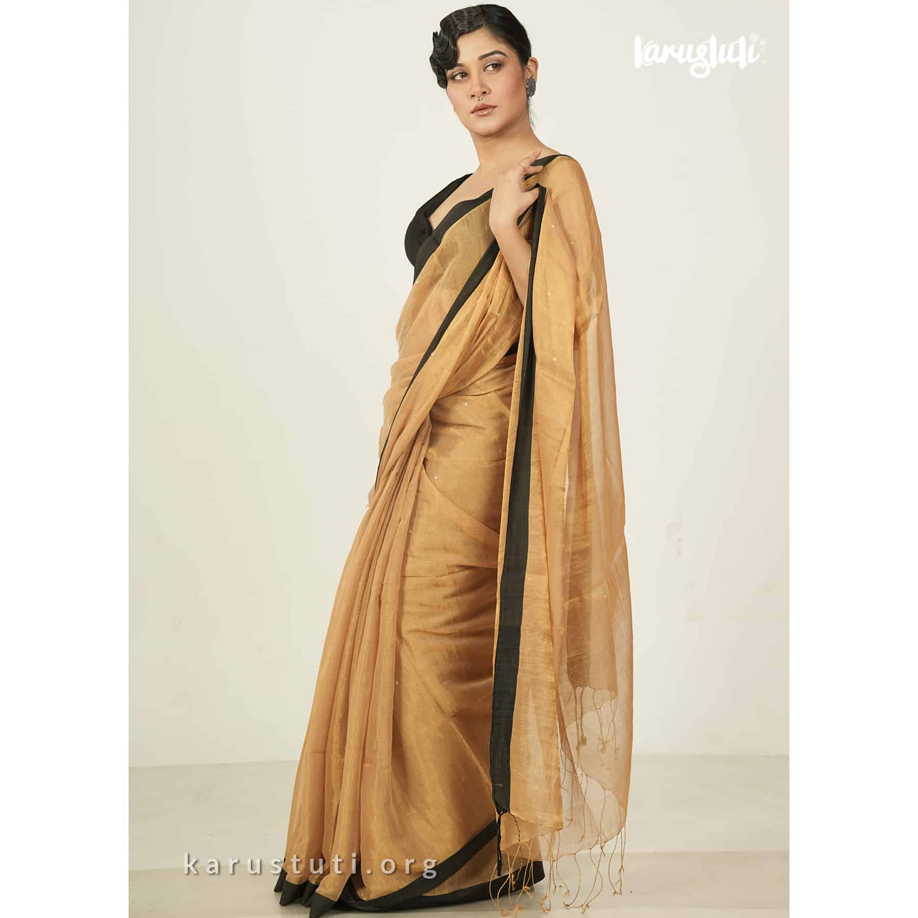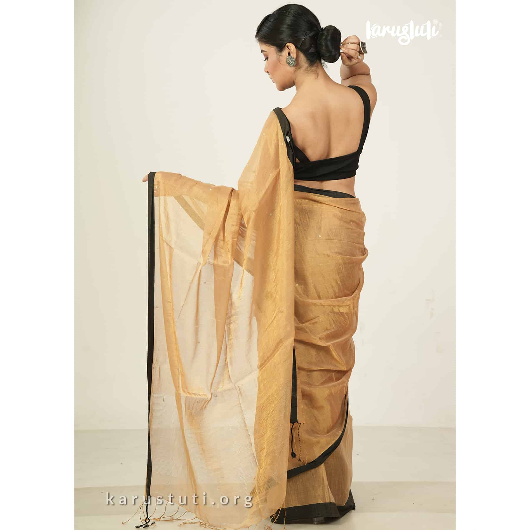 Elevate your style game with the Melted Gold with Black Border Metallic Handloom Linen Saree from Karustuti. Embrace sophistication and be prepared to make heads turn wherever you go. Step into a world where fashion meets artistry – order yours now!