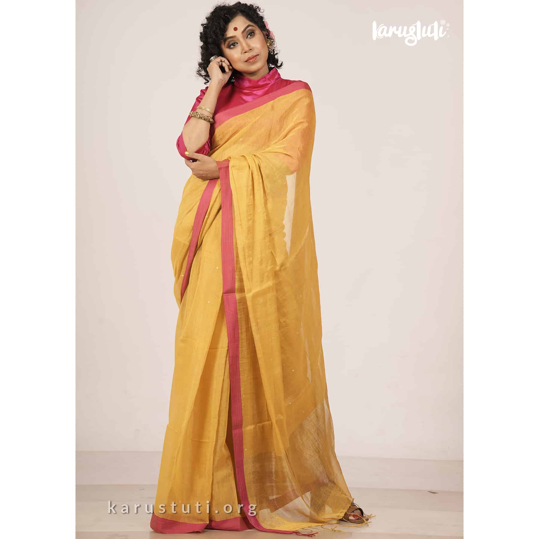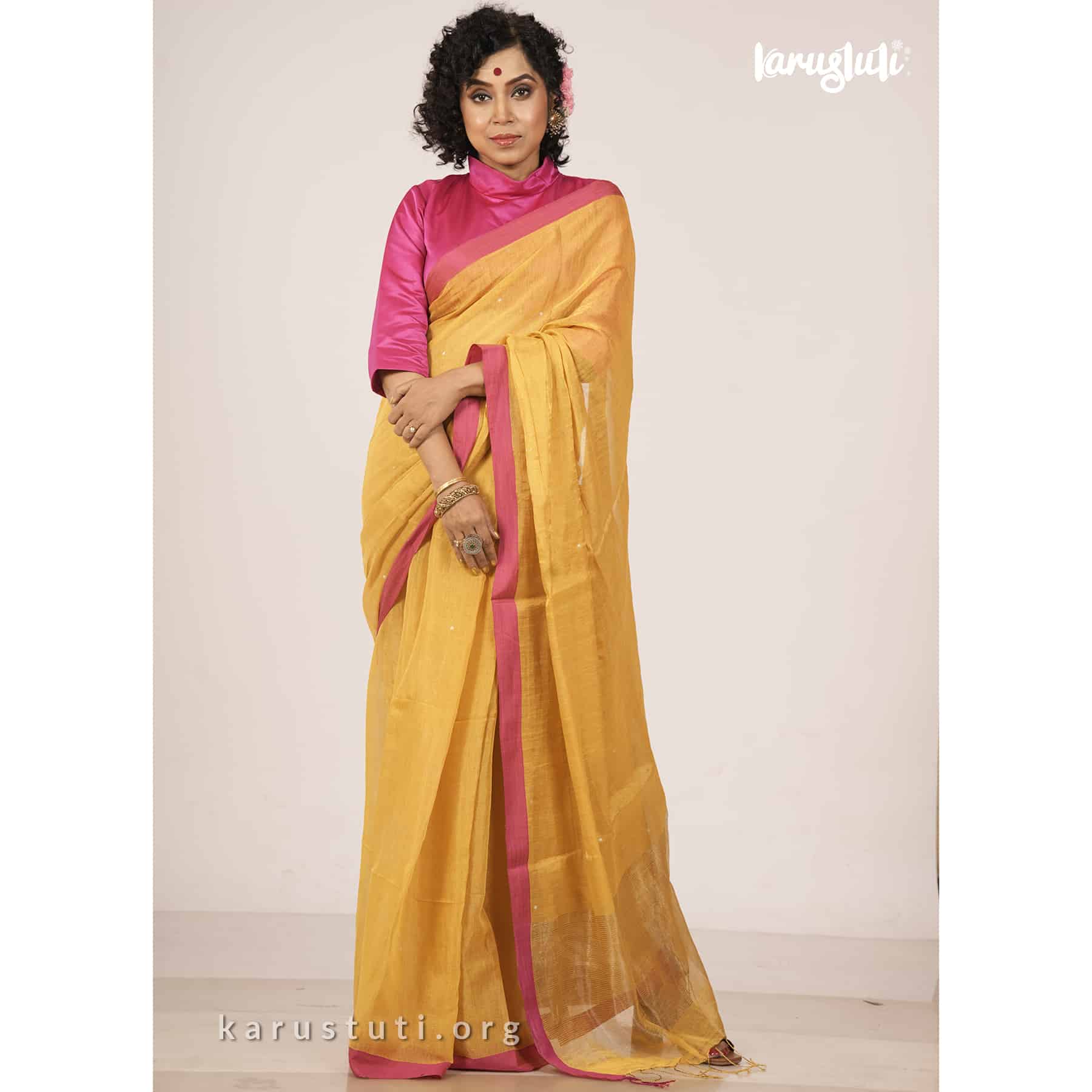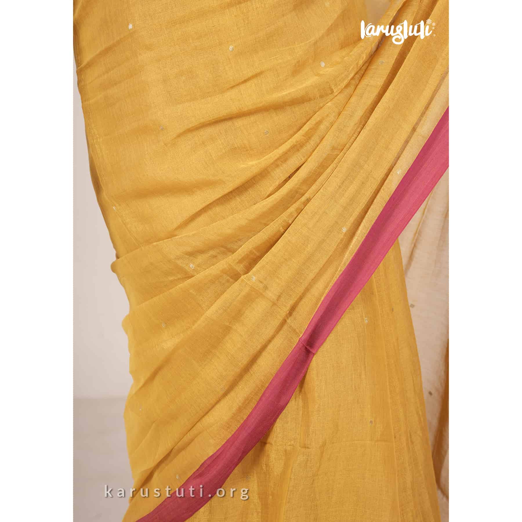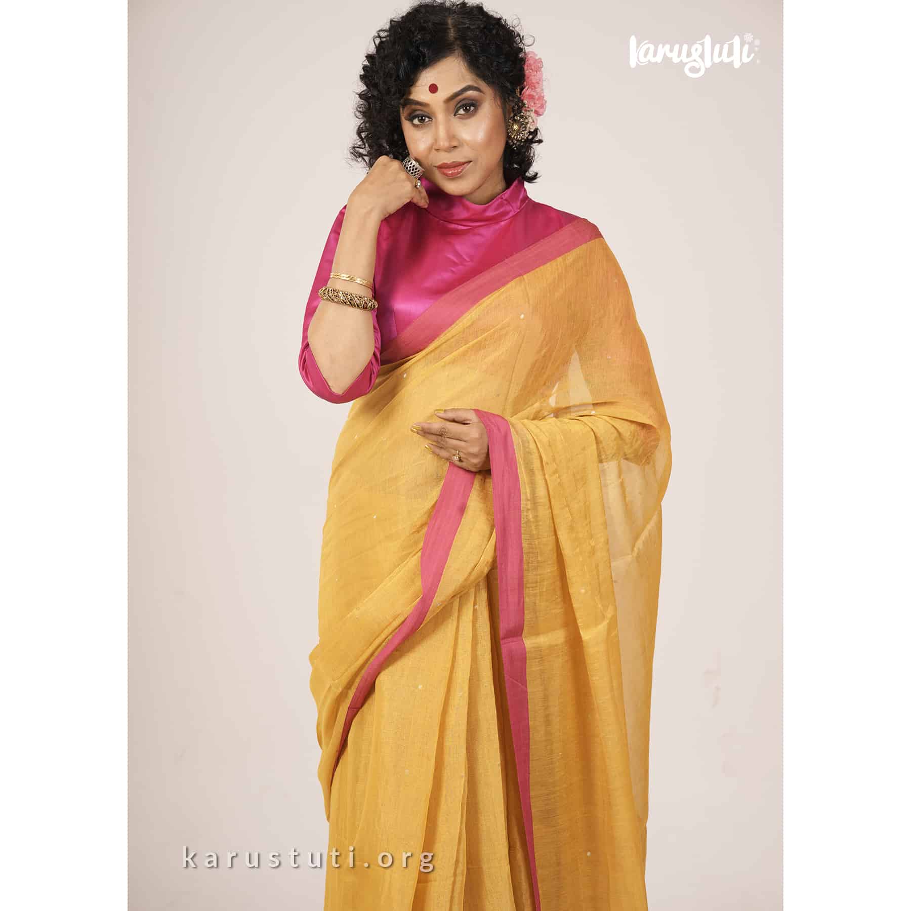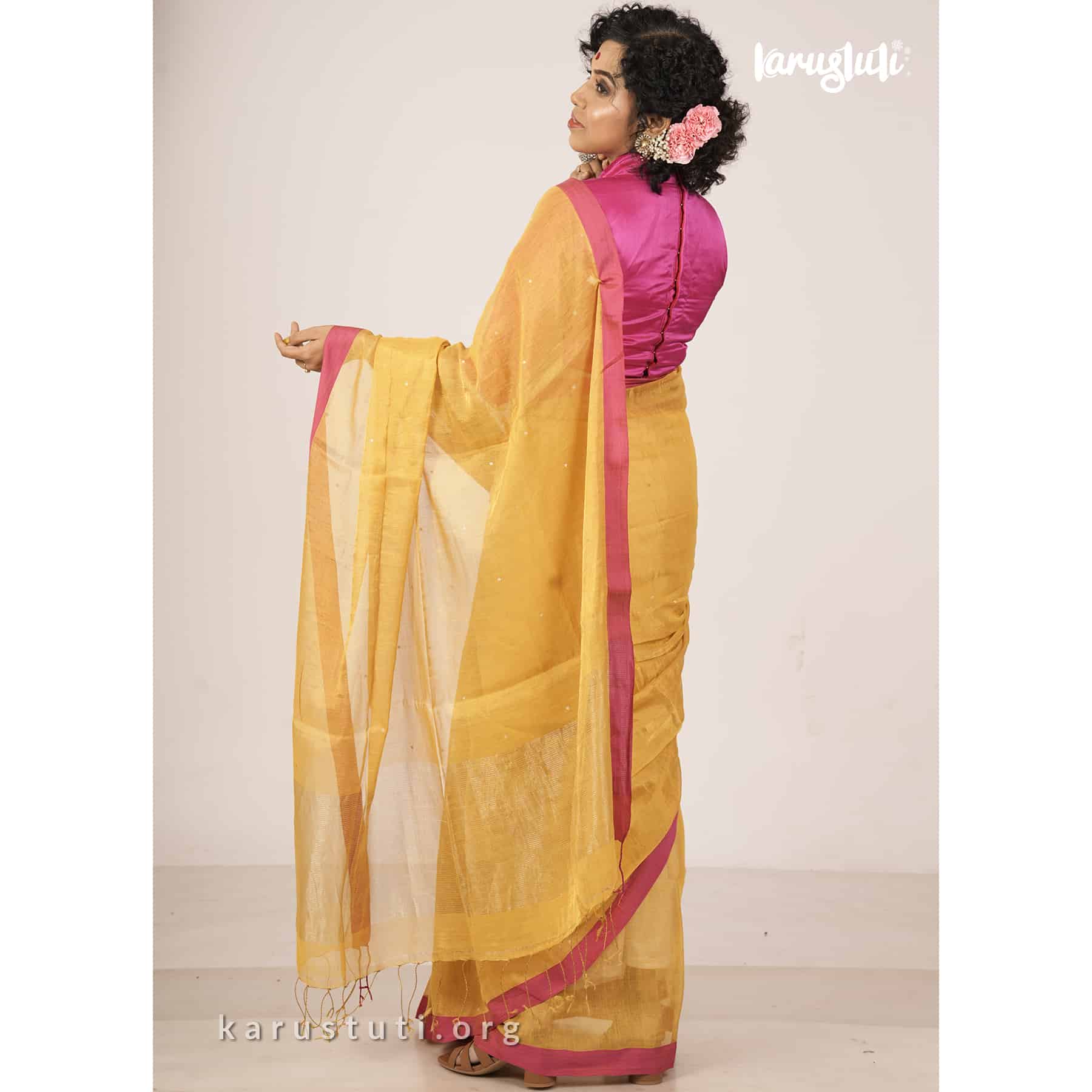 Metallic 6 yards with tested tissue in warps and weft has linen cotton blended weaving . feather soft , breathable metallic has all over buta and contrast silk border. this saree took 6 to 7 days to complete . AZO & PCP free color is best for all type of party and occasions .