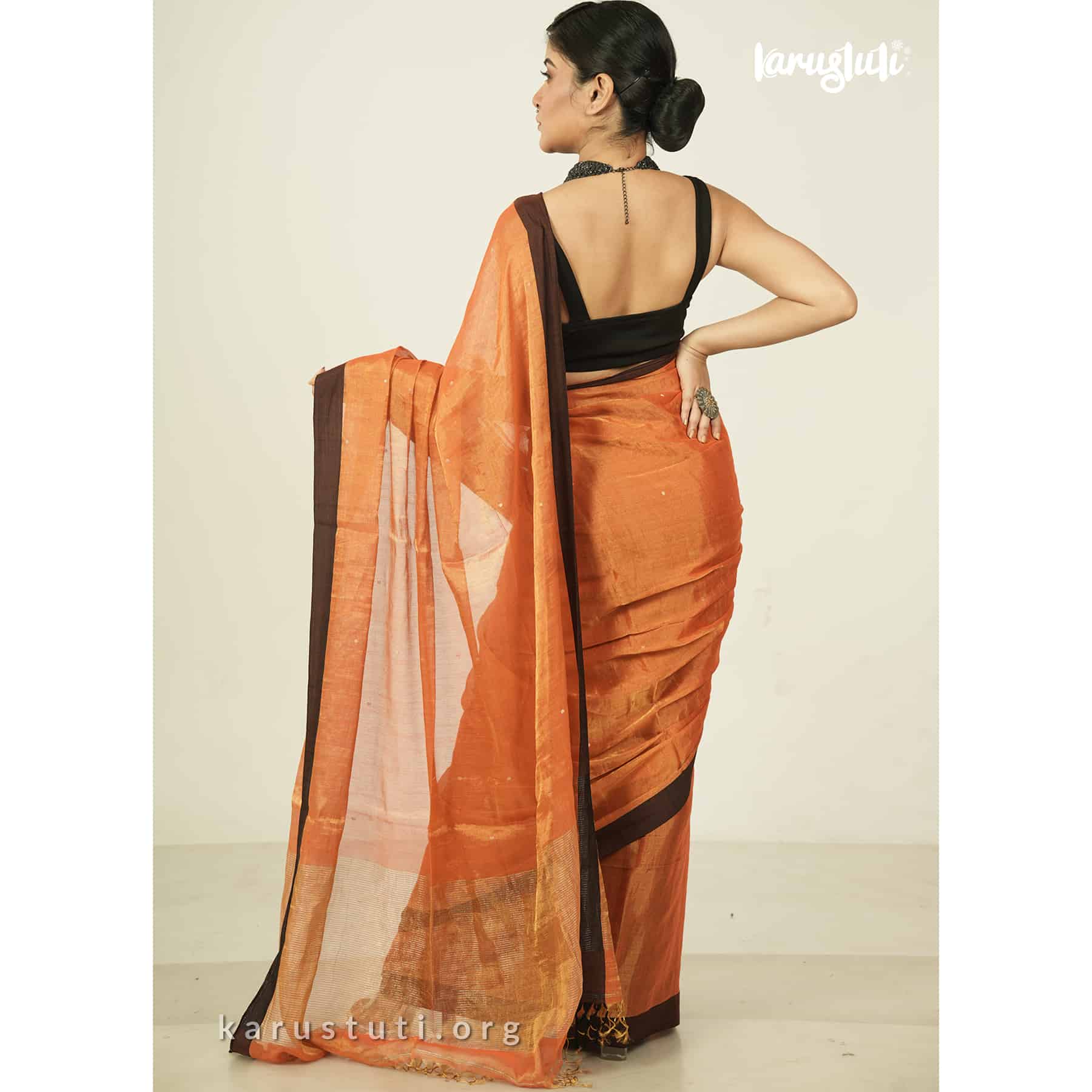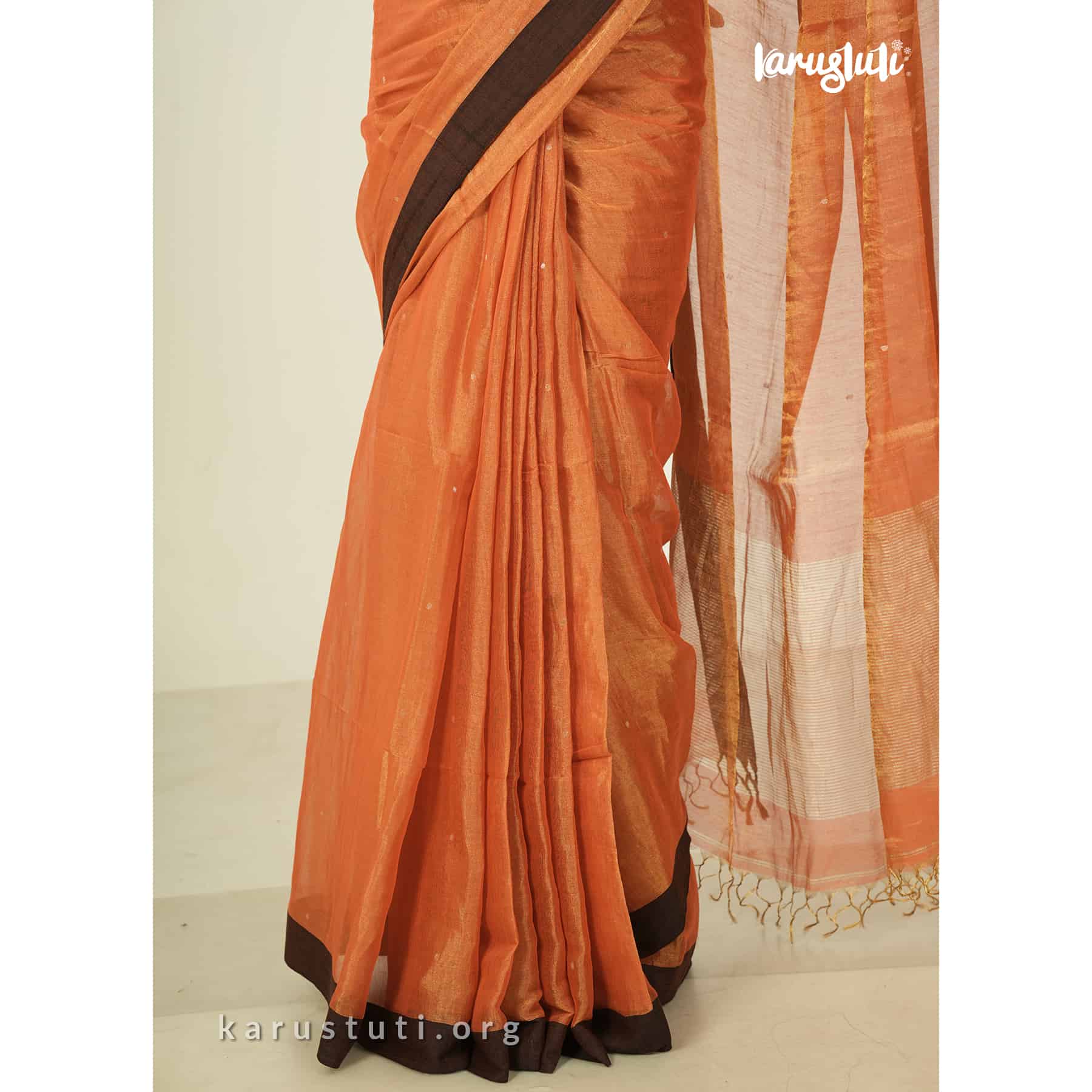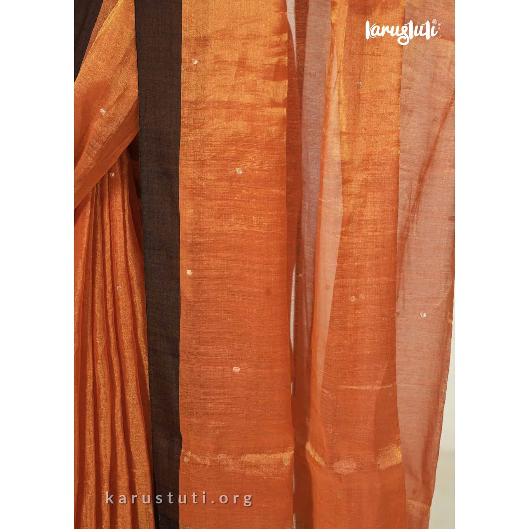 Metallic 6 yards with tested tissue in warps and weft has linen cotton blended weaving . feather soft , breathable metallic has all over buta and contrast silk border. this saree took 6 to 7 days to complete . AZO & PCP free color is best for all type of party and occasions .