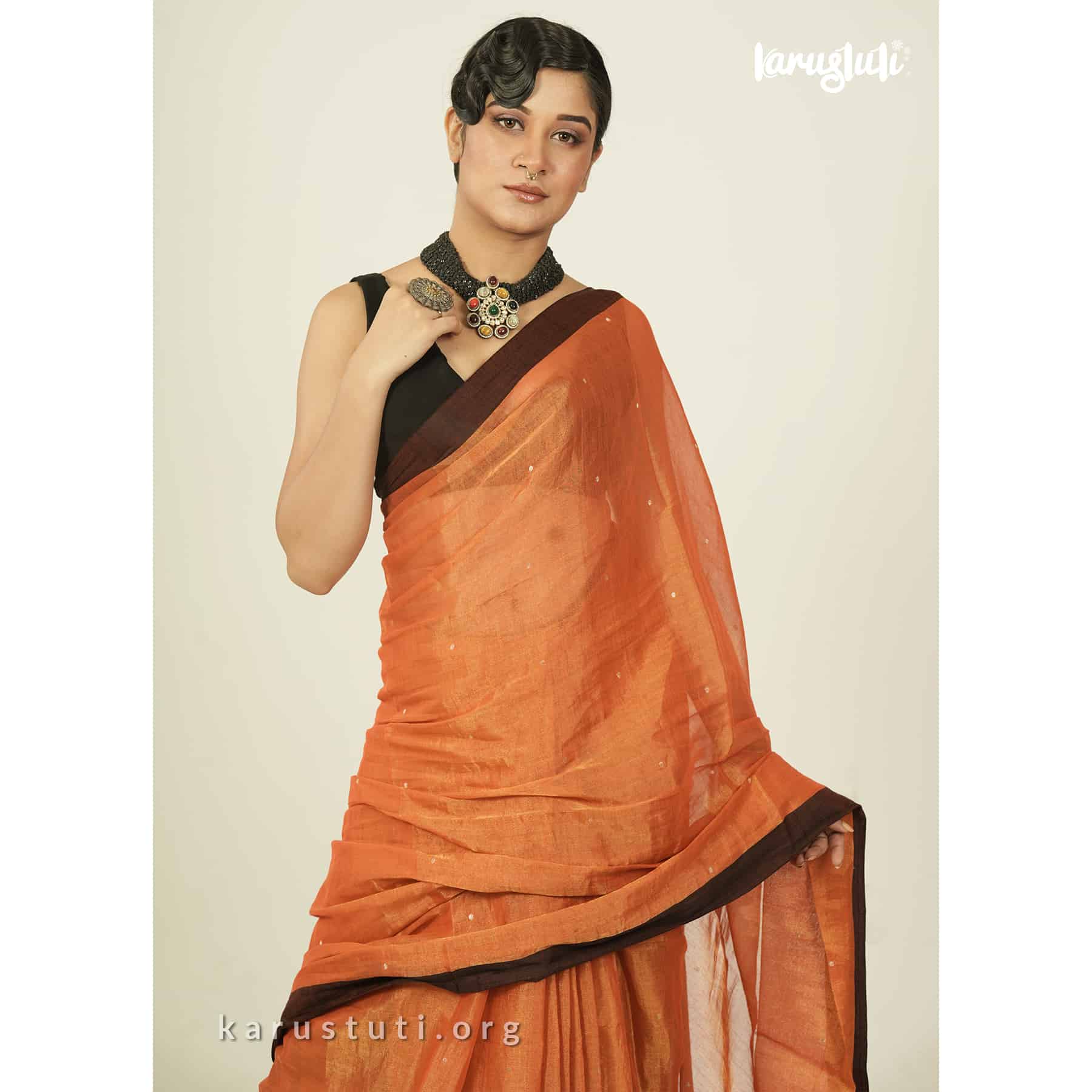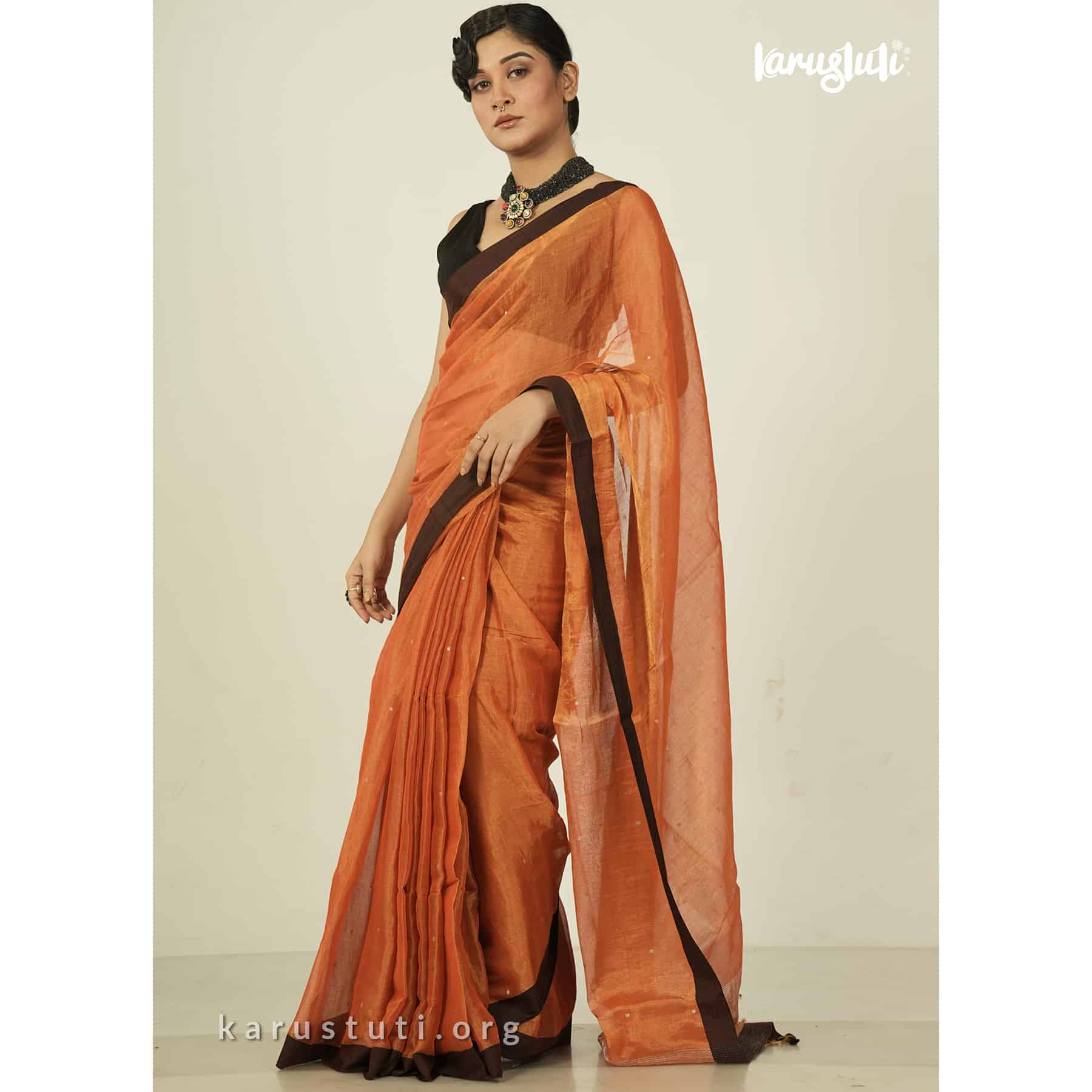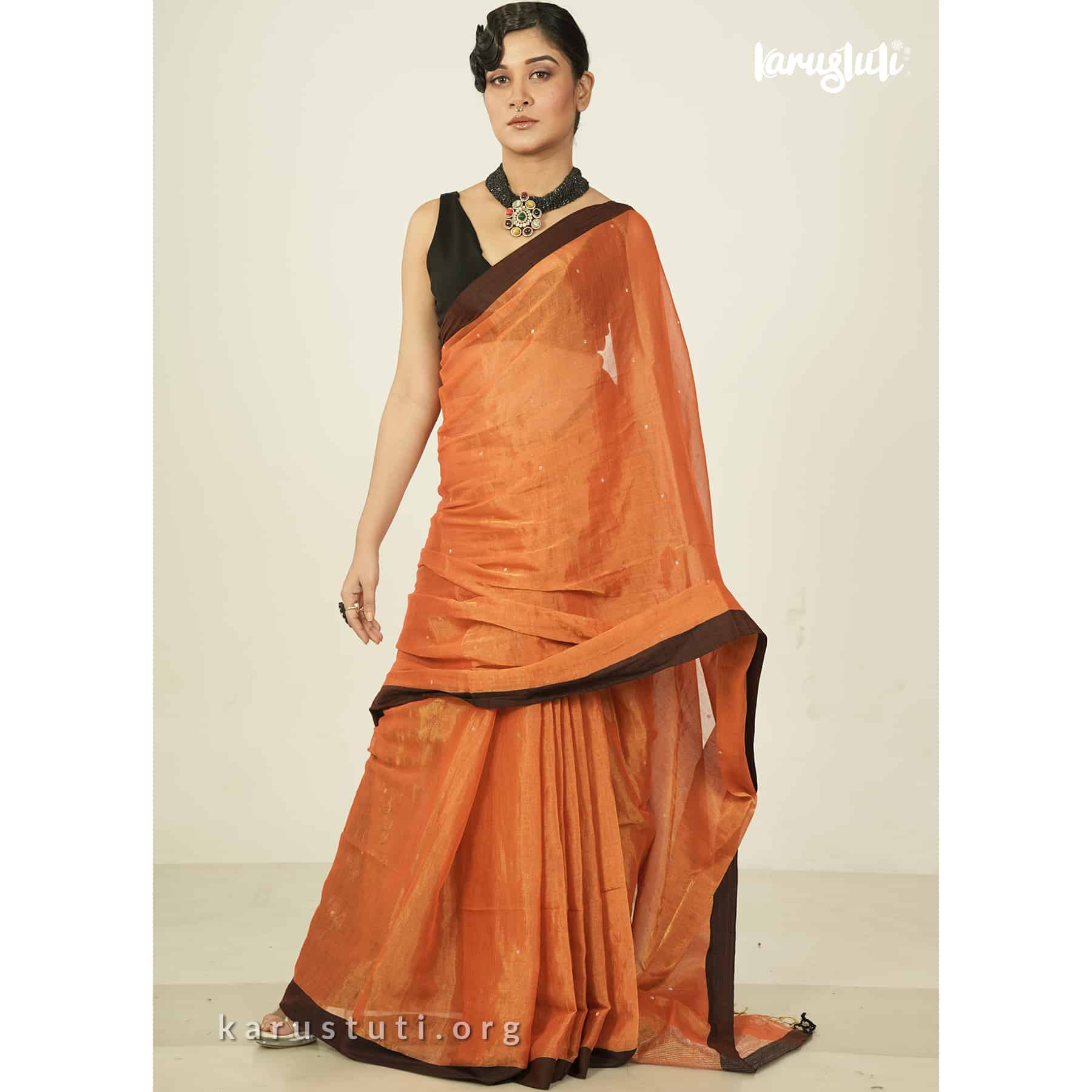 Metallic 6 yards with tested tissue in warps and weft has linen cotton blended weaving . feather soft , breathable metallic has all over buta and contrast silk border. this saree took 6 to 7 days to complete . AZO & PCP free color is best for all type of party and occasions .