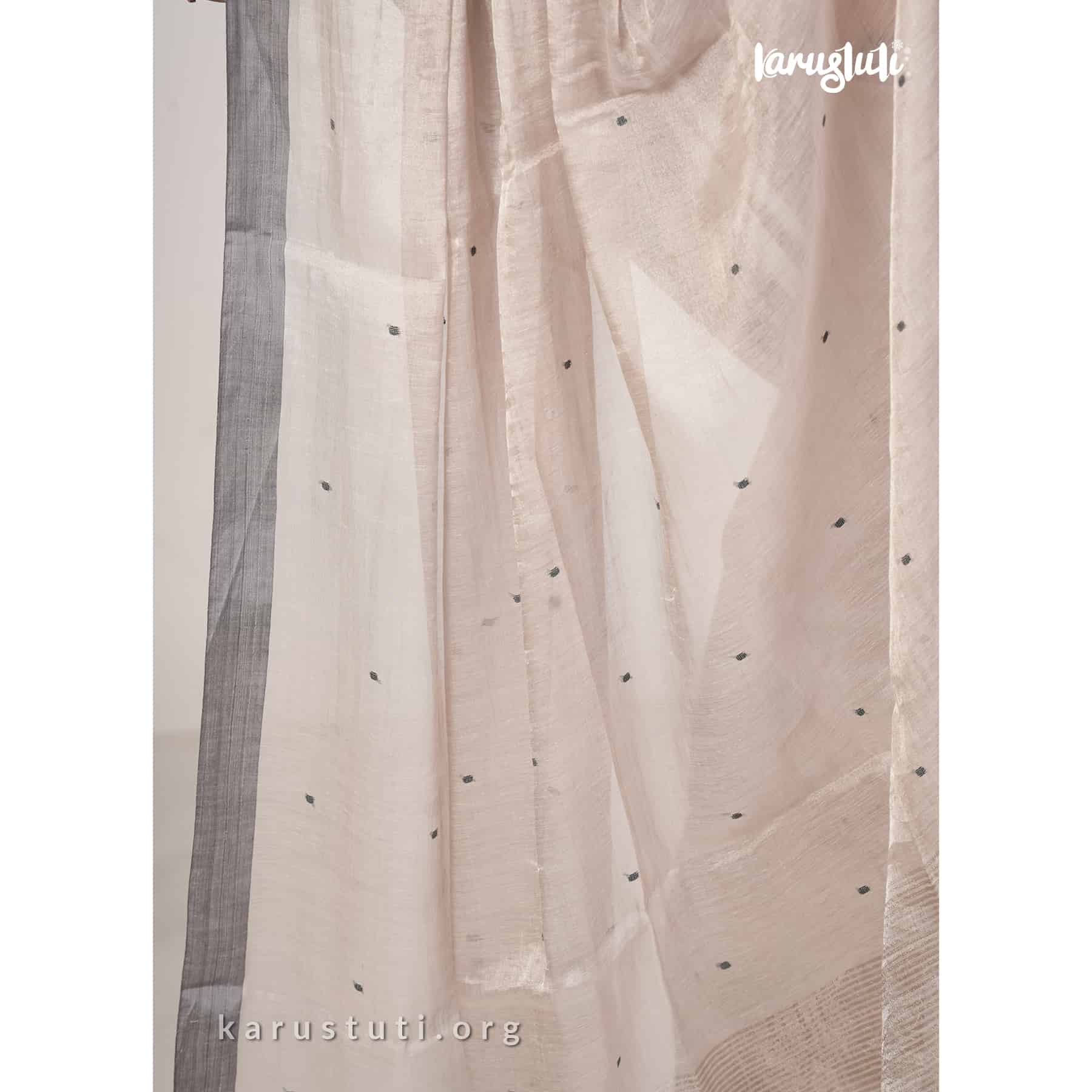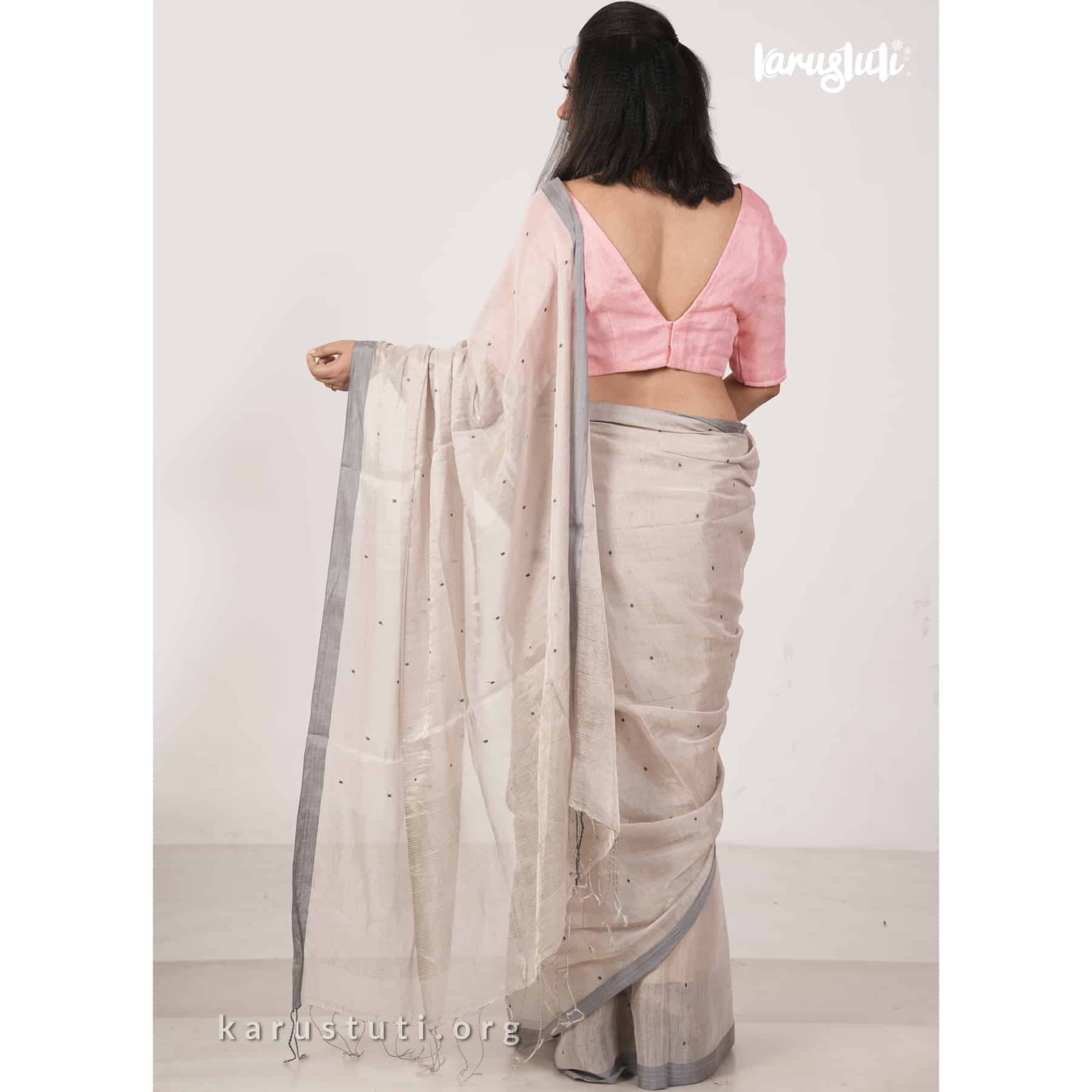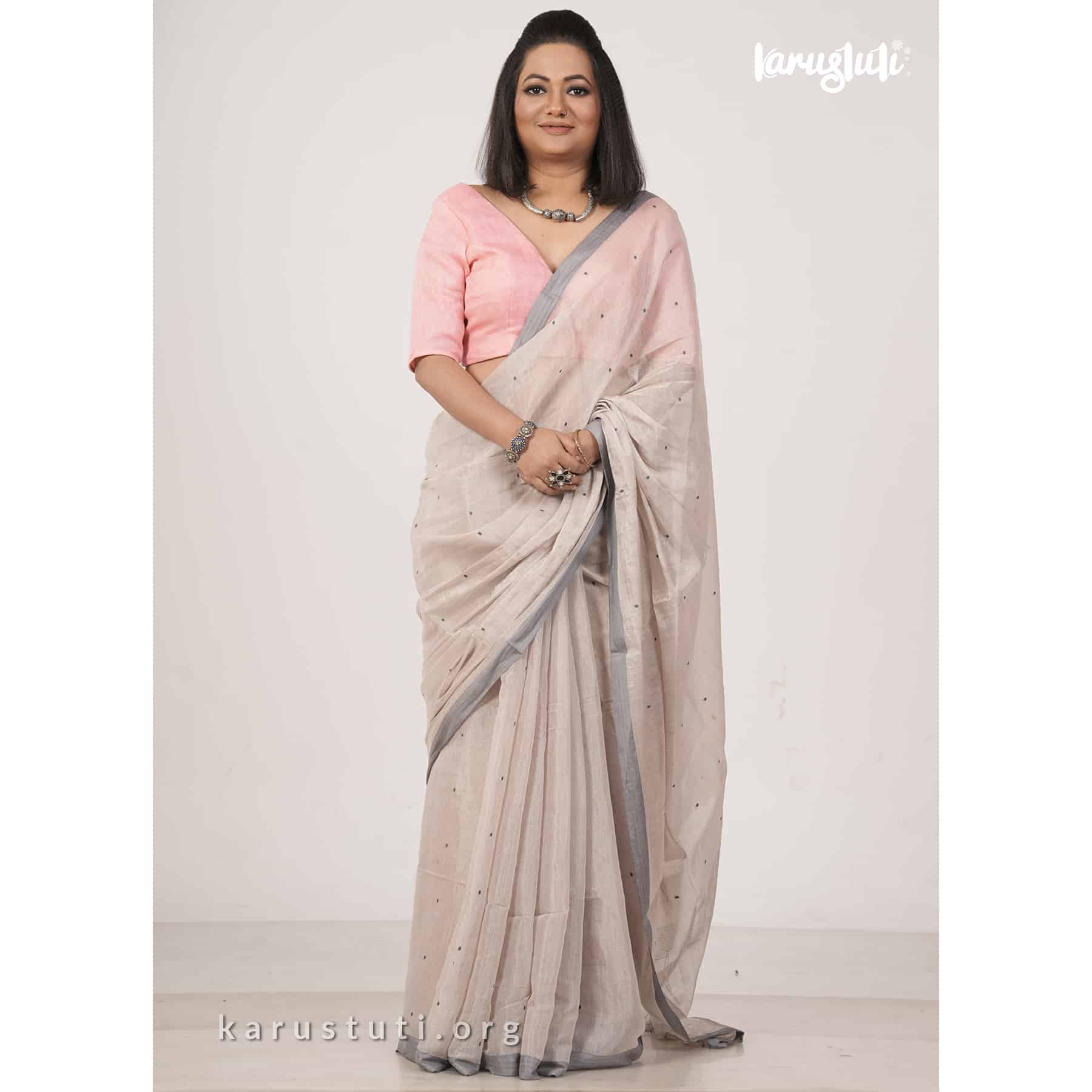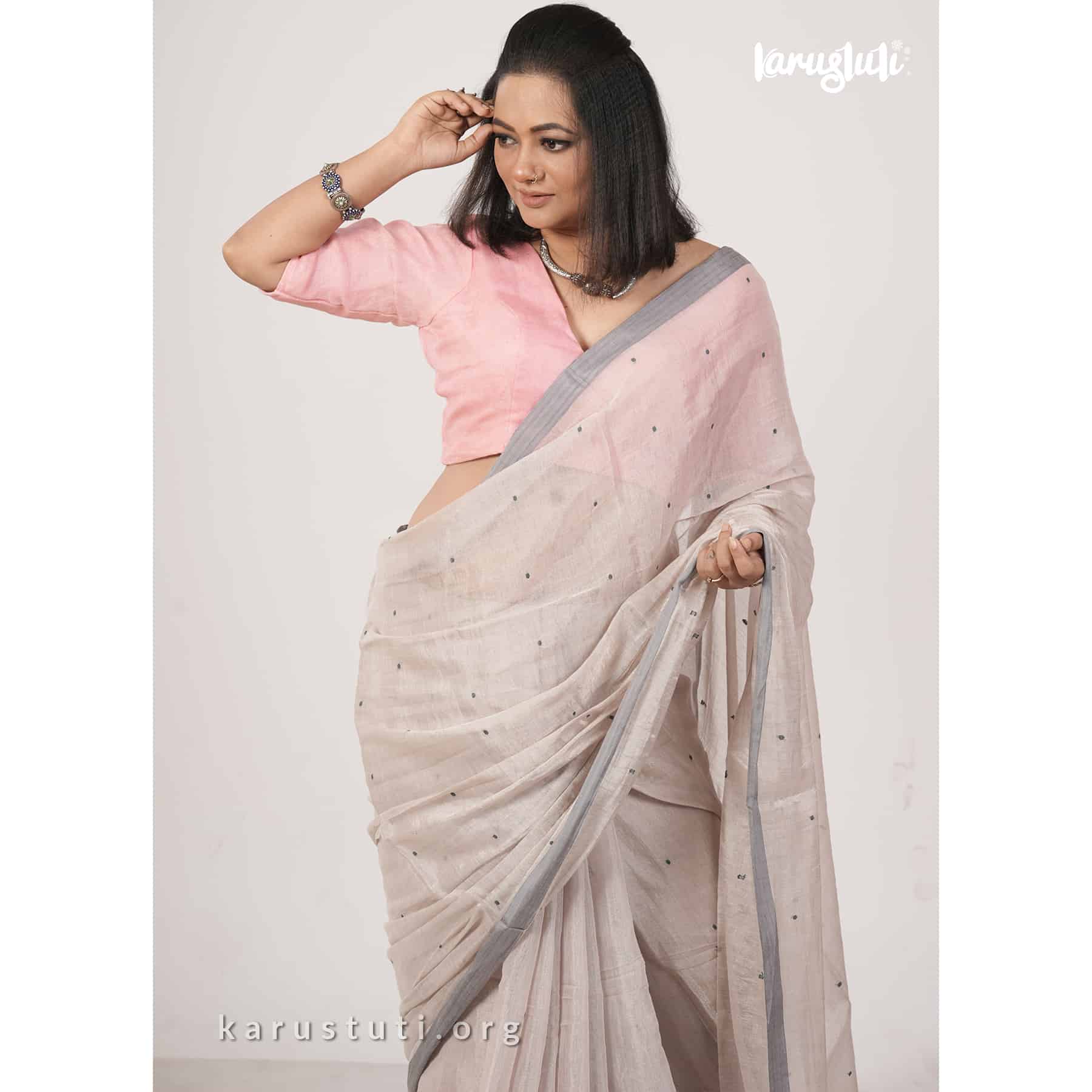 Metallic 6 yards with tested tissue in warps and weft has linen cotton blended weaving . feather soft , breathable metallic has all over buta and contrast silk border. this saree took 6 to 7 days to complete . AZO & PCP free color is best for all type of party and occasions .